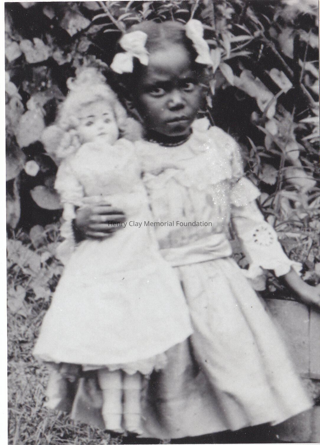 A little girl holding a doll. Both wearing light colored dresses.