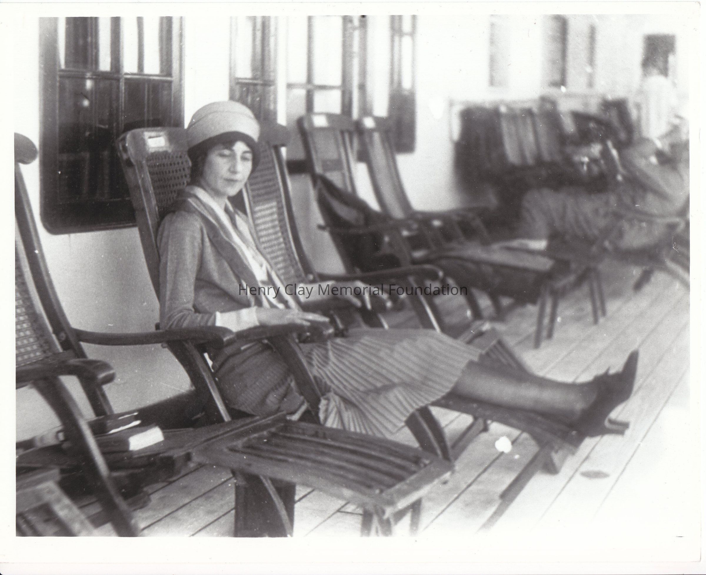 Copy of a photograph of Susan Clay Sawitzky taken in 1928 on board of a ship. She is laying on a chaise lounge on the deck, she is wearing a pleated skirt, dark light stocking, dark shoes, a cardigan, a foulard and a hat. Next to her on a chaise lounge two books. In the background a men, and other chaise lounges.