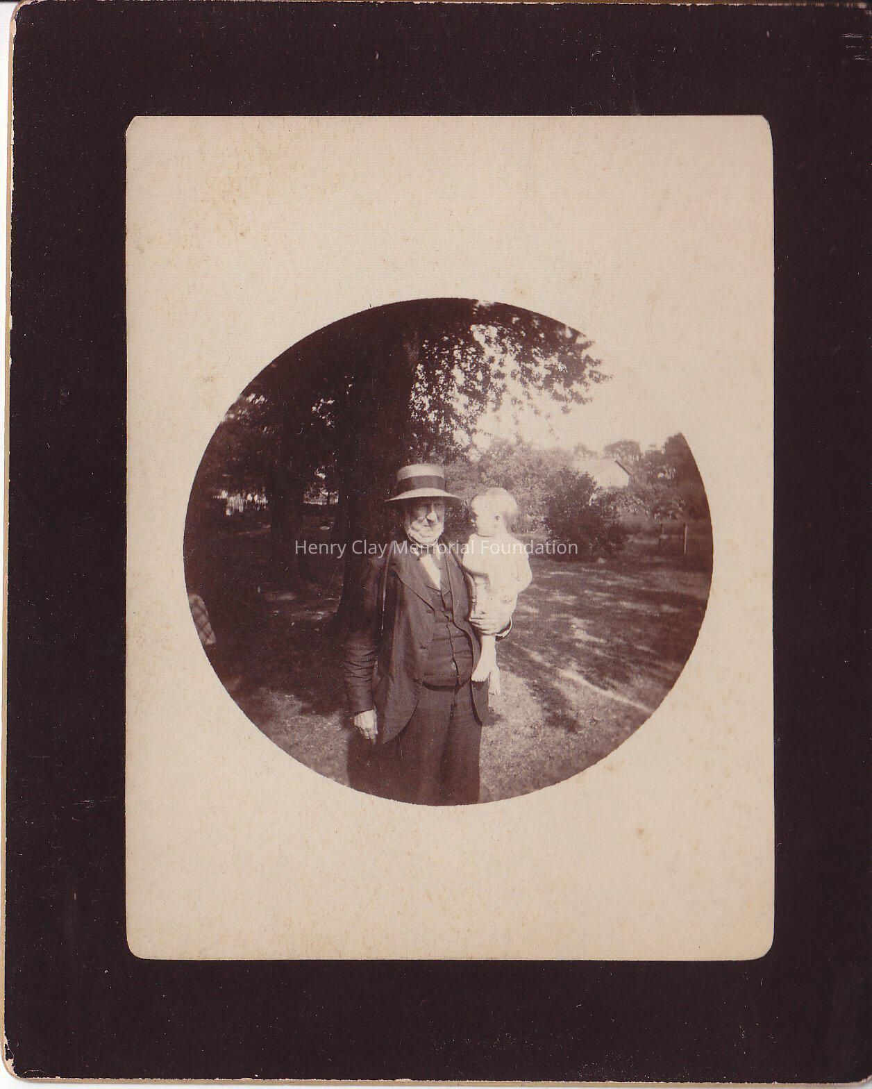A black and white photograph of a man holding a child outside.