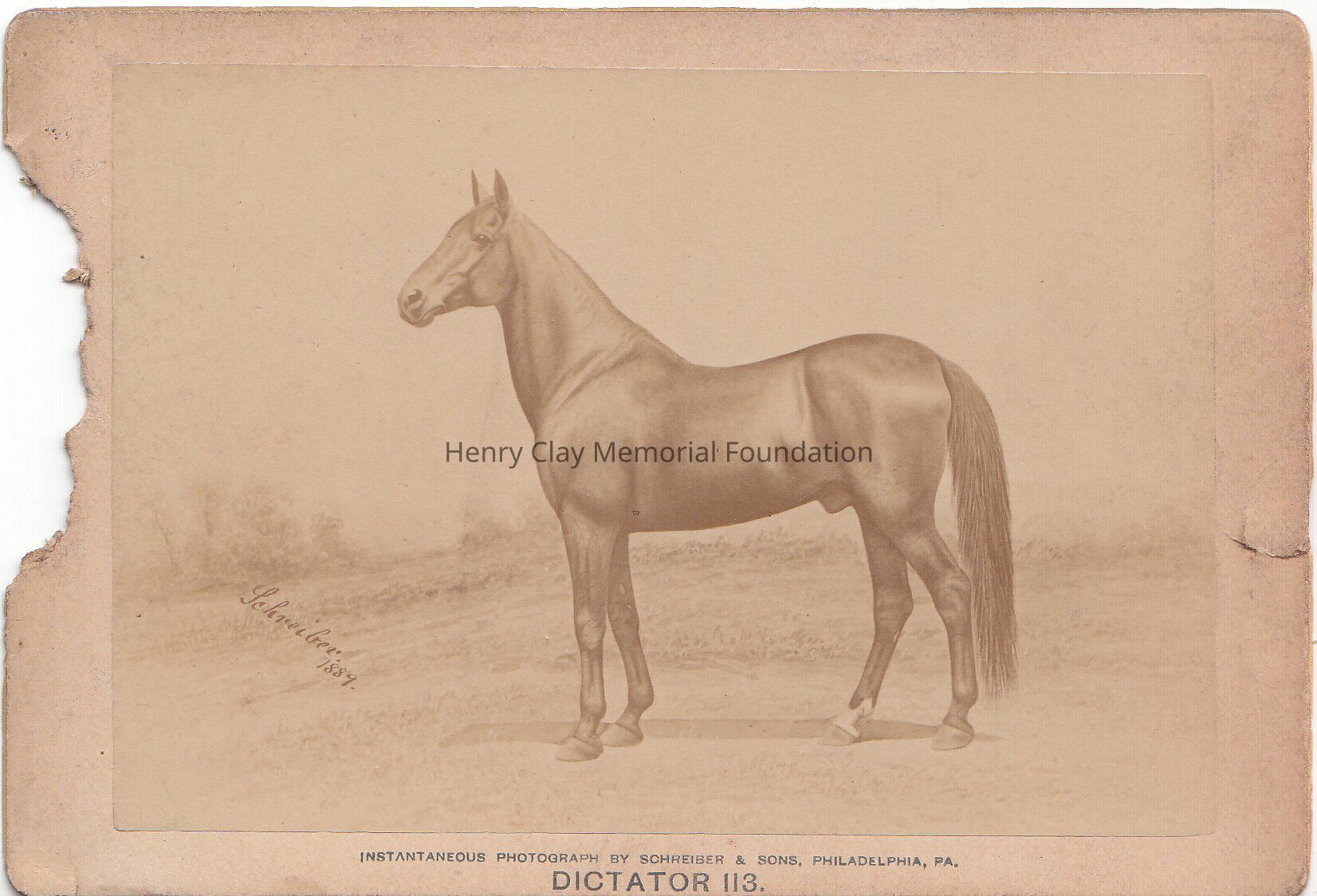 A seppia photograph of a horse, Dictator. Underneath the photograph " Instantaneous Photograph by Schreiber & Sons, Philadelphia, PA. Dictator 113"