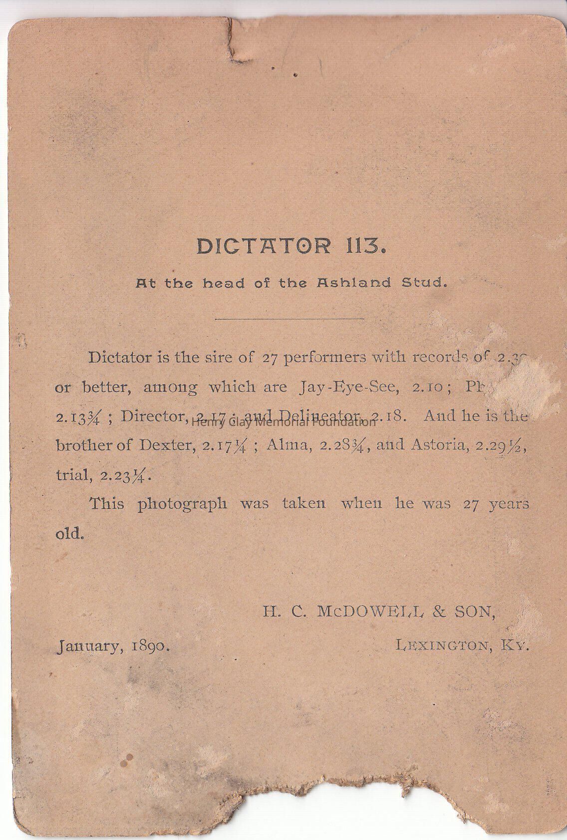 In the rear a description of Dictator 113, from January 1890 bearing the name of Henry Clay McDowell & Sons.Dimensions