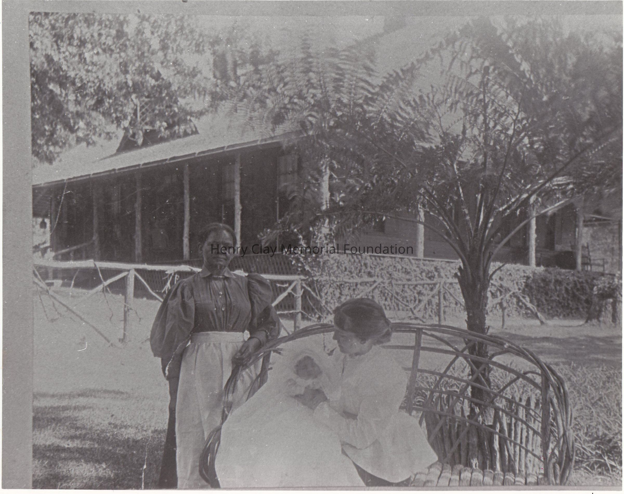 Copy of a black and white photograph depicting Susan Clay in the arms of her mother Ria (Mariah) Clay, and servant Mary Jackson in front of "The Cliffs".Dimensions