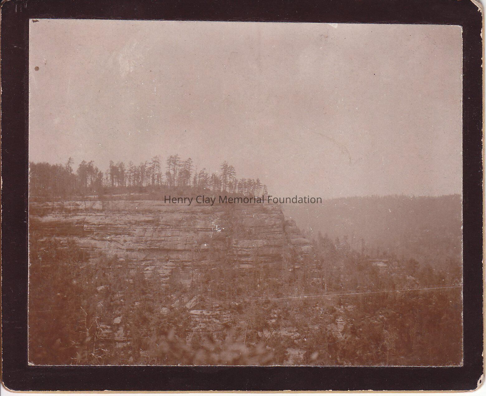 A black and white photograph of a cliff, a small road and trees.