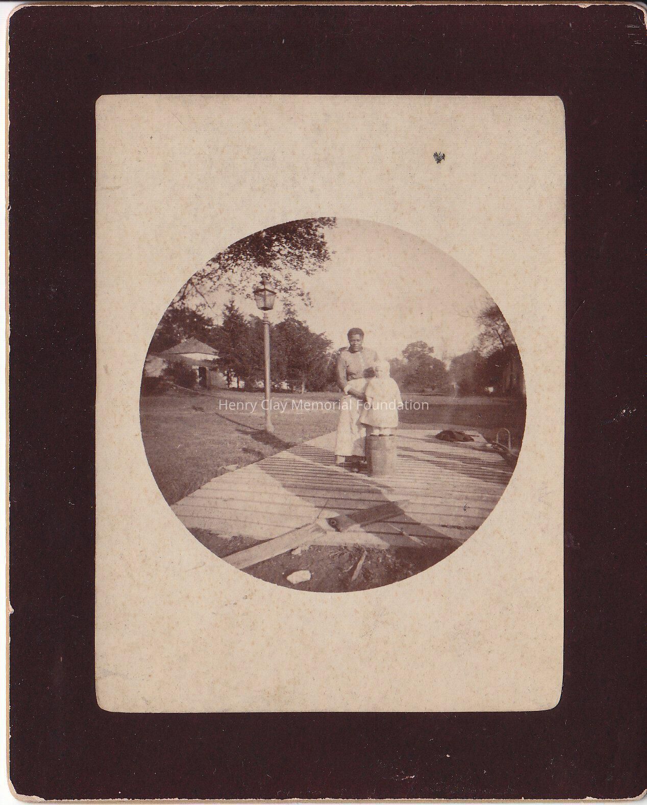 A black and white photograph of a woman and a small child.