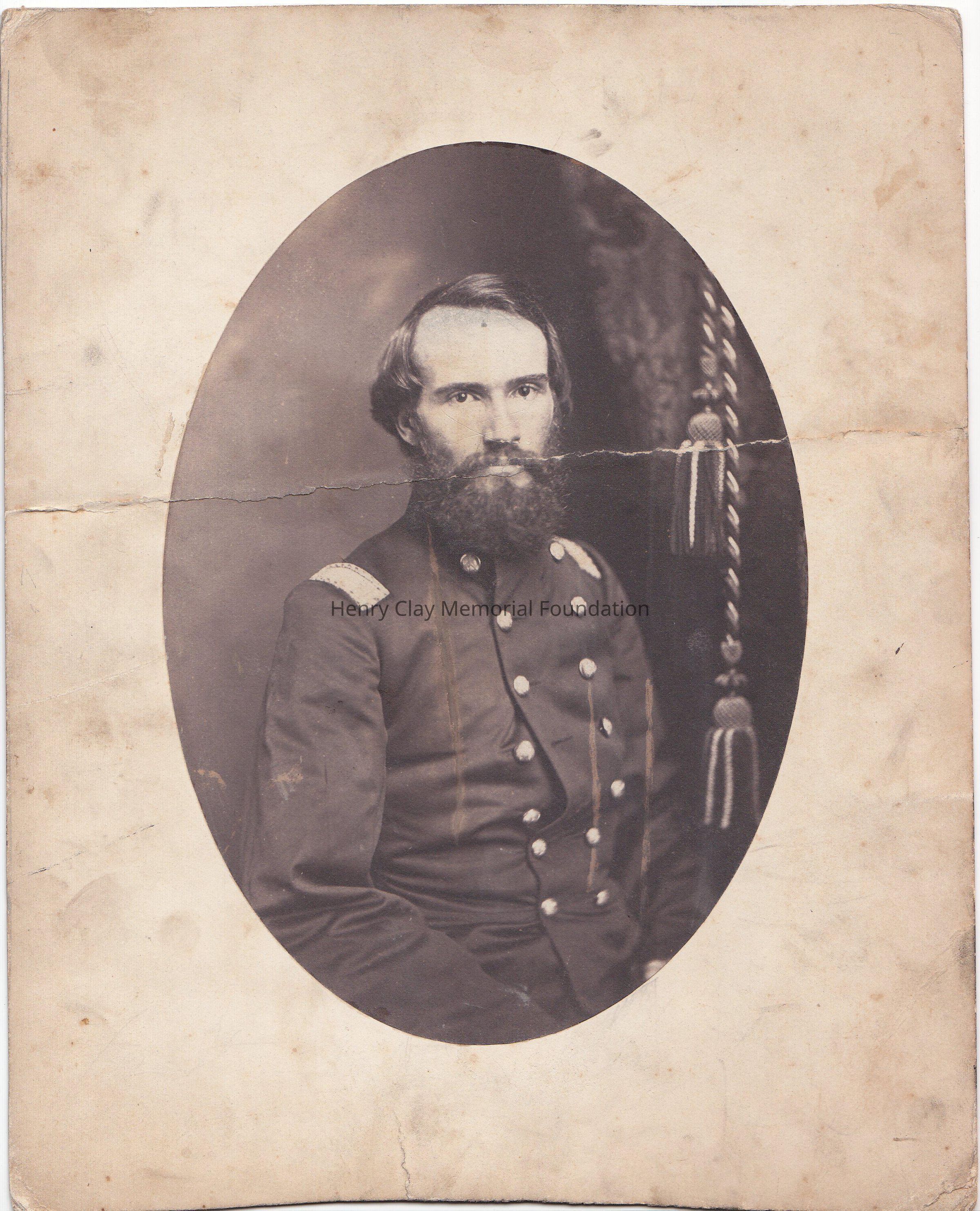 A black and white oval portrait of a man in uniform.