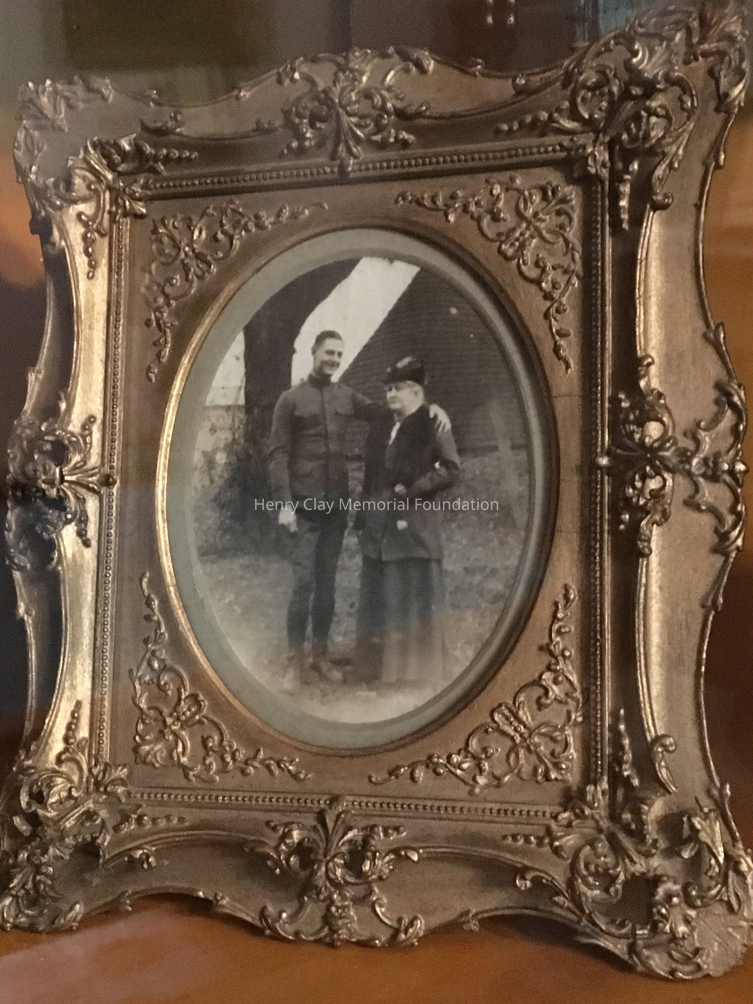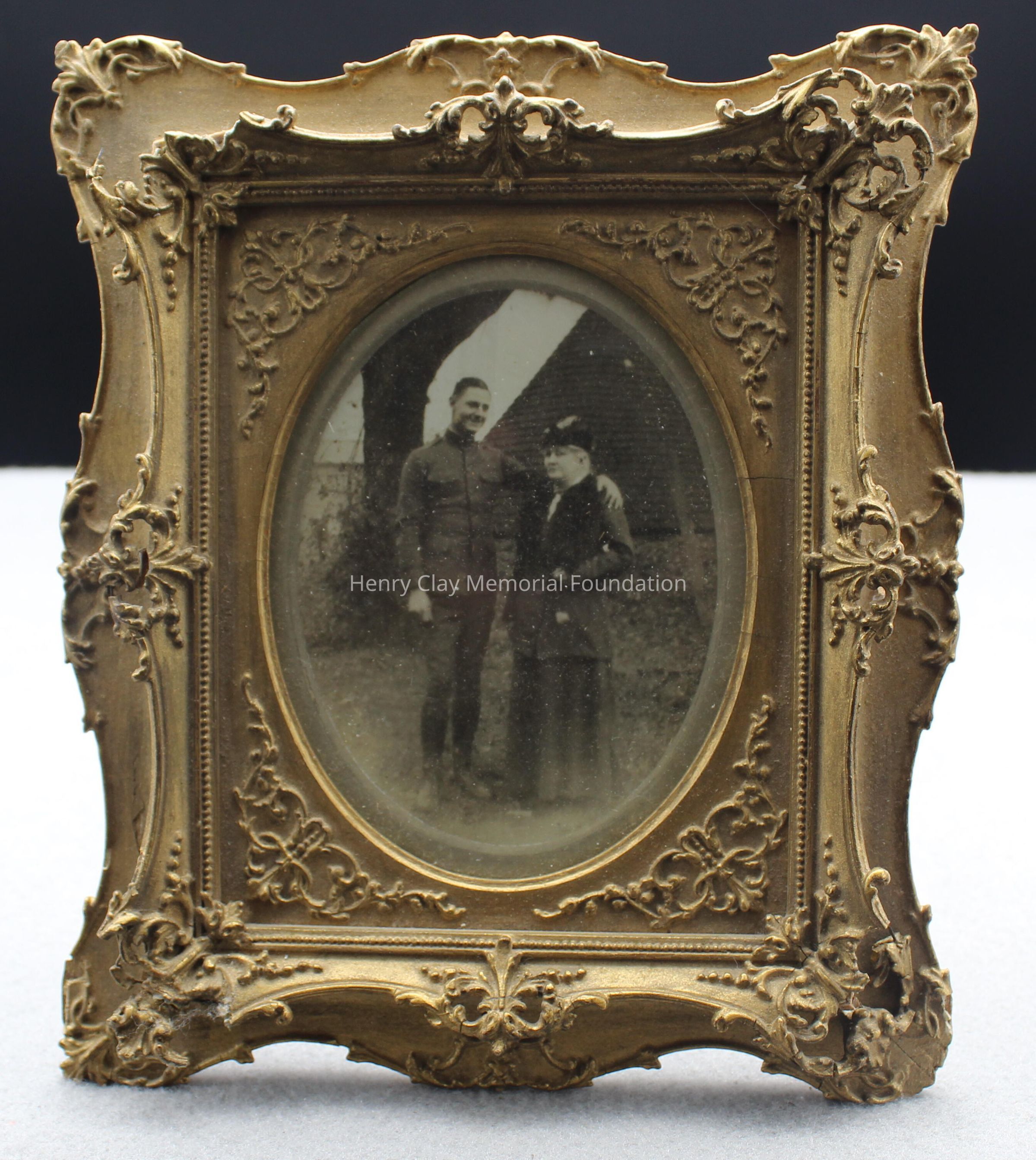 Photograph of man in military uniform and woman in in dark jacket and suit and hat with the Ice house of Ashland in the background. The photograph is in a very elaborate gold gilt gessoed frame. The man has his hand on th woman's shoulder. She is much older than he is.Dimensions