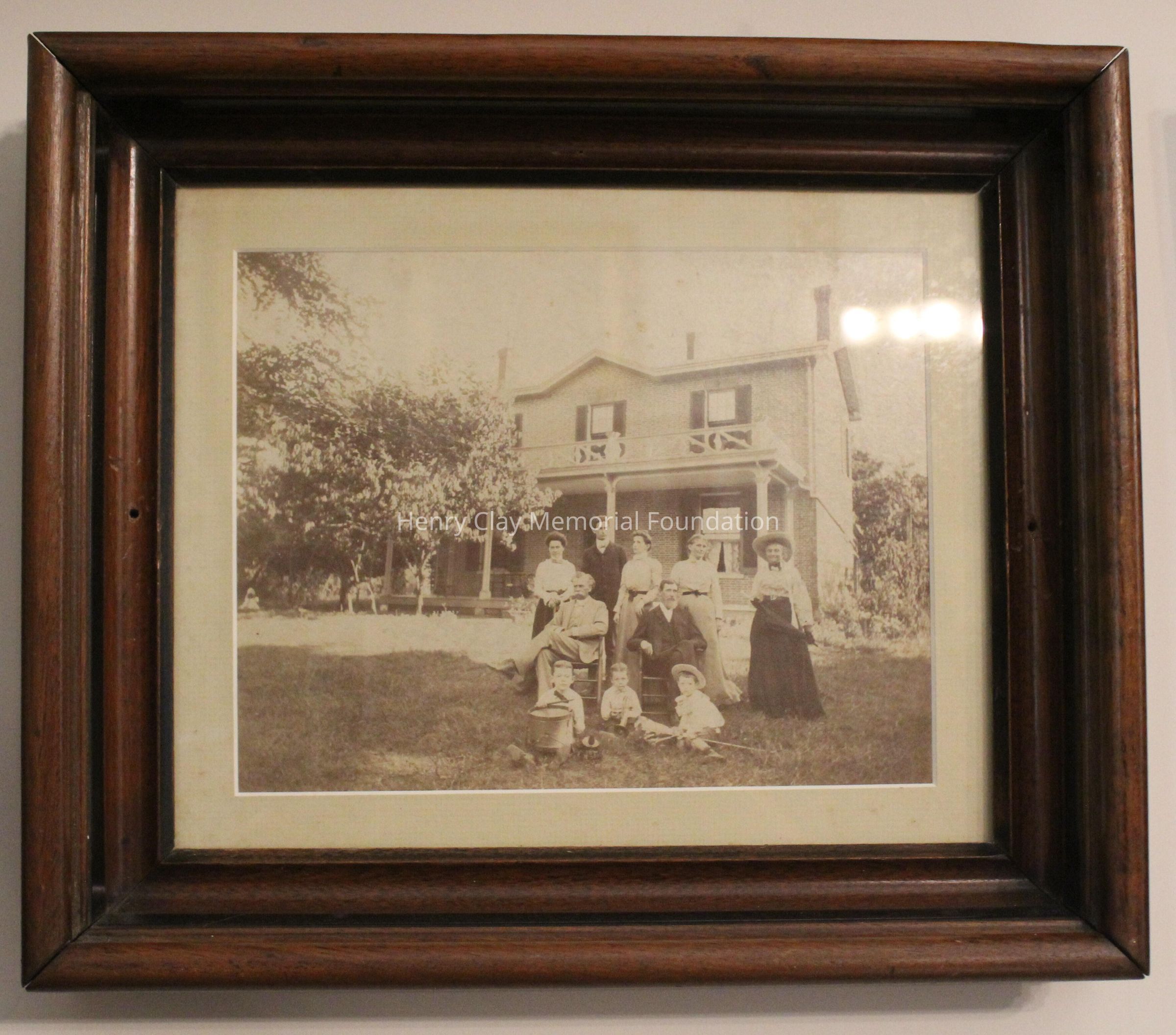 Sepia tone photo of a family in front of a two story brick house. The family consists of 5 standing people, two men seated in chairs, and 3 children seated on the ground in front. The house is a 3 bay structure with a gable over the middle bay on the second floor. There is a porch across the front of the house with a small railing arounf the roof Trees obscure the left side of the house. Photo is matted in alight tan mat and framed in a wide dark wood frame.