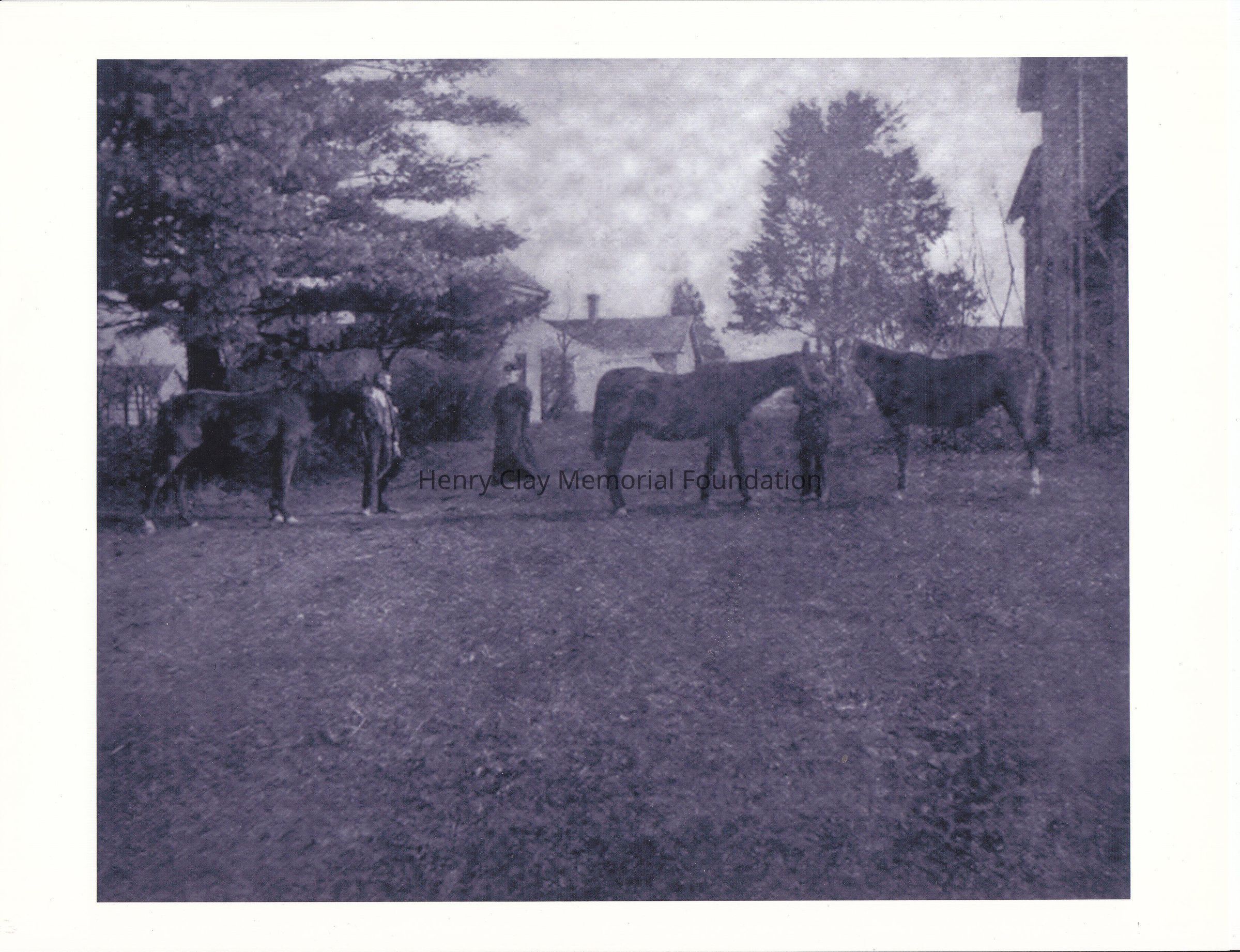 A copy of a black and white photograph of a woman, two men, and three horses. In the background a two cottages.