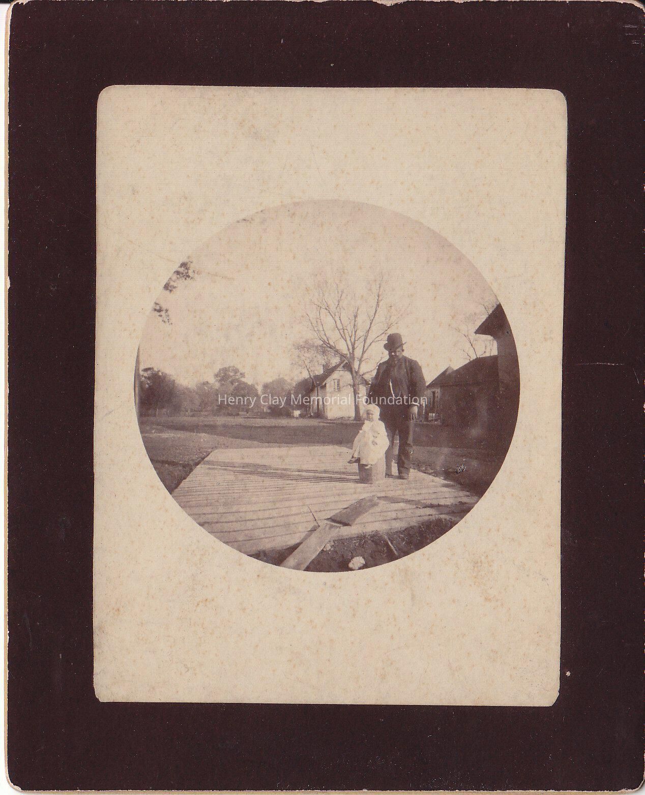 A black and white photograph of a man and a child on a wood base.