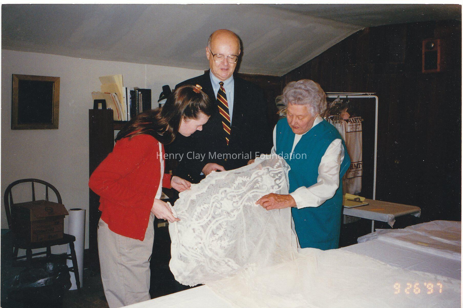 A colorized photograph of three persons caring for a piece of lace.