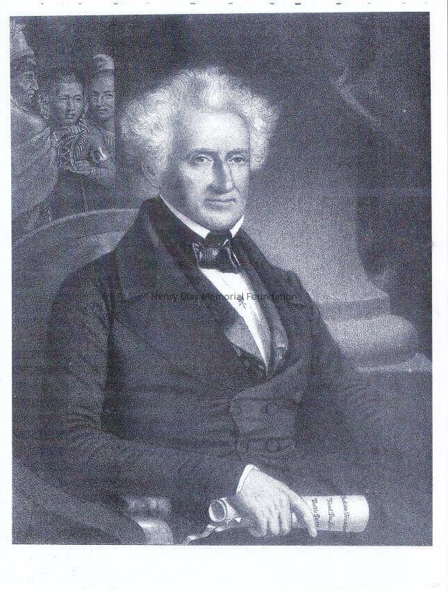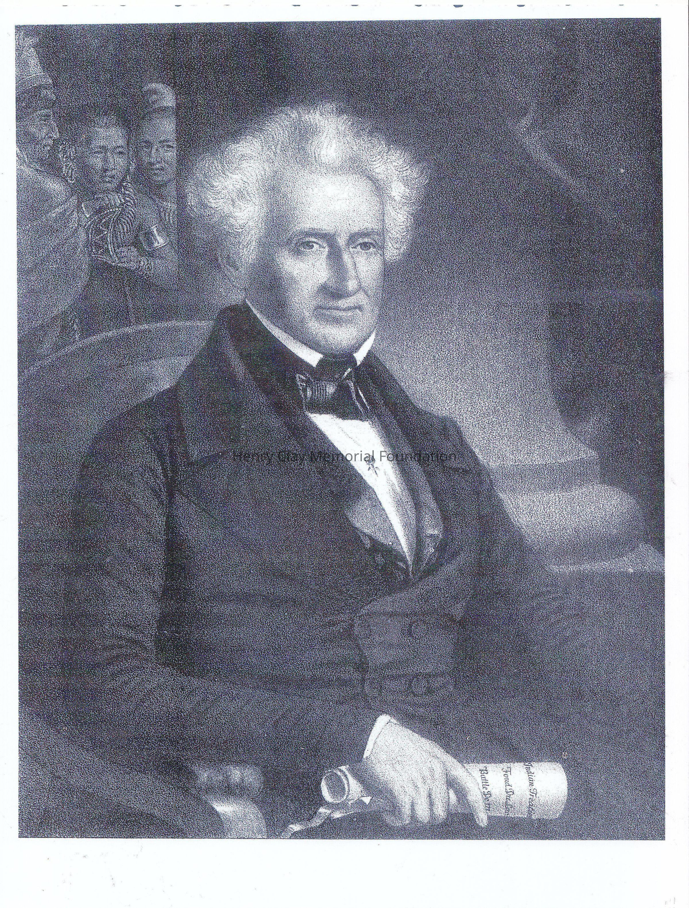 A copy of a drawing of a man holding a scroll, with in the background some native looking at him