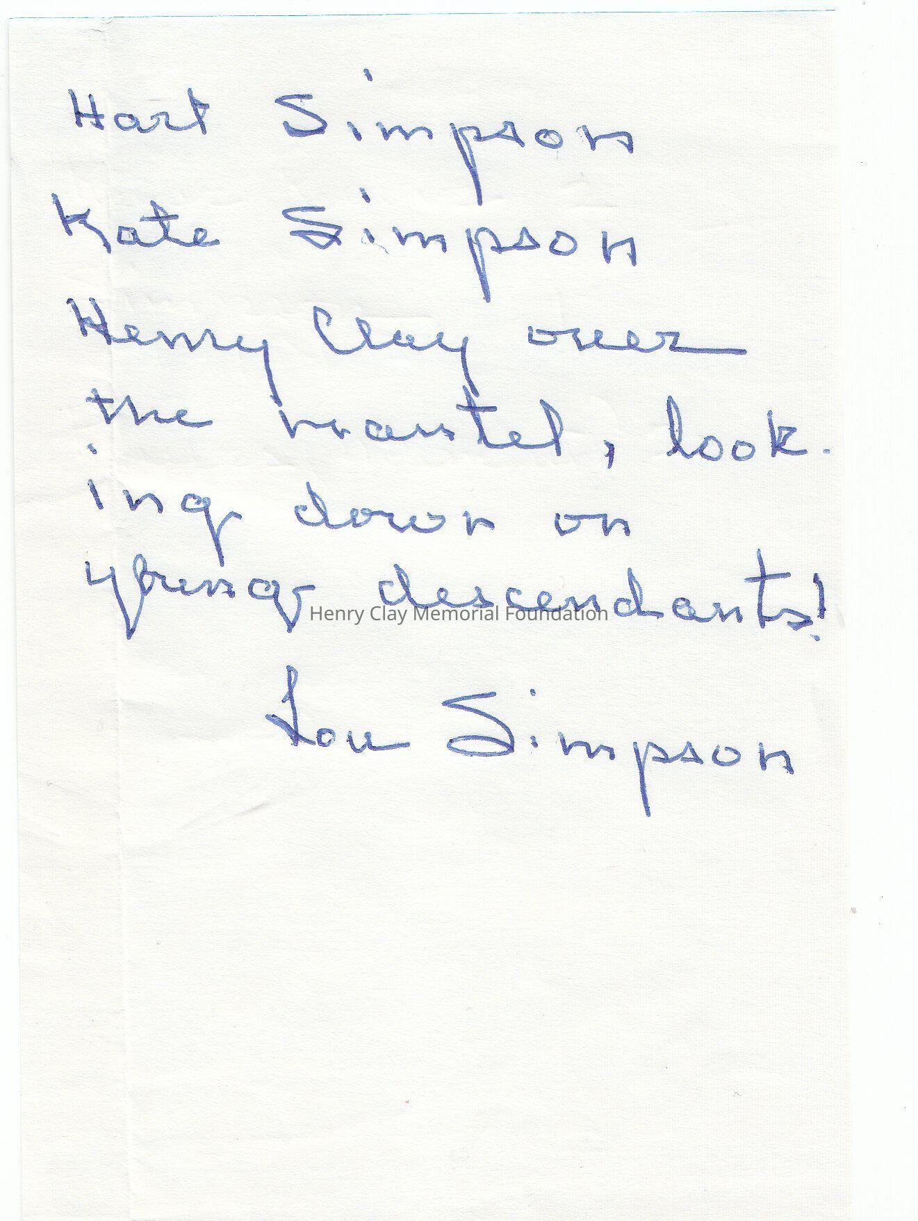 With the photograph an handwritten note " Hart Simpson, Kate Simpson, Henry Clay over the mantle looking down on young generation. Lou Simpson"