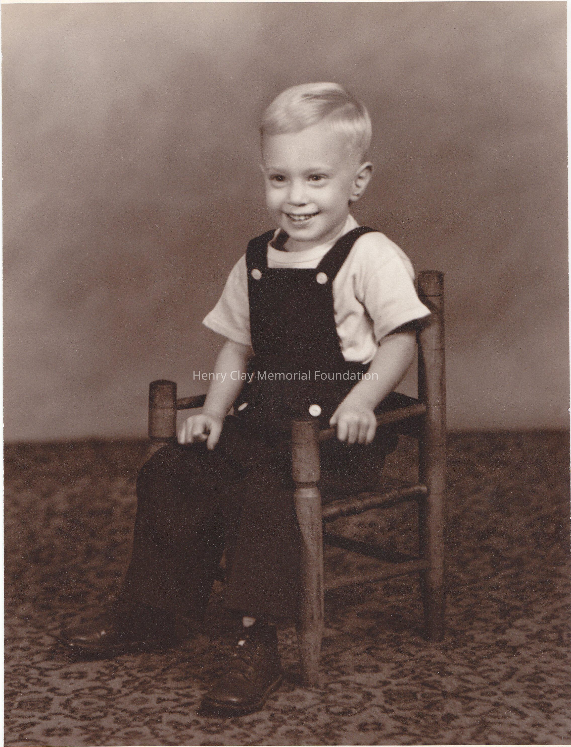 A black and white portrait photograph of a little boy sitting on a wood chair. He is wearing a white t-shirt, with black overal pants.