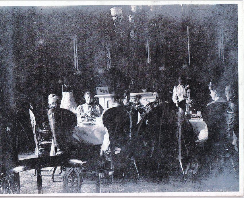 A scene in the dining room at Ashland. Four men, and five women. Two servants are standing on each side of the fireplace.