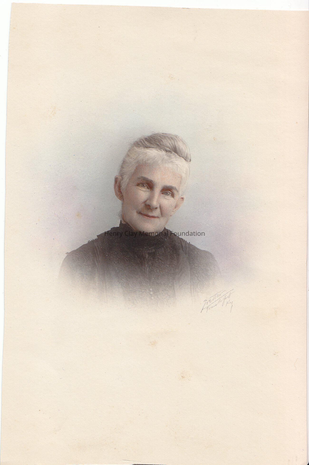 A colored photograph of Eizabeth P.Pepper. Her hair are grey, pulled up in a bun. Her eyes are bluish-grey, her lips are pink-red. She is smiling. She is wearing a black dress with lace detailes.