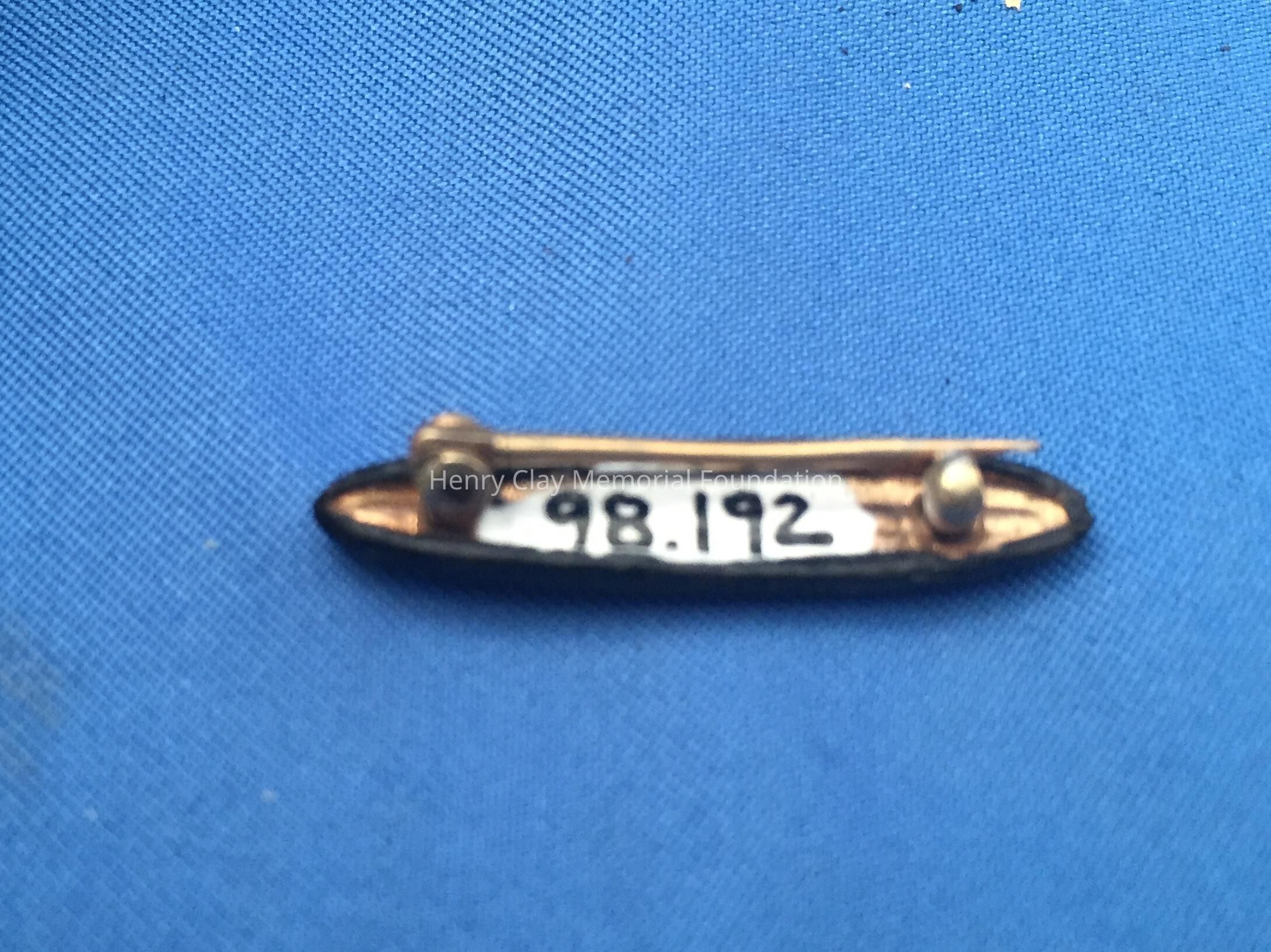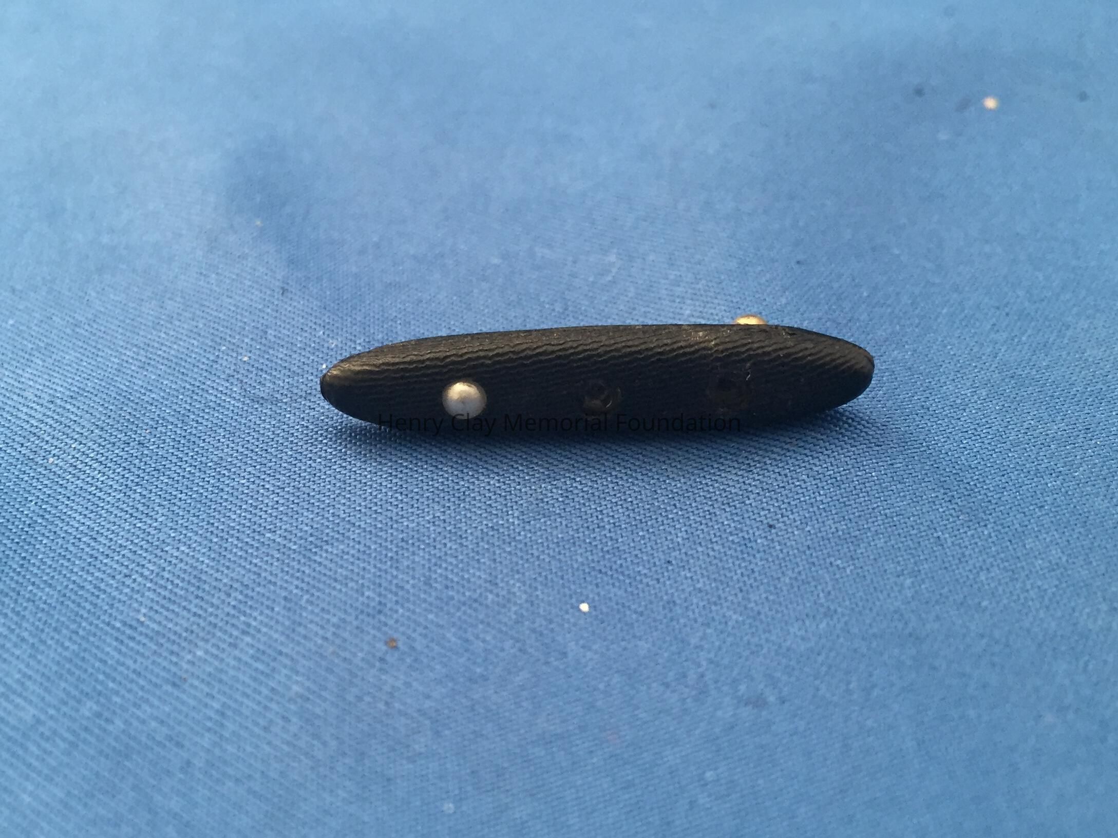SImple black bar pin, tapered at both ends, with three seed pearls across the front. Crude pin clasp.