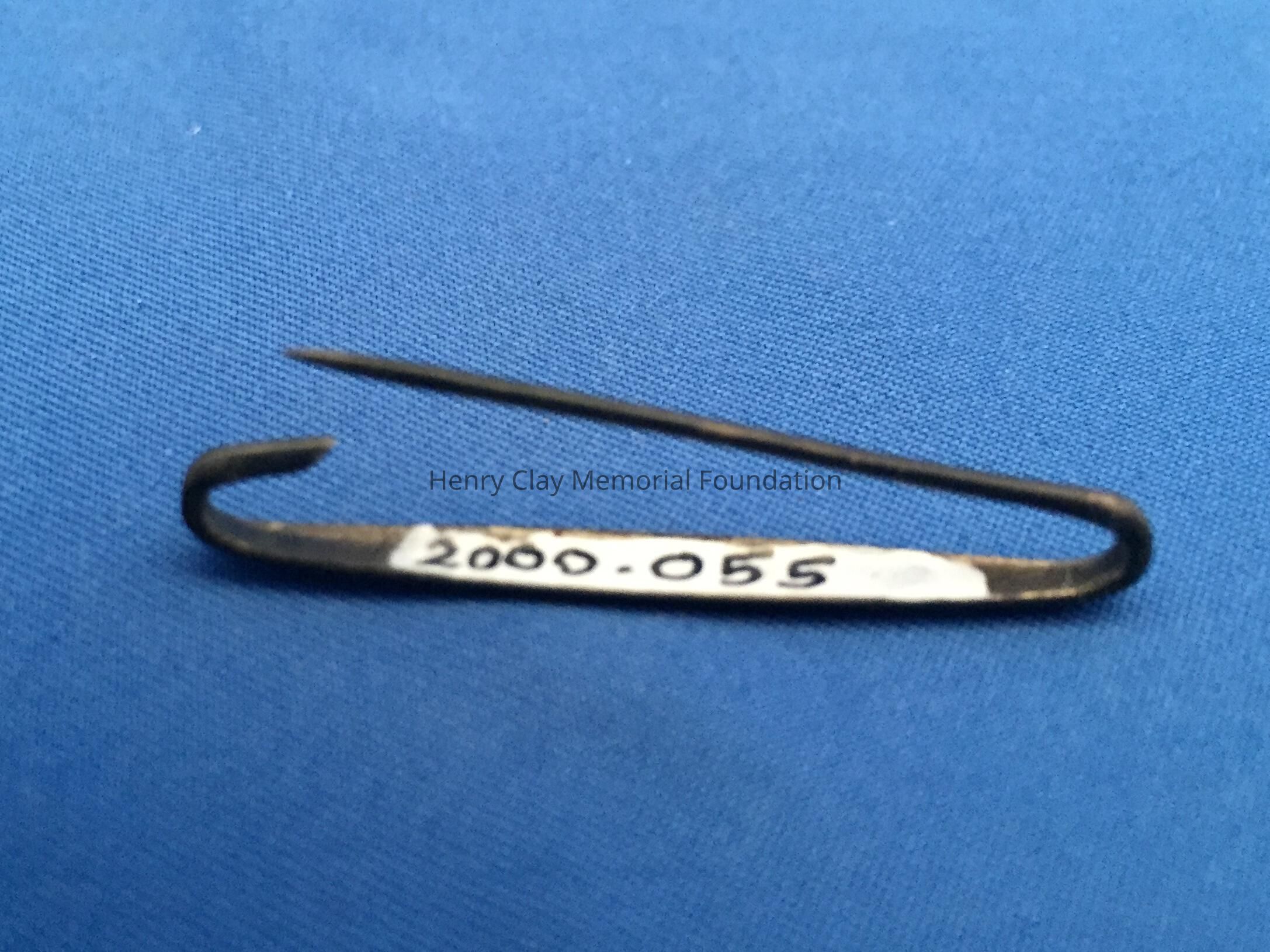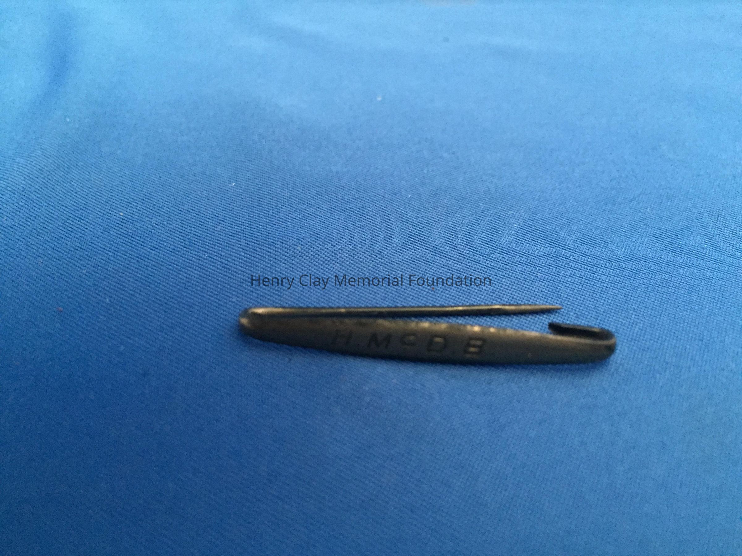 Silver bar pin with initials "HCMcDB" on front.