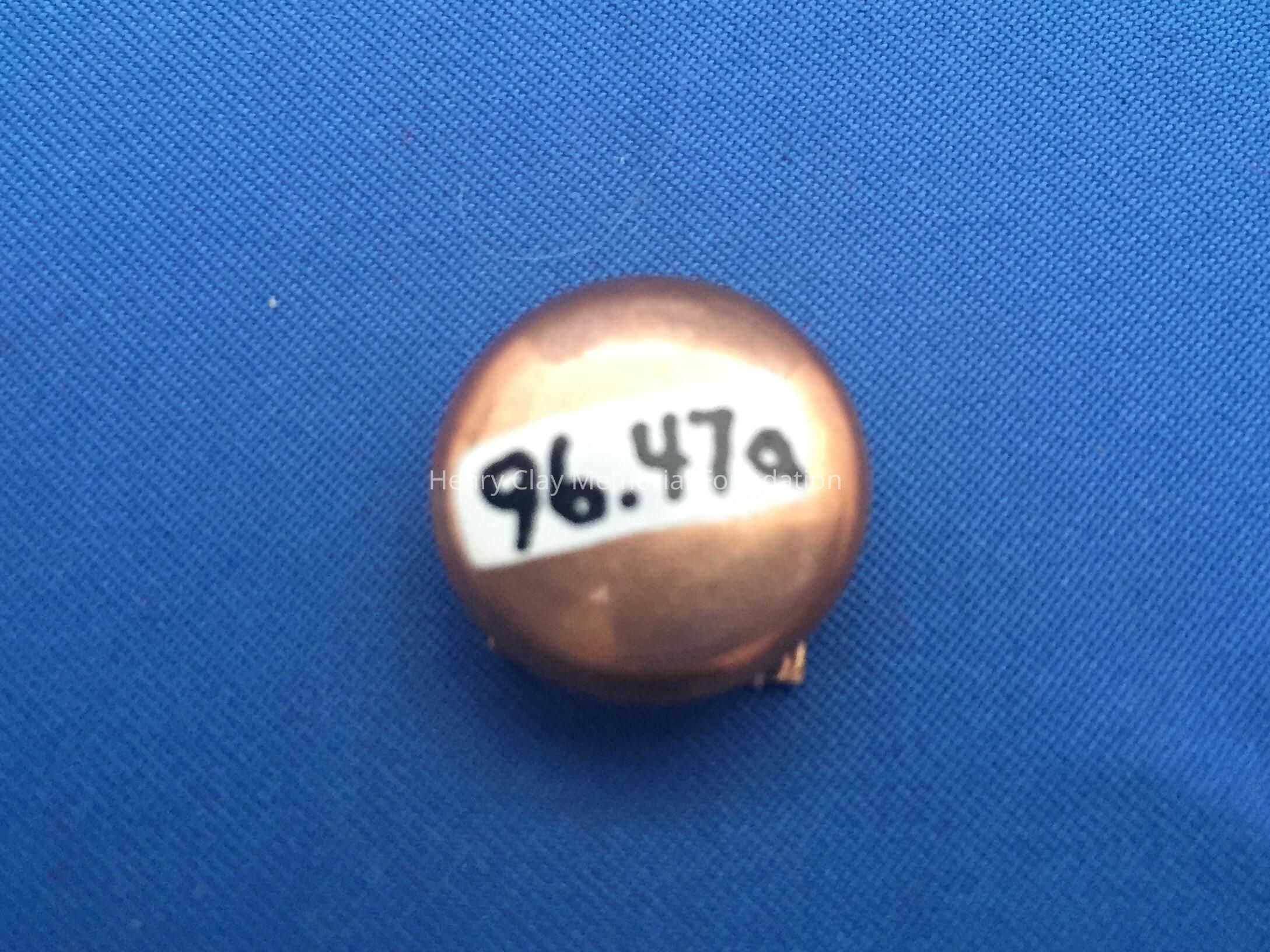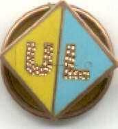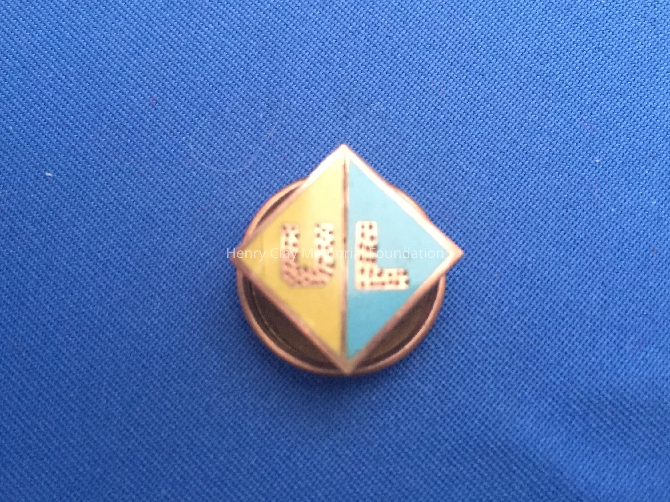 Square pin split with yellow and baby blue enamel on front and letters "UL." Large round screw back.Dimensions