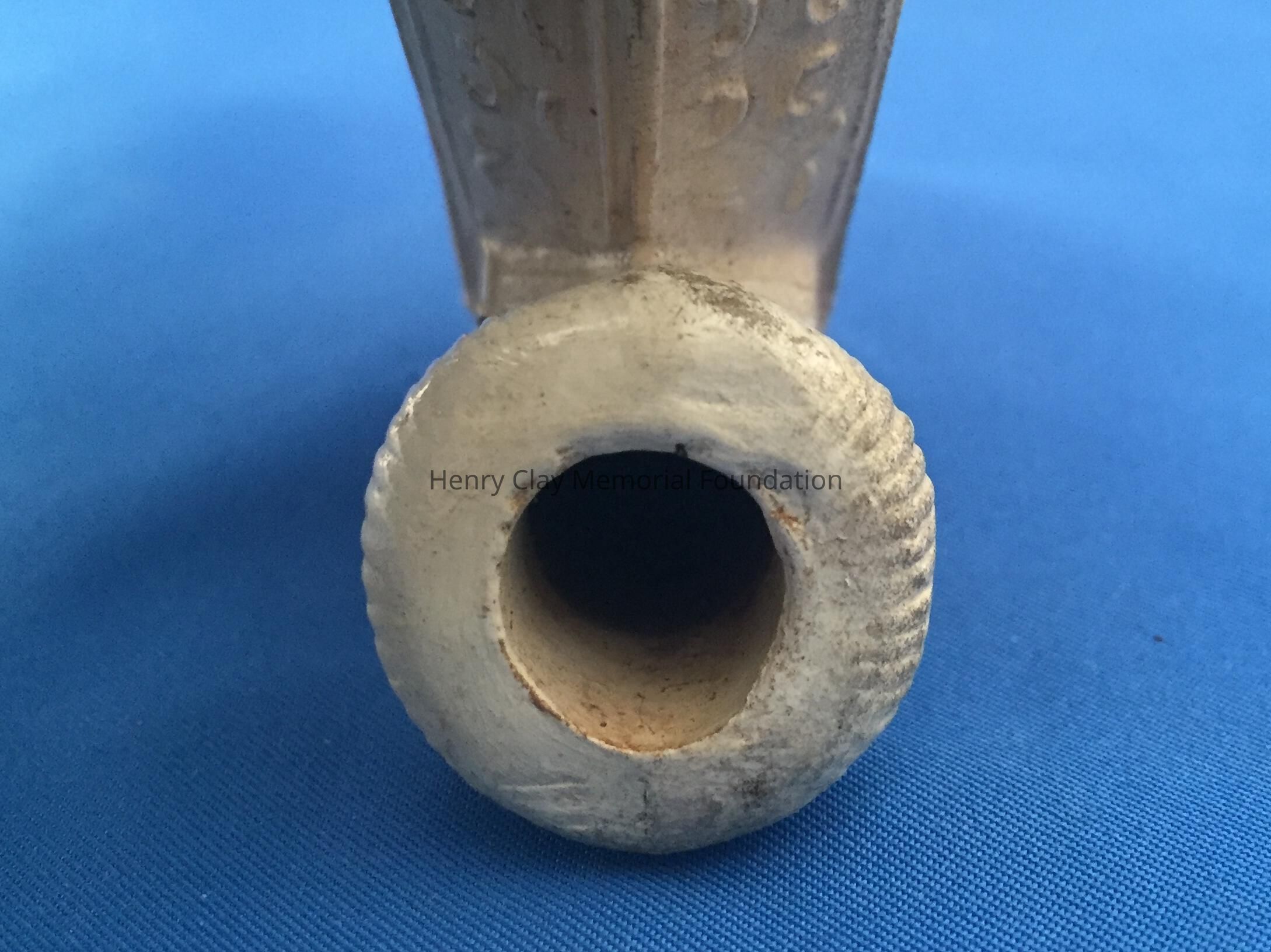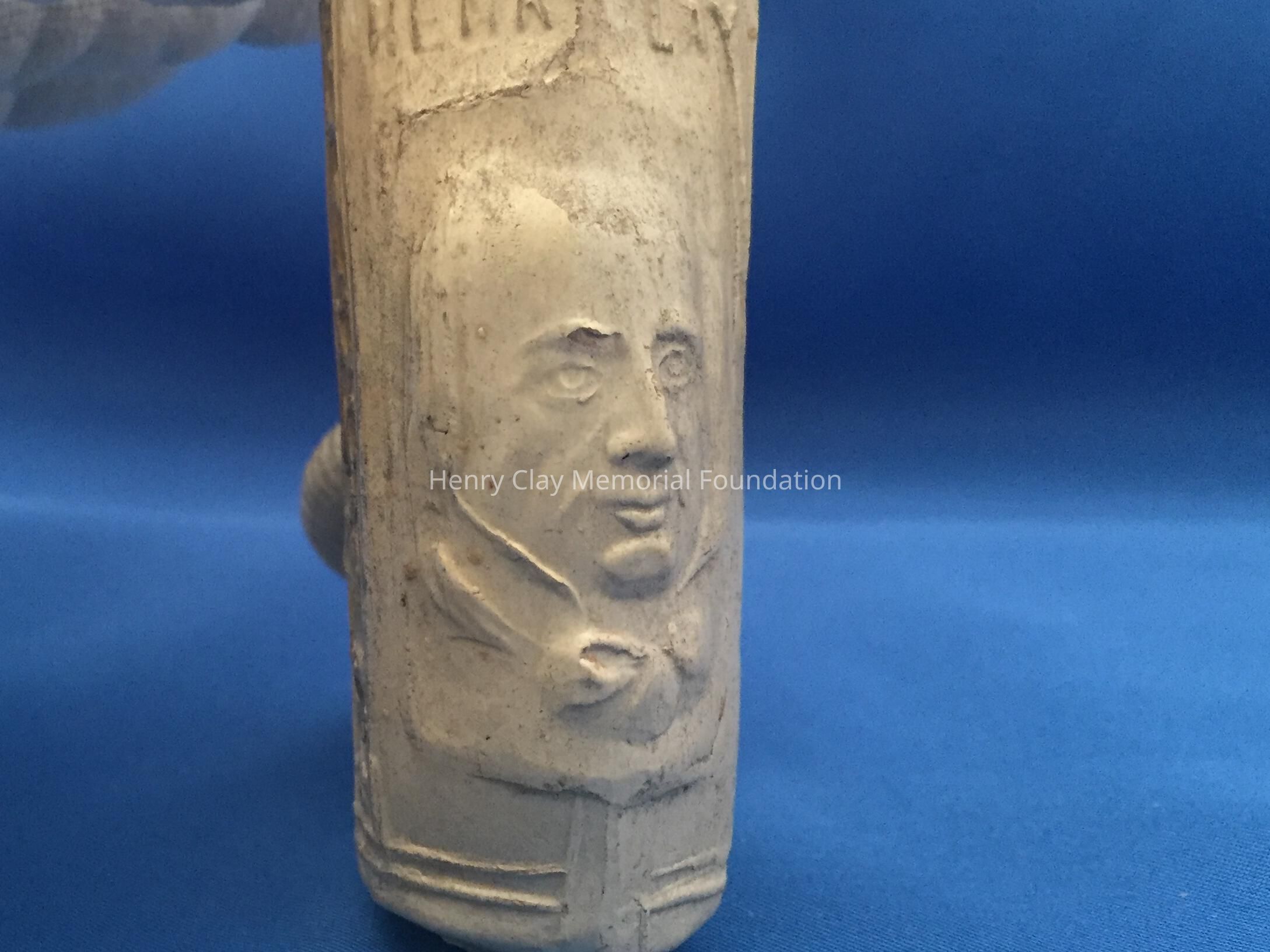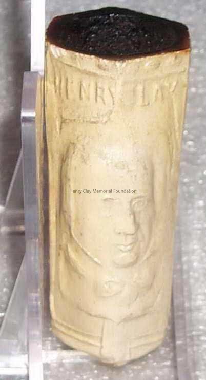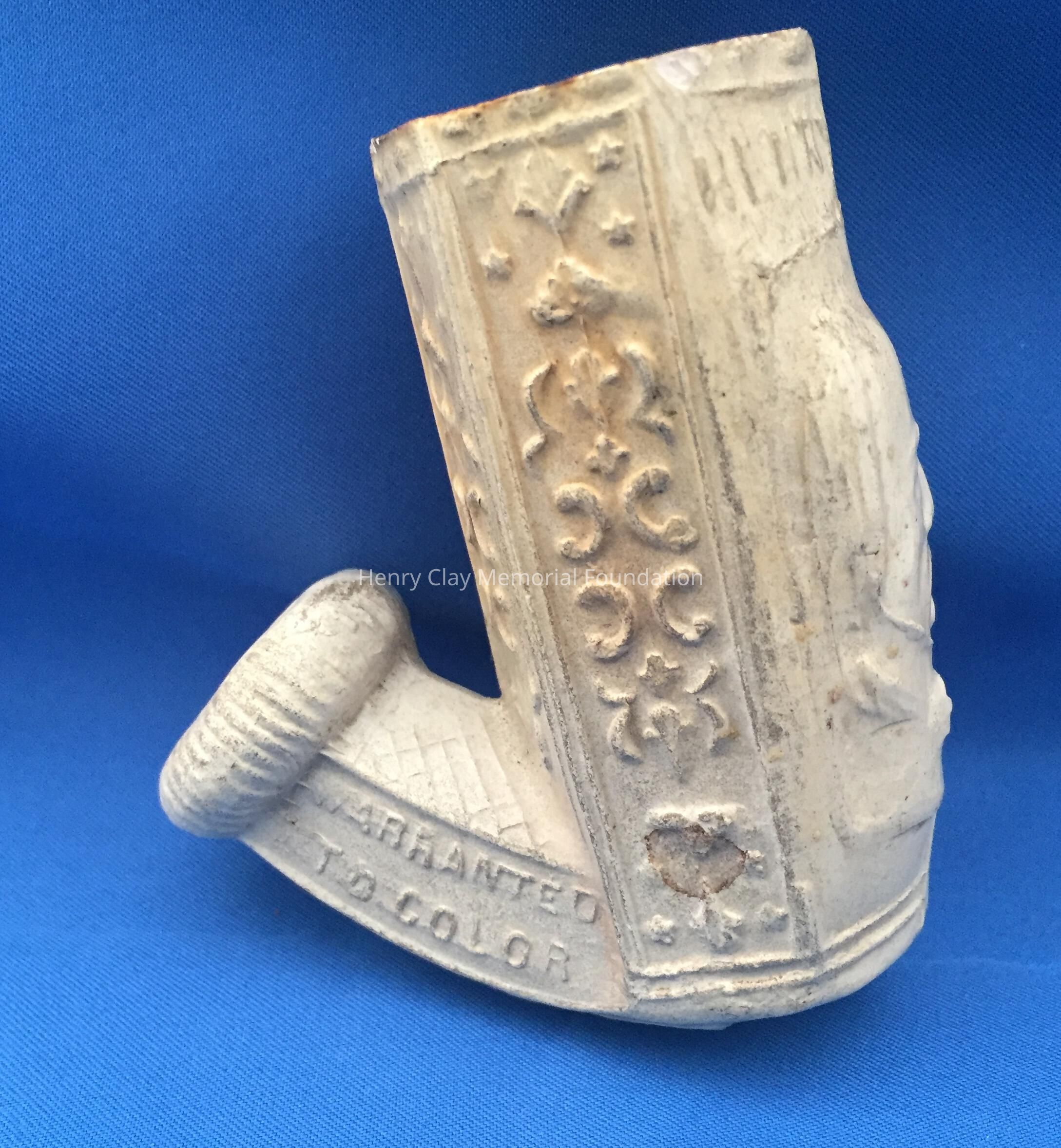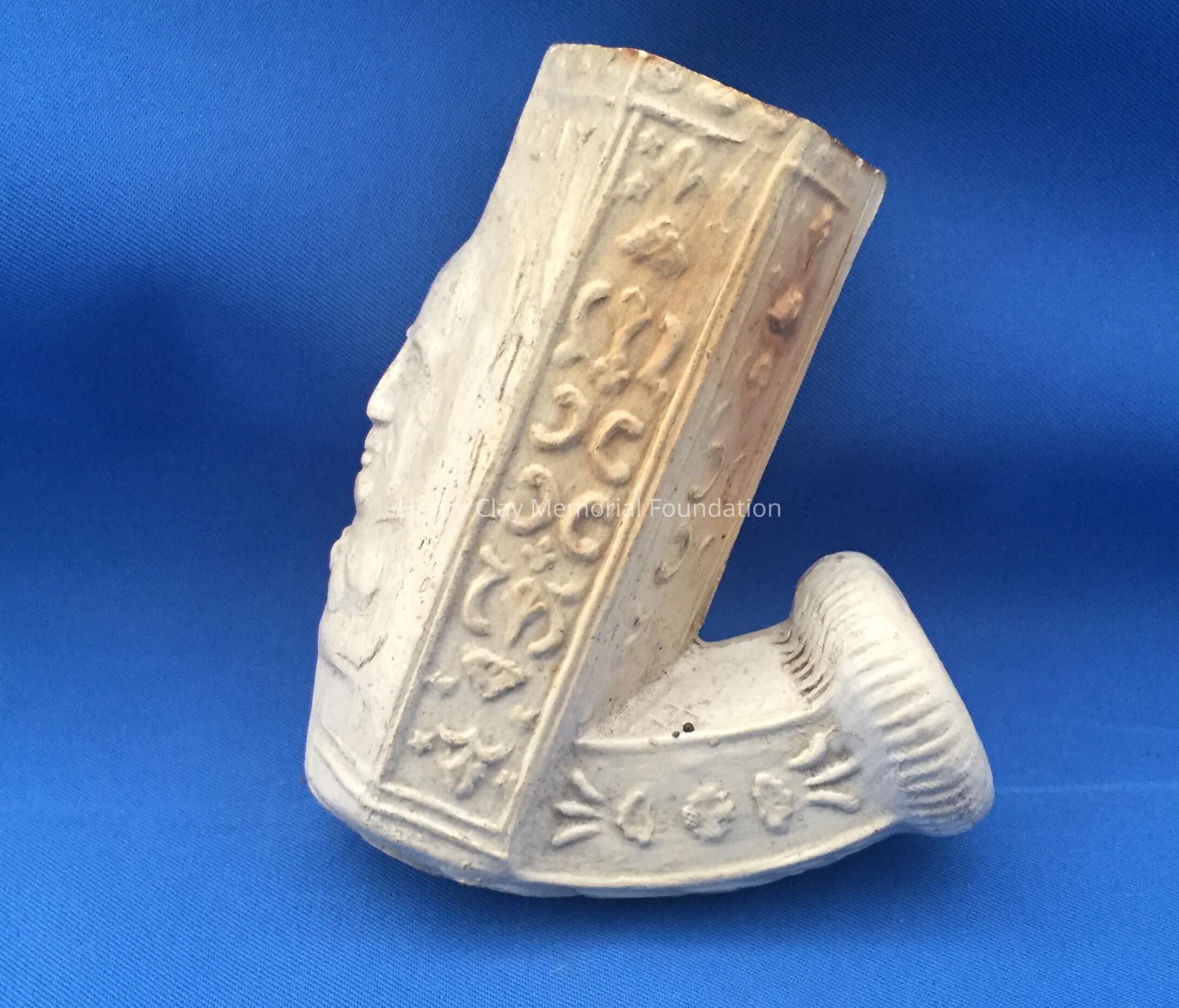 One white ceramic pipe (bowl and neck only, no stem) bearing the likeness of Henry Clay on the front. Pipe bowl is hexagonal and stem is round. Front two panels of the bowl bear the image of Clay with his name above. The rest of the bowl is decorated with floral diapering. The bottom of the bowl and neck is covered with an acanthus-like leaf design. On one side of the neck are the words: "Warranted for Color." Neck terminates in serrated ring.