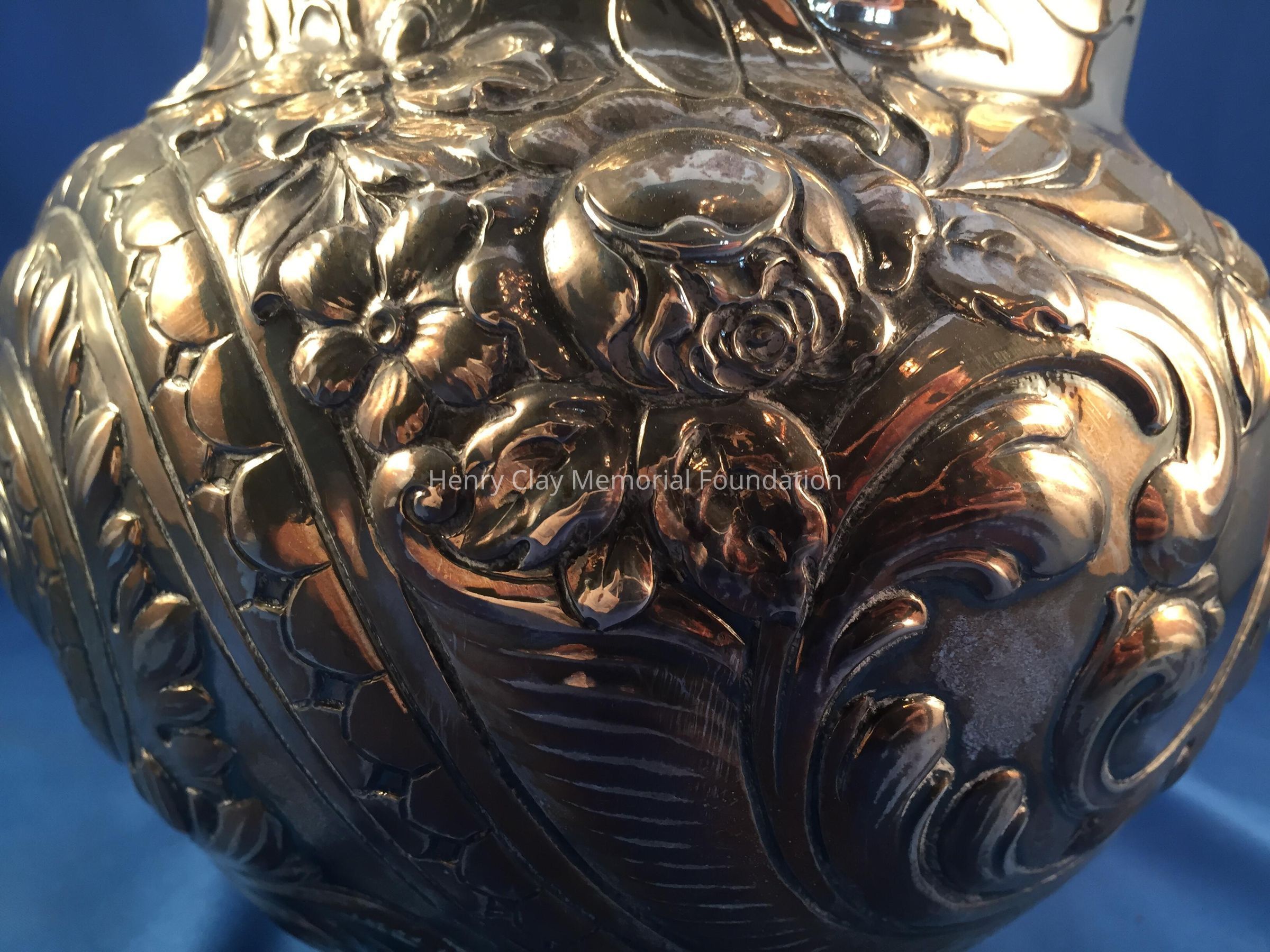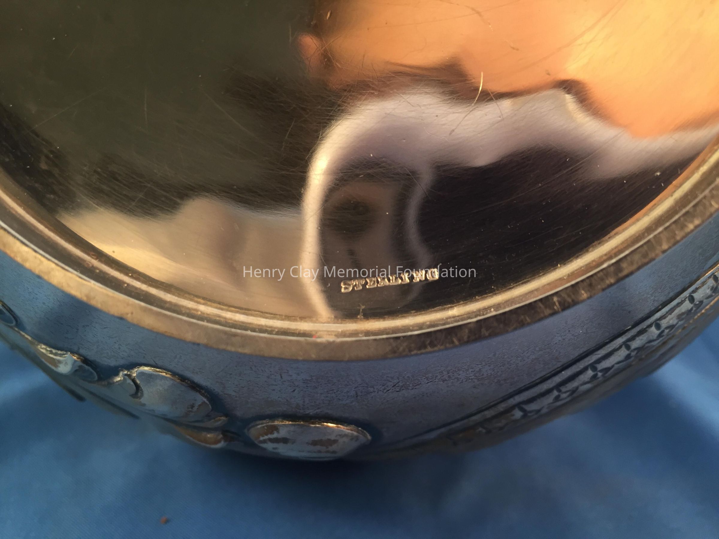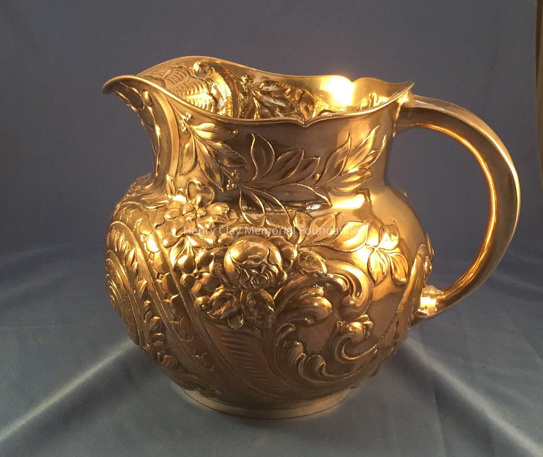 Sterling Repousse wide-bodied pitcher marked with hallmarks and "1665 / Sterling" on bottom.
