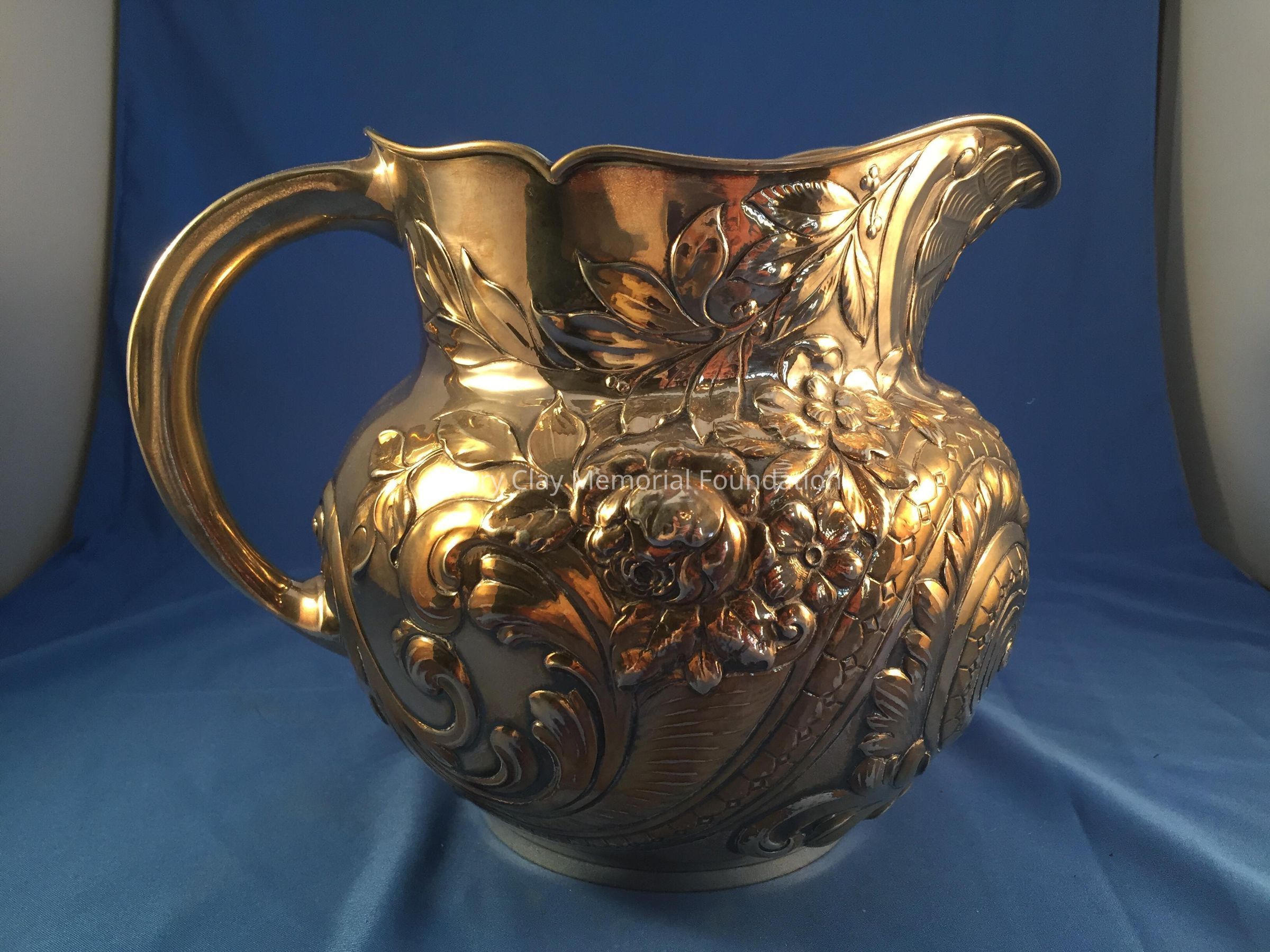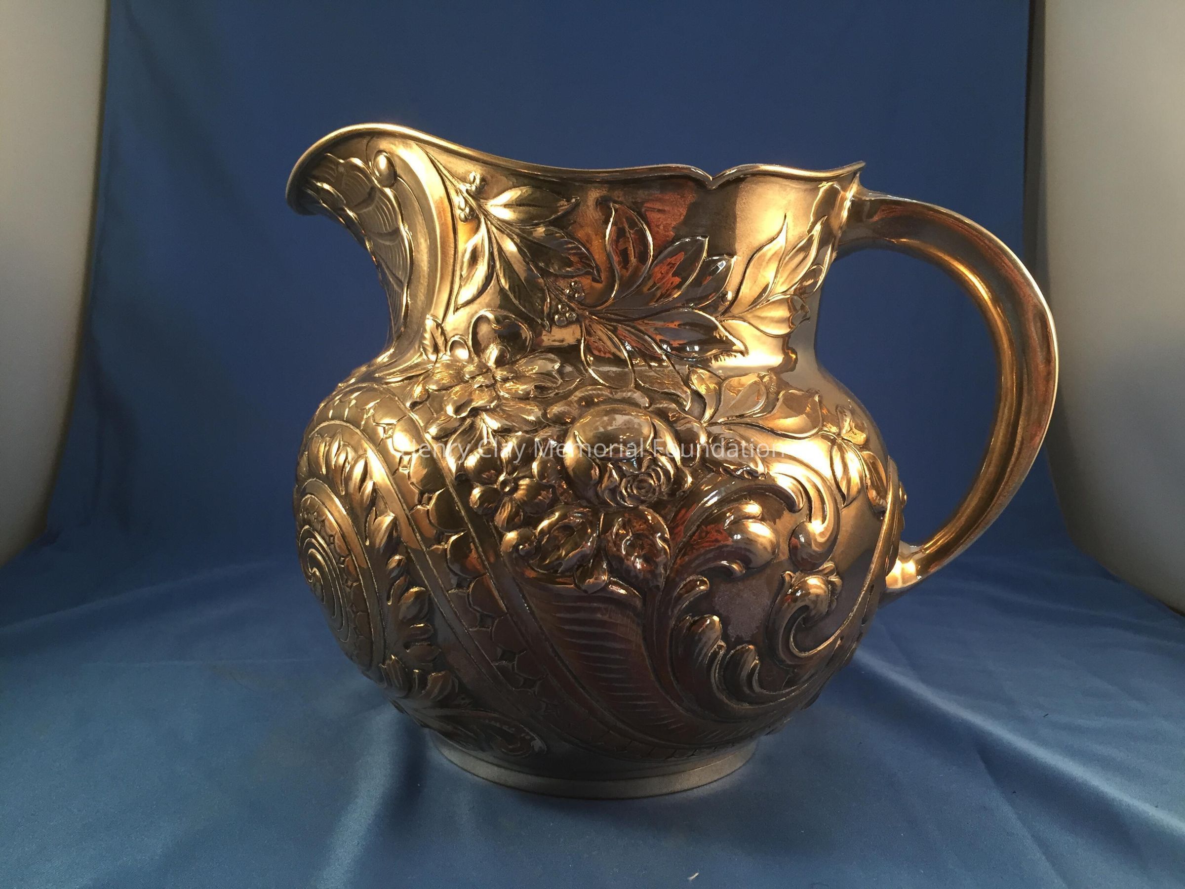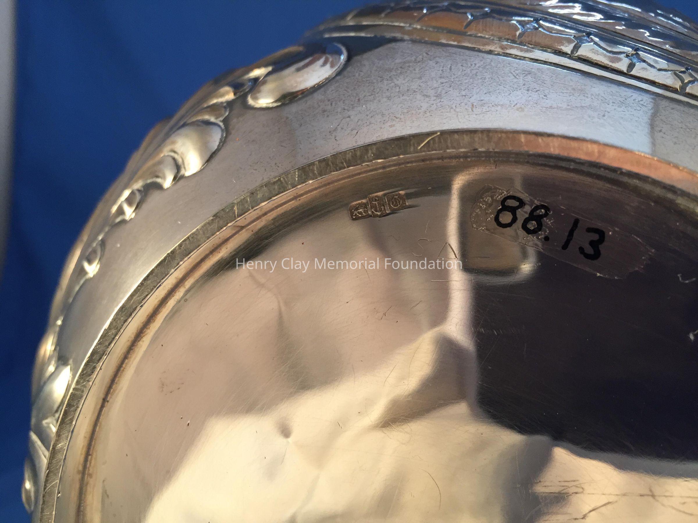 Sterling Repousse wide-bodied pitcher marked with hallmarks and "1665 / Sterling" on bottom.