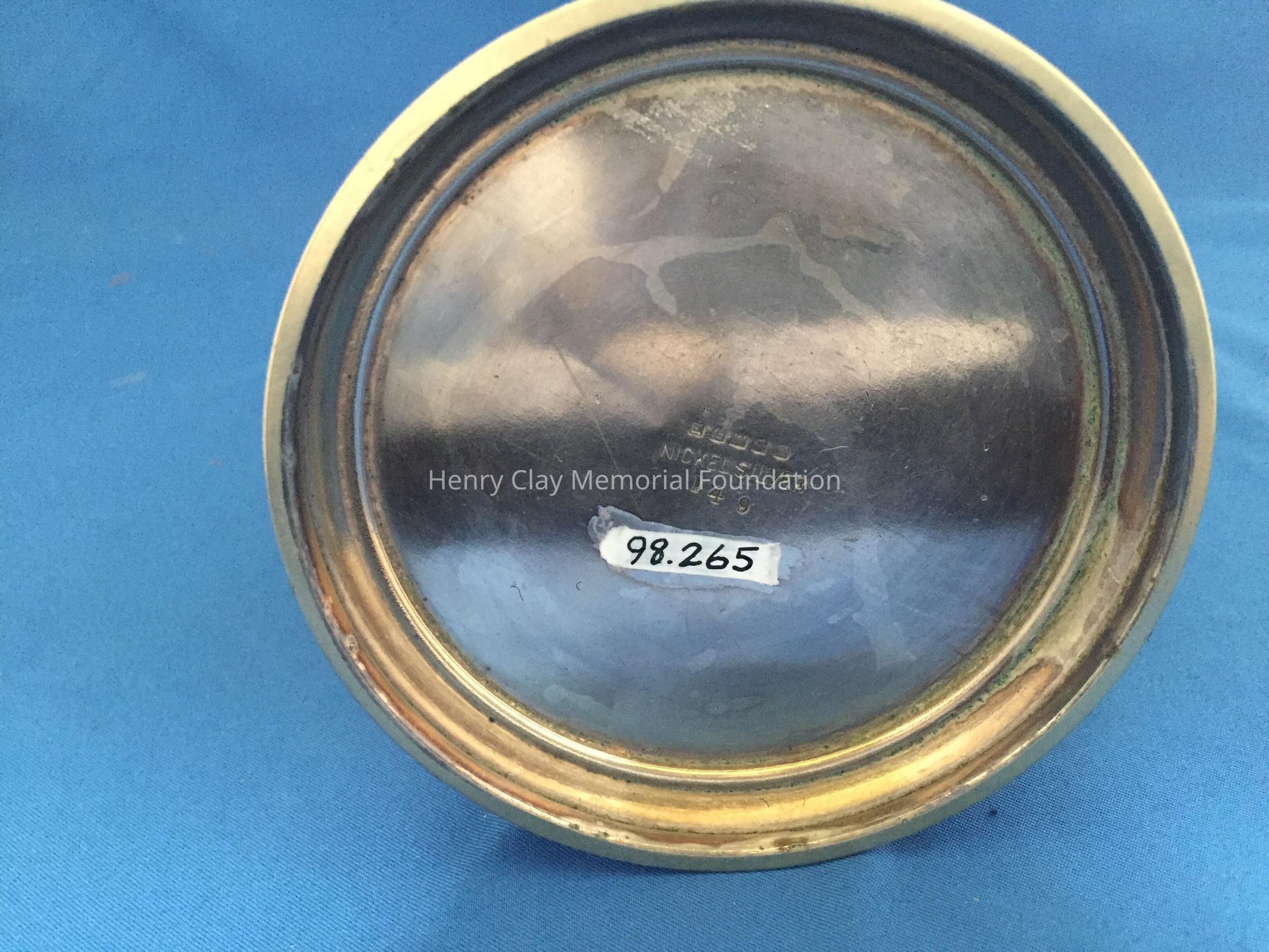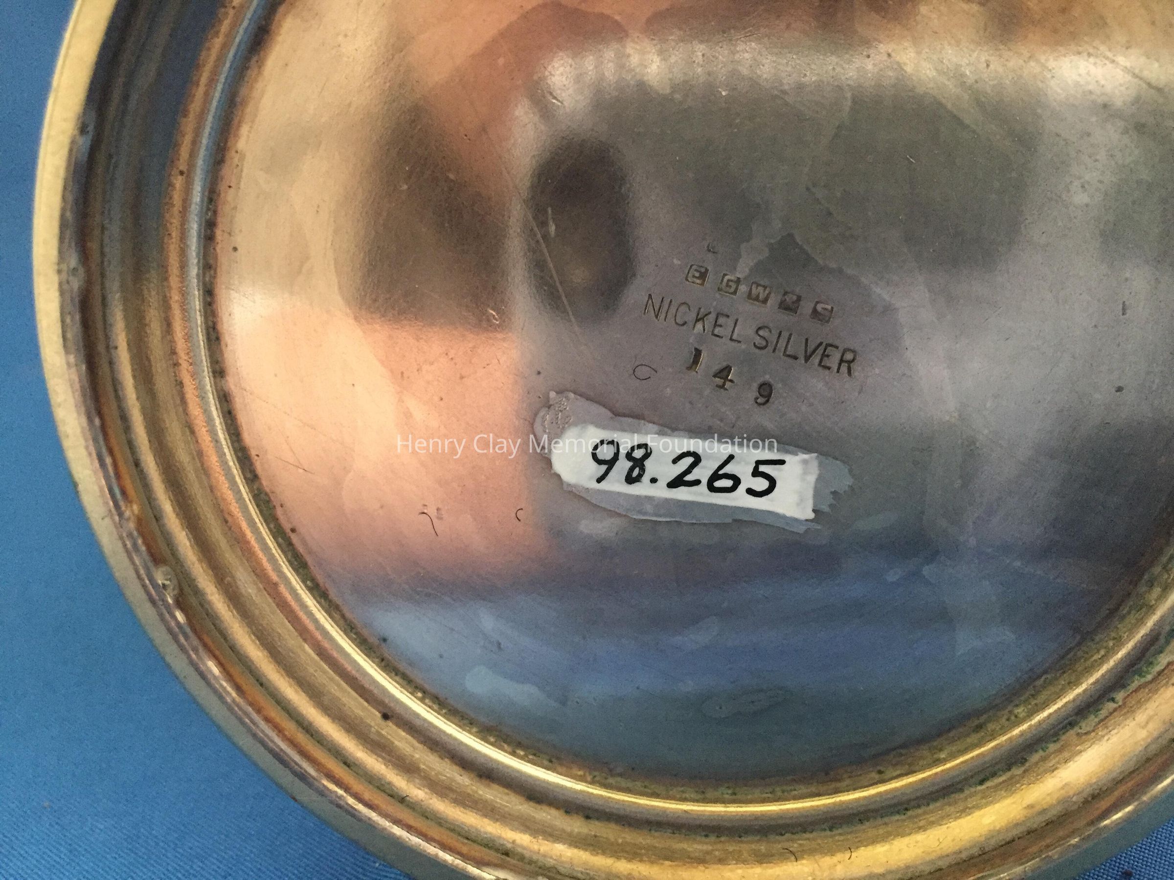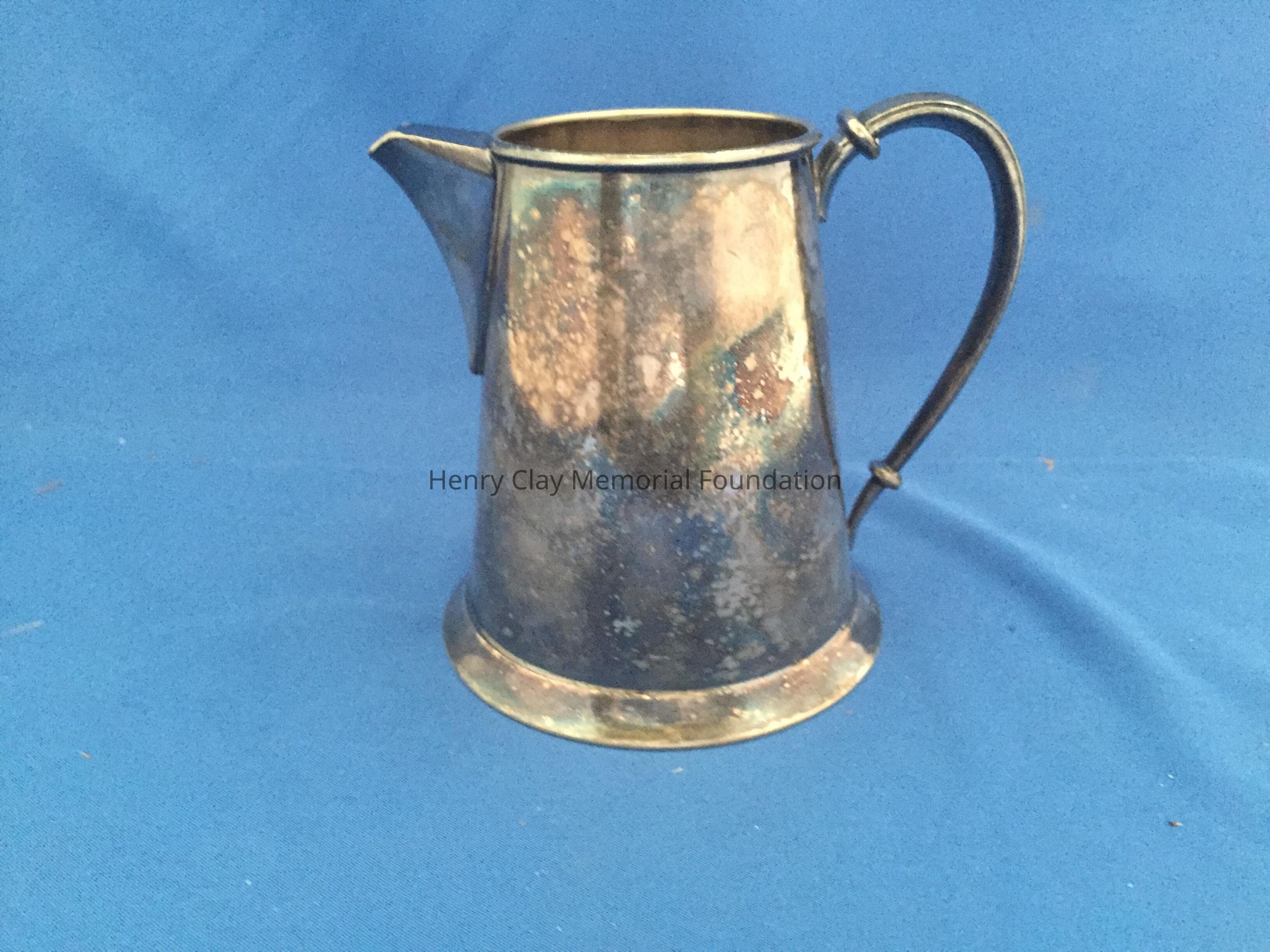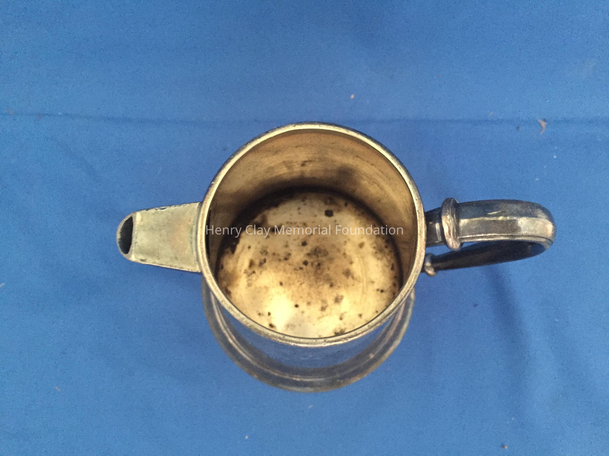 Small open-top creamer with covered spout and handle. Wide bottom. Marked on bottom "EGW & S / Nickel Silver / 149."