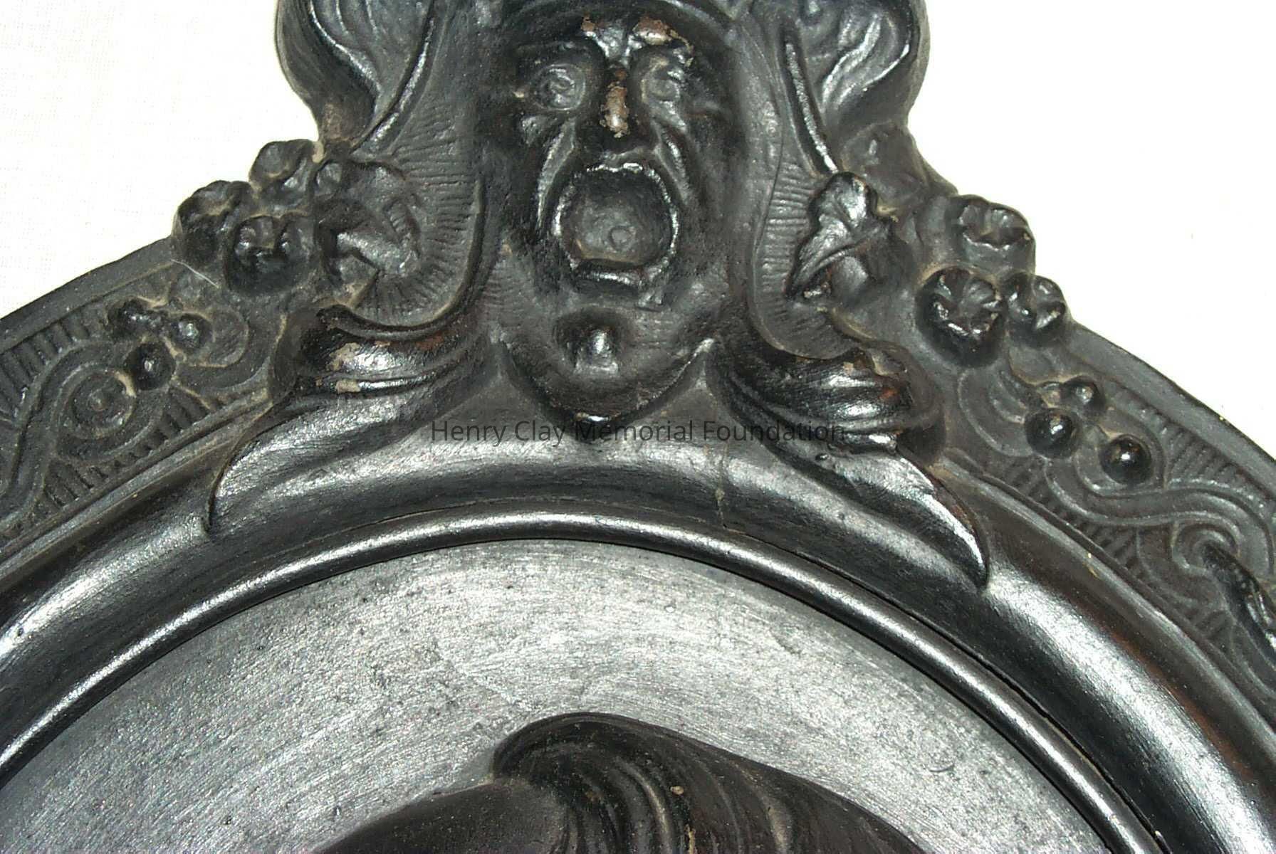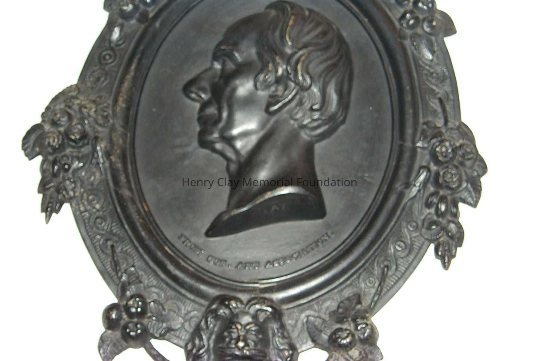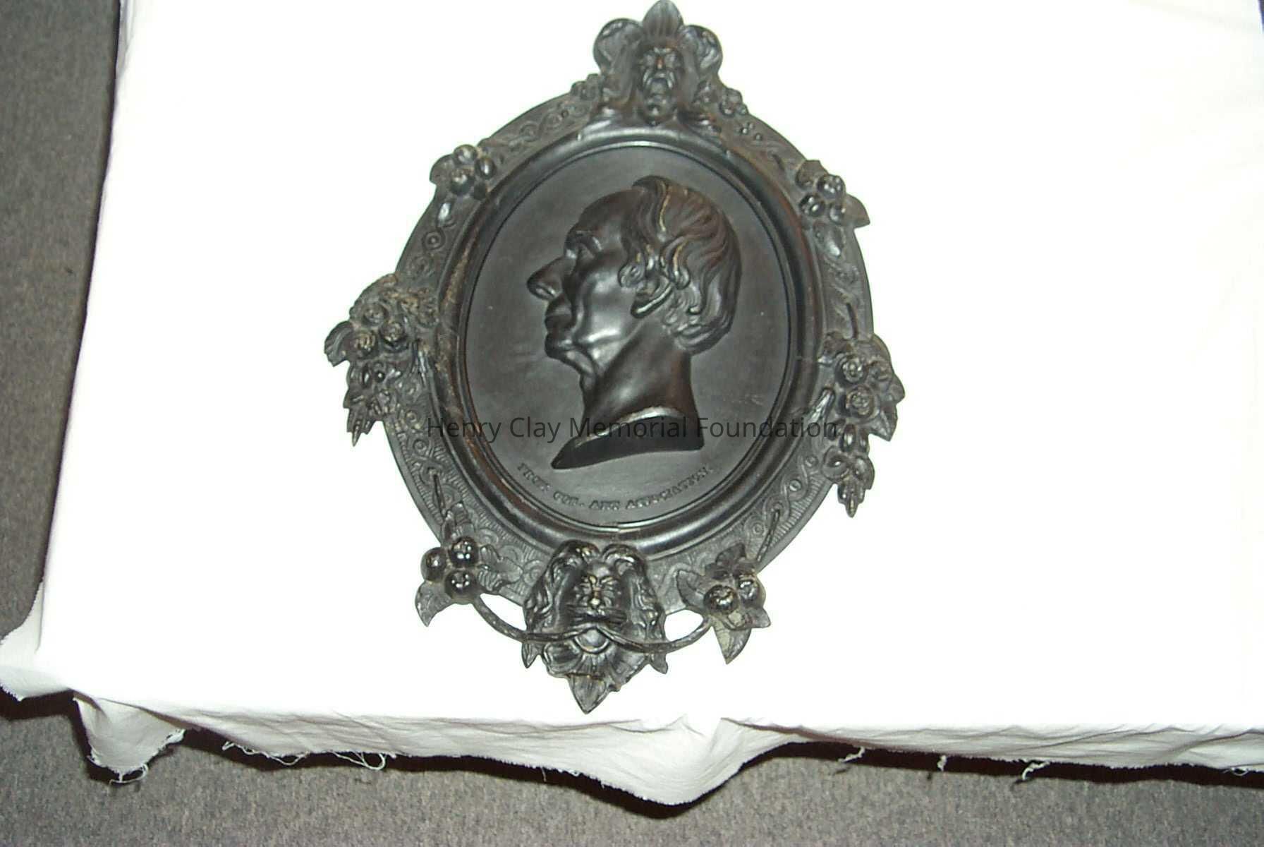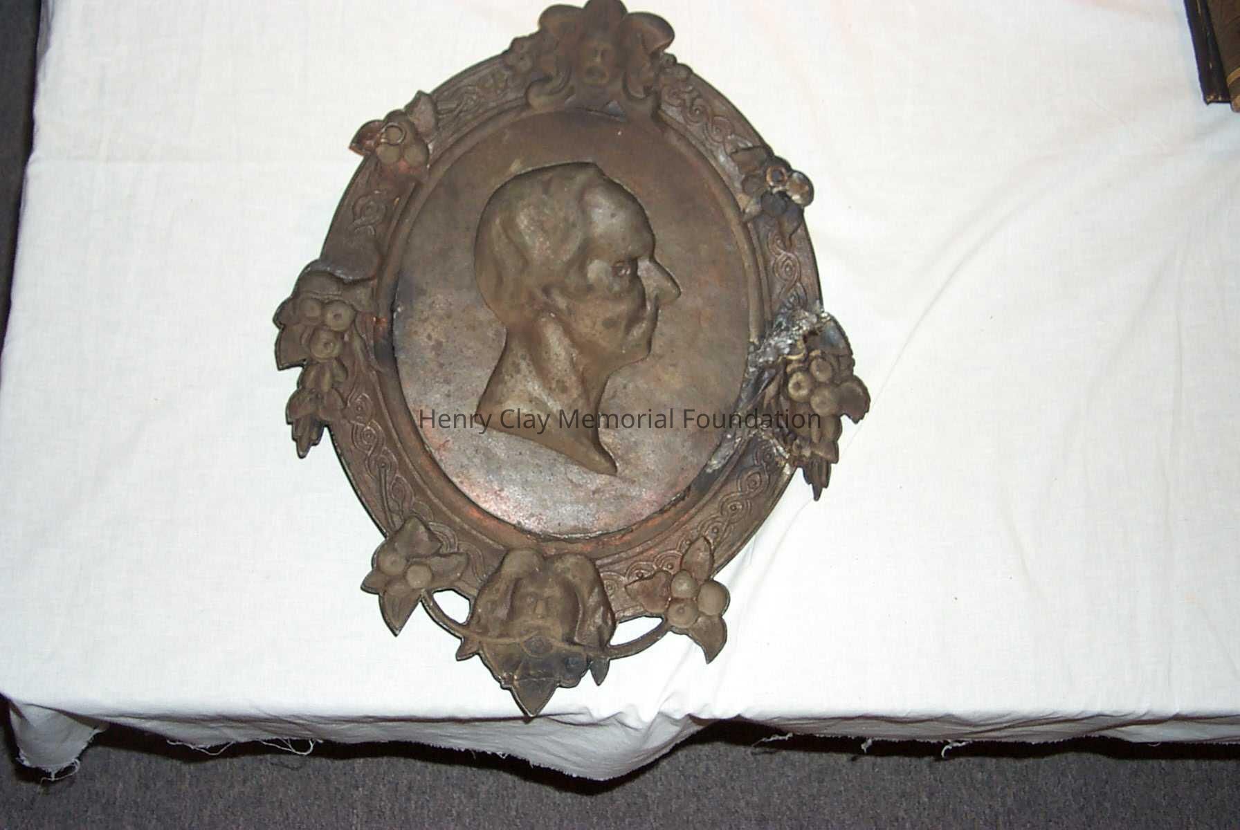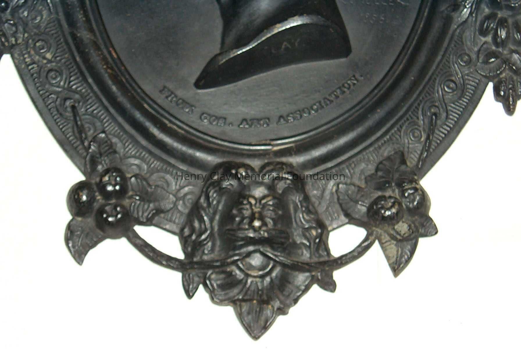 A cast iron plaque showing the bust image of Hery Clay. Image is left profile. Below image is inscription that reads: "From Cos. Art Association." To right of image is the inscription: "C.Muller. 1856." On bottom of neck of bust is the inscription: "Clay." Bust is framed with band inscribed with knot work and bearing faces of men at top and bottom, clusters of roses at right and left, and clusters of apples in between. Piece is mounted to hange with wire on back.Dimensions