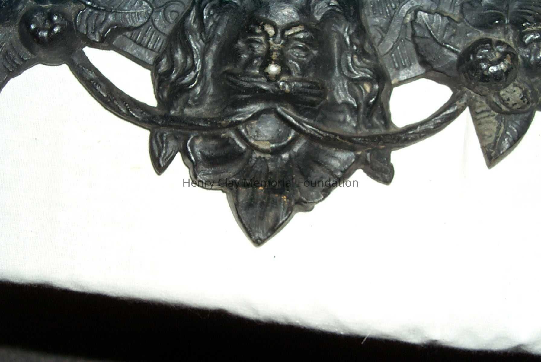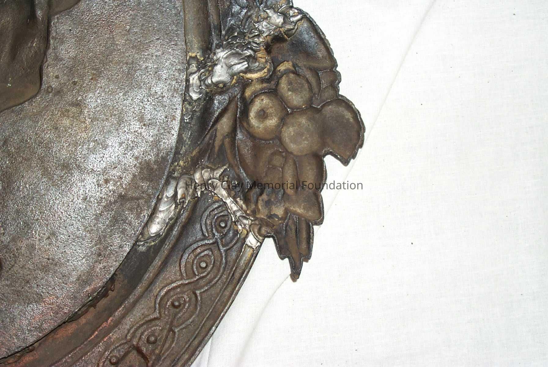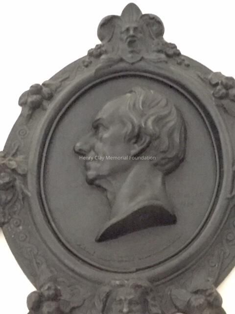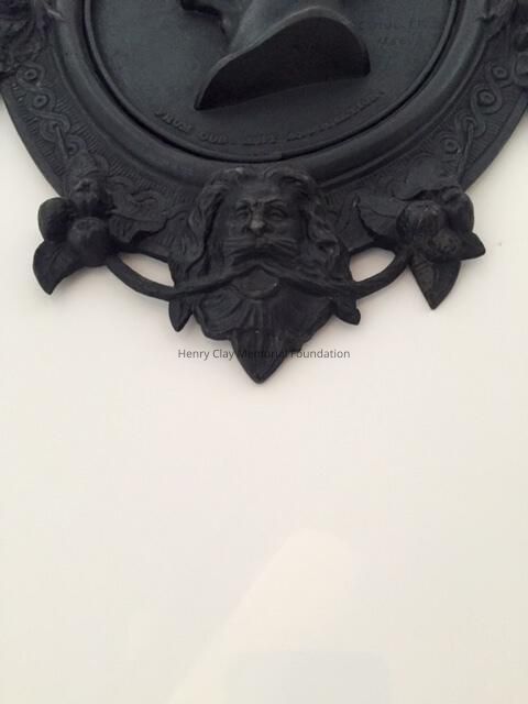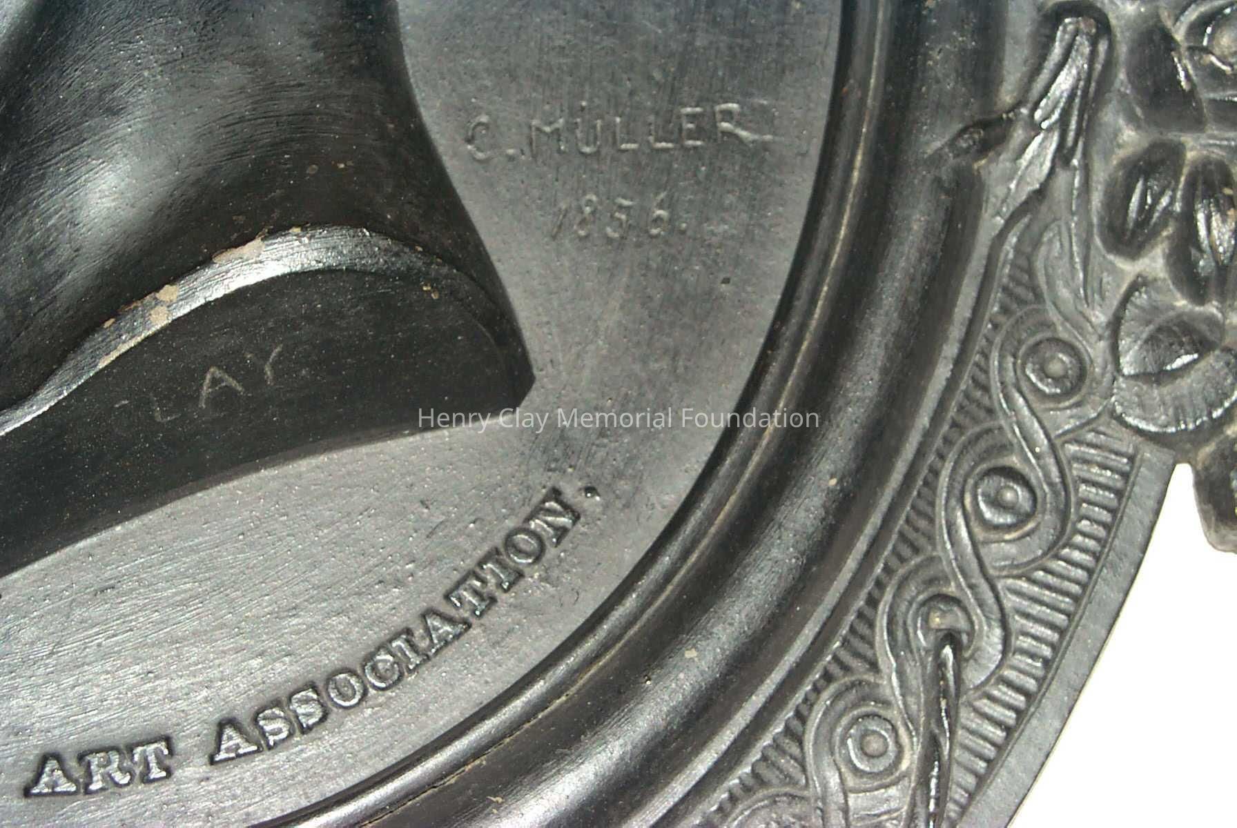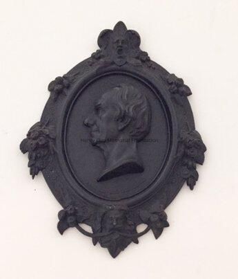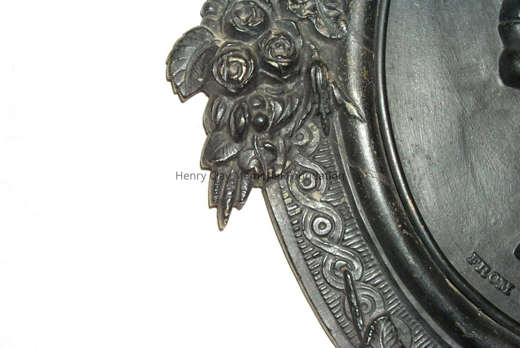 A cast iron plaque showing the bust image of Hery Clay. Image is left profile. Below image is inscription that reads: "From Cos. Art Association." To right of image is the inscription: "C.Muller. 1856." On bottom of neck of bust is the inscription: "Clay." Bust is framed with band inscribed with knot work and bearing faces of men at top and bottom, clusters of roses at right and left, and clusters of apples in between. Piece is mounted to hange with wire on back.Dimensions