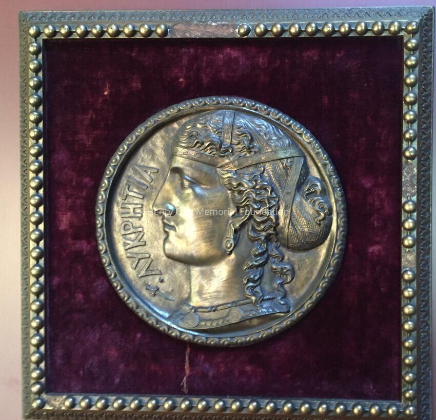 Classical plaque. Greek profile in metal. Greek letters spell Lucretia.