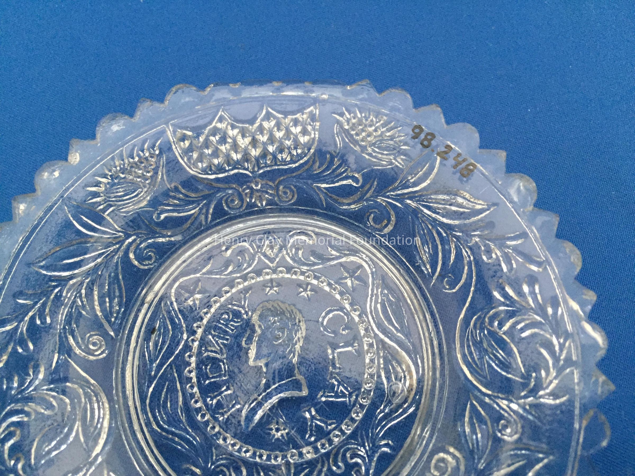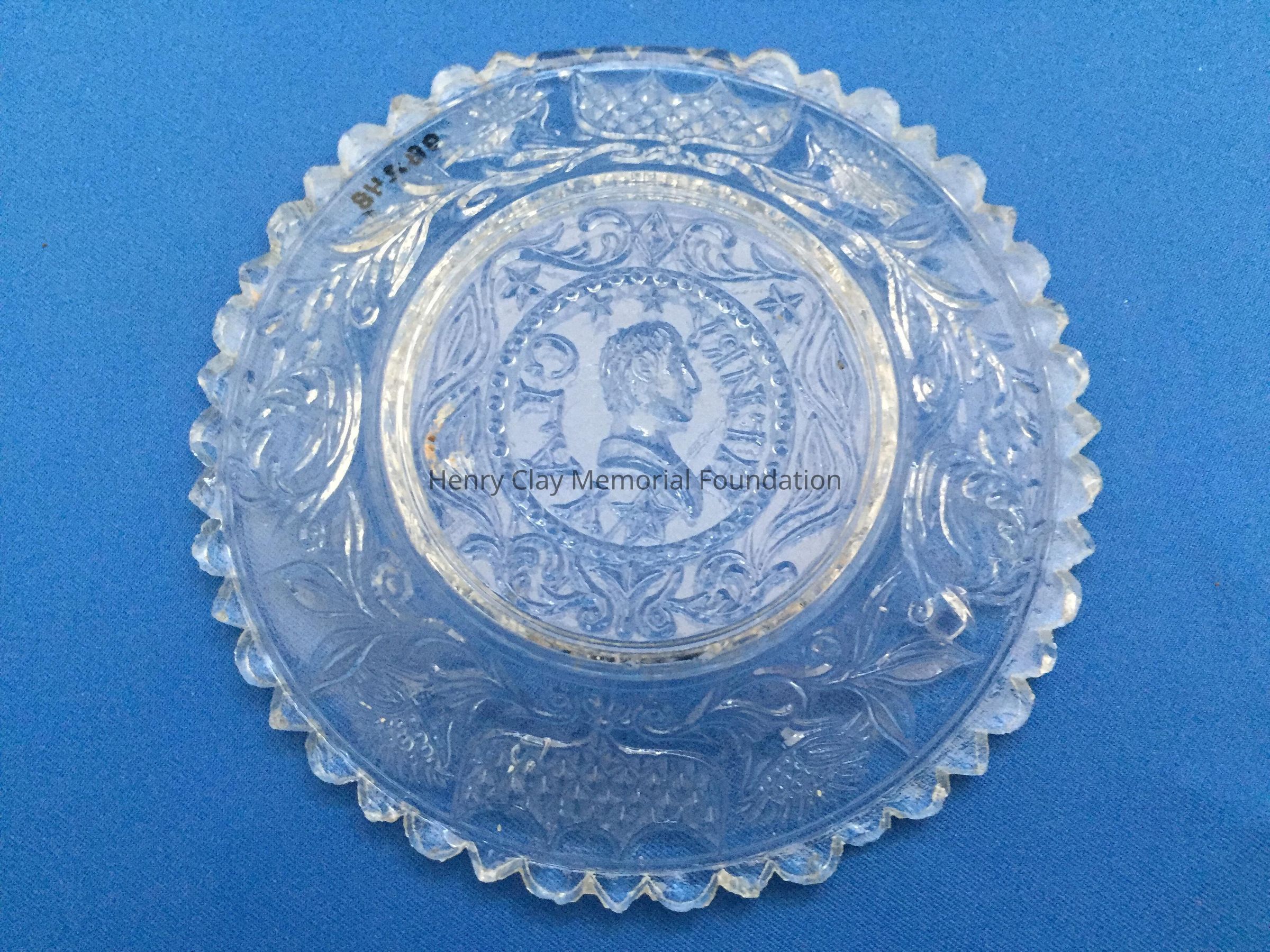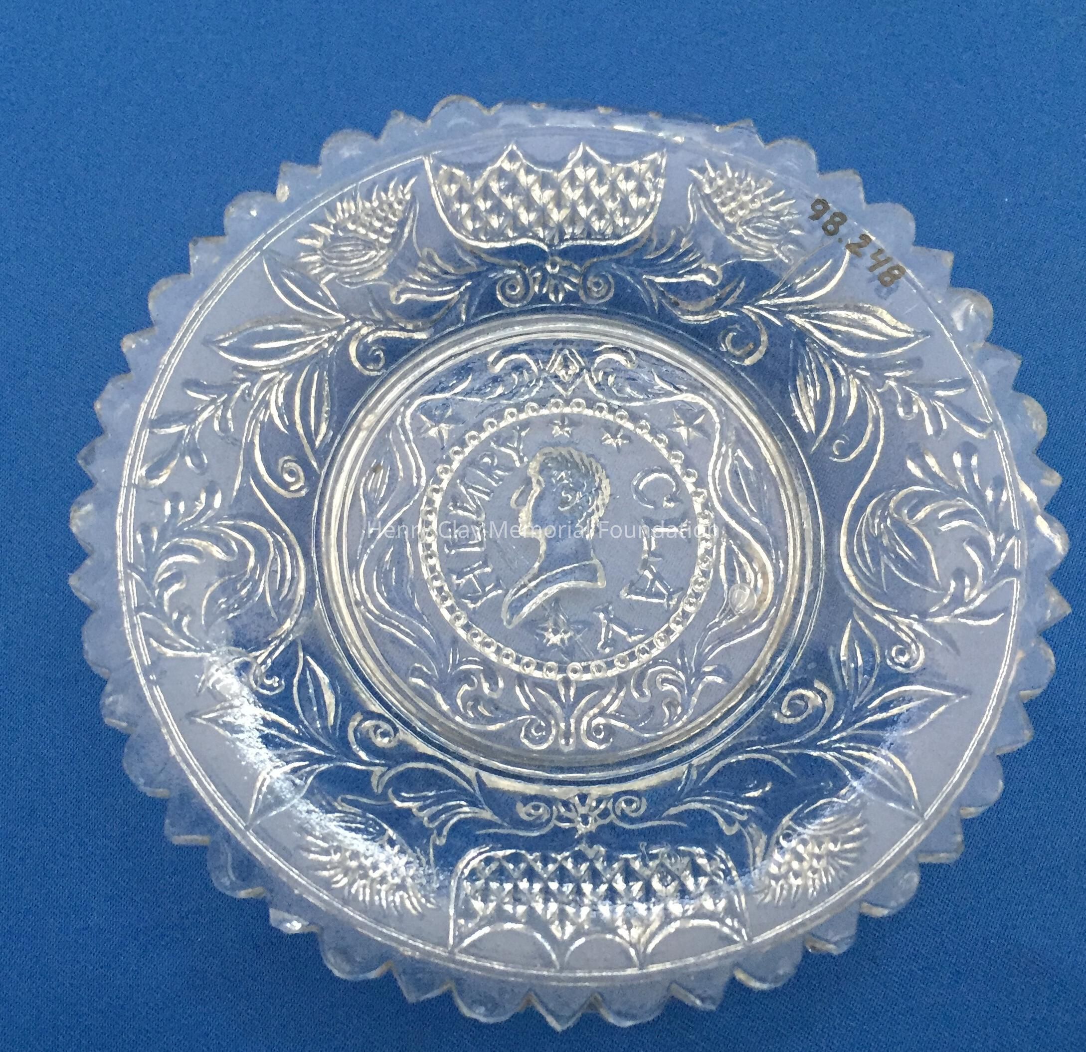 Pressed clear glass with a bust of Henry Clay facing left in the center. "Henry Clay" is around the bust with the letter "N" turned backwards. Two stars above his head and one below. Repeated designs around the border and scalloped edge with alternating rounded and pointed scallops.