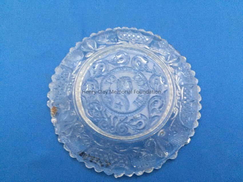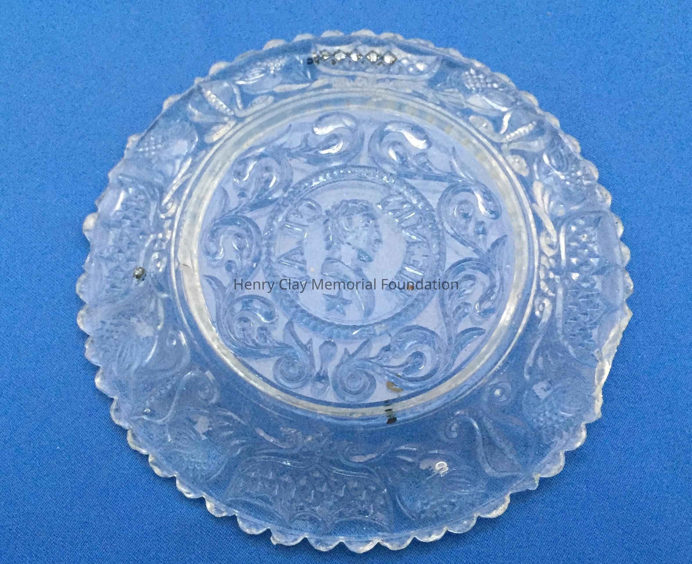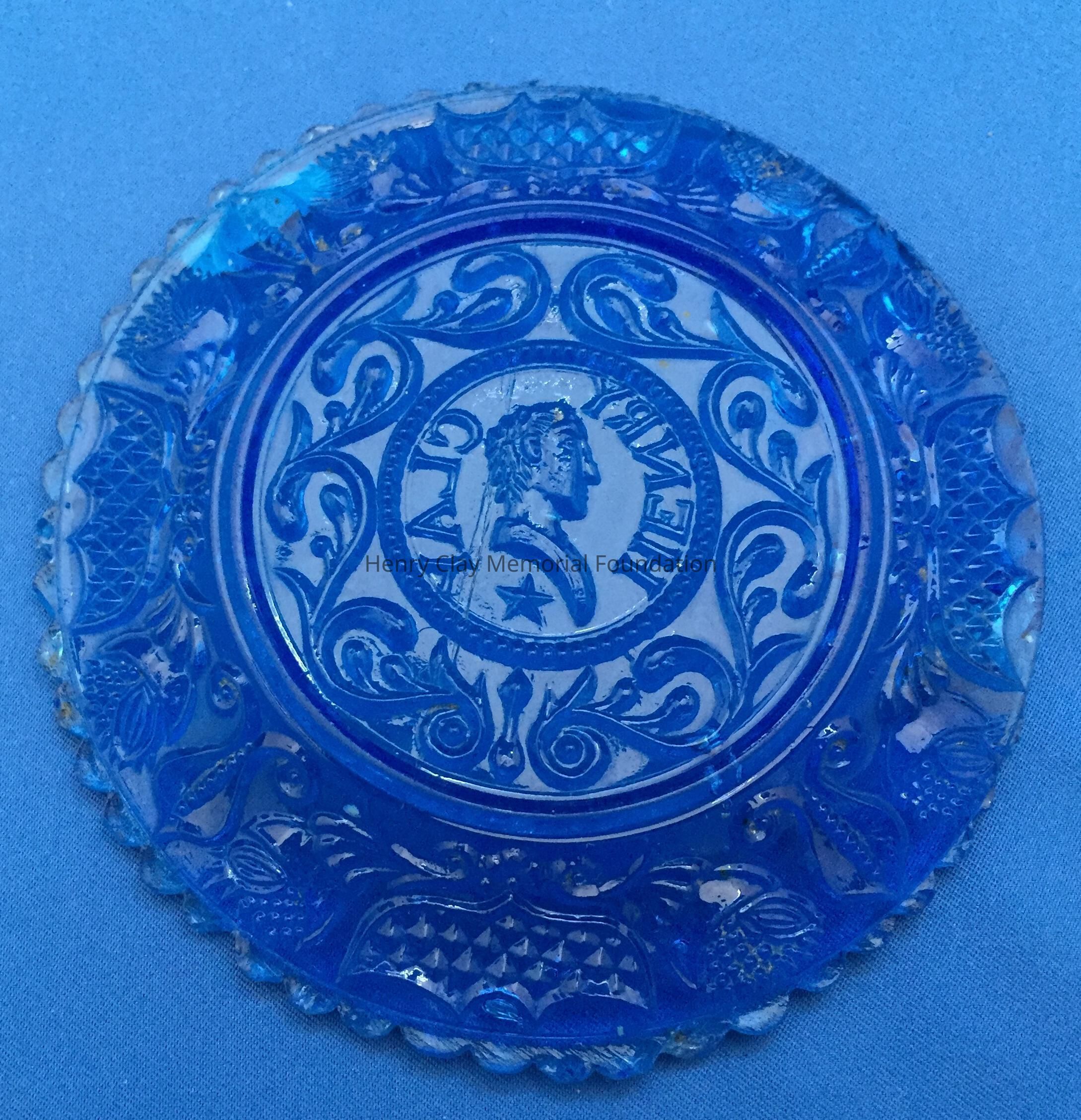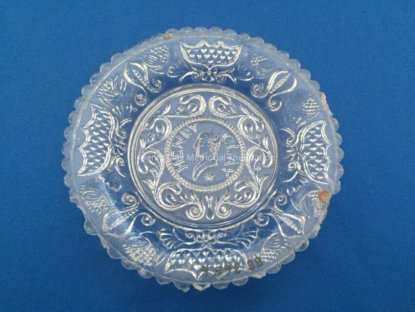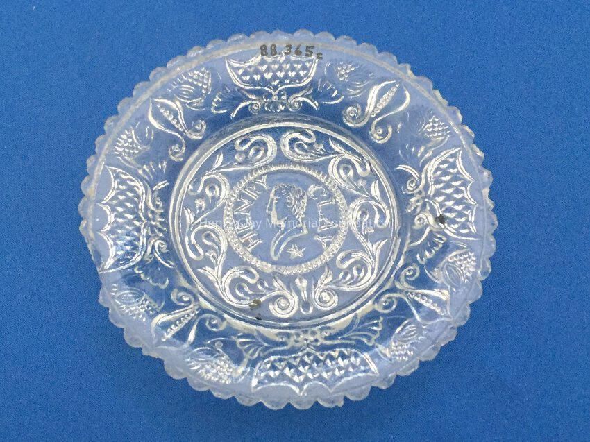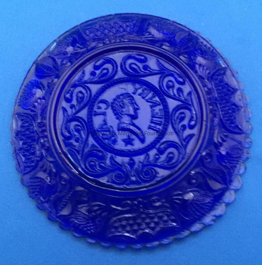 Small pressed glass plates with a bust of Henry Clay facing left in the center. "Henry Clay" is around the bust and star beneath him. There are repeated designs around border of plate with single scalloped edge of uniform sized scallops. Four of these plates are clear, one has a green tint and 3 are blue (one of the blue ones is a dark cobalt blue).Dimensions
