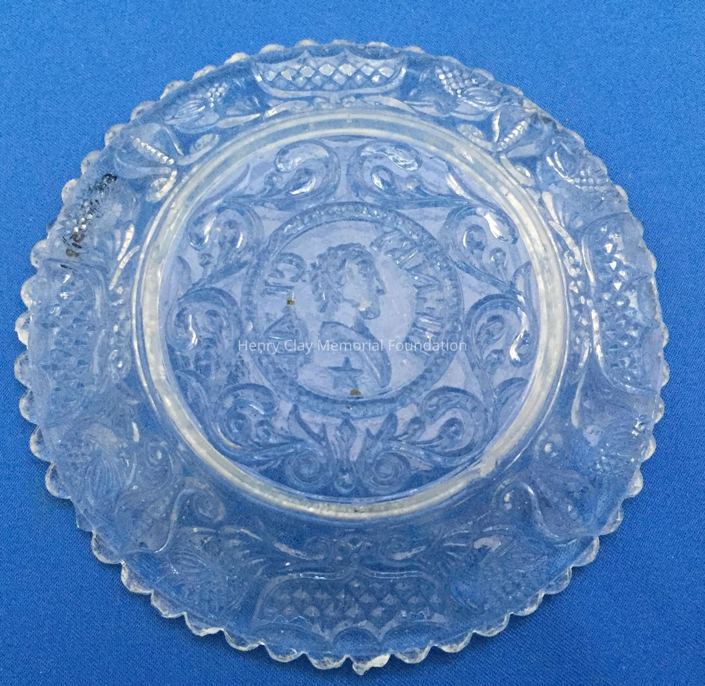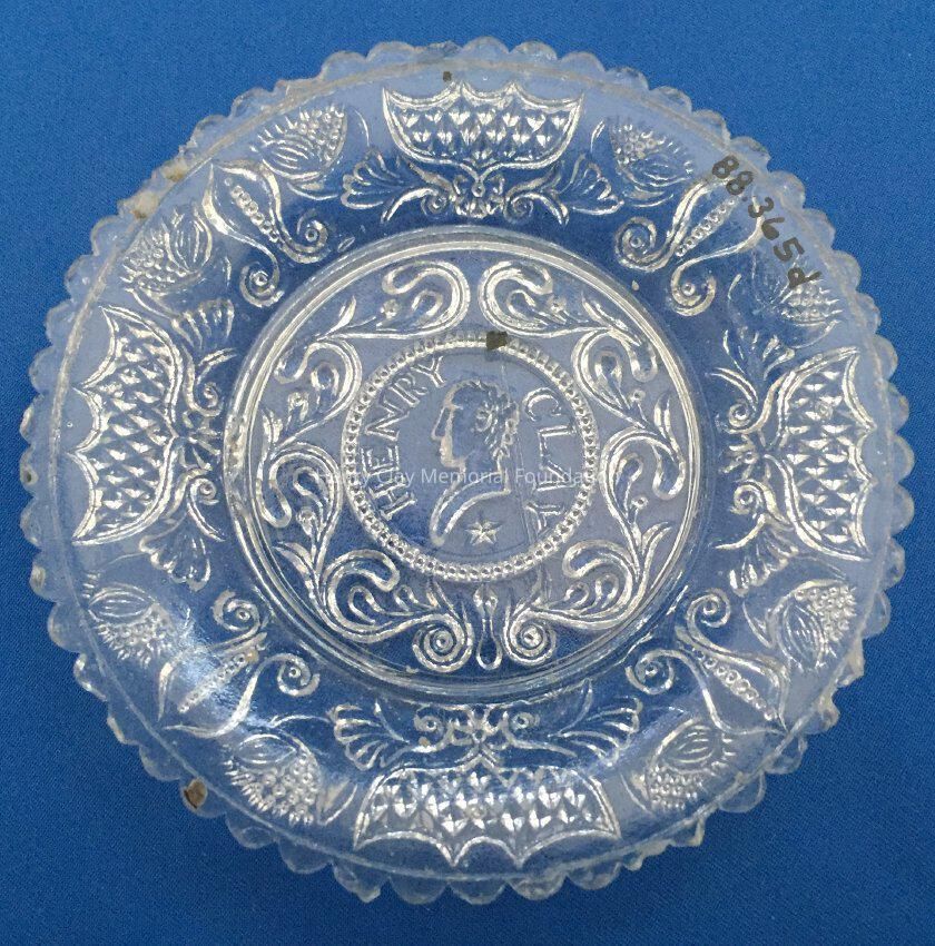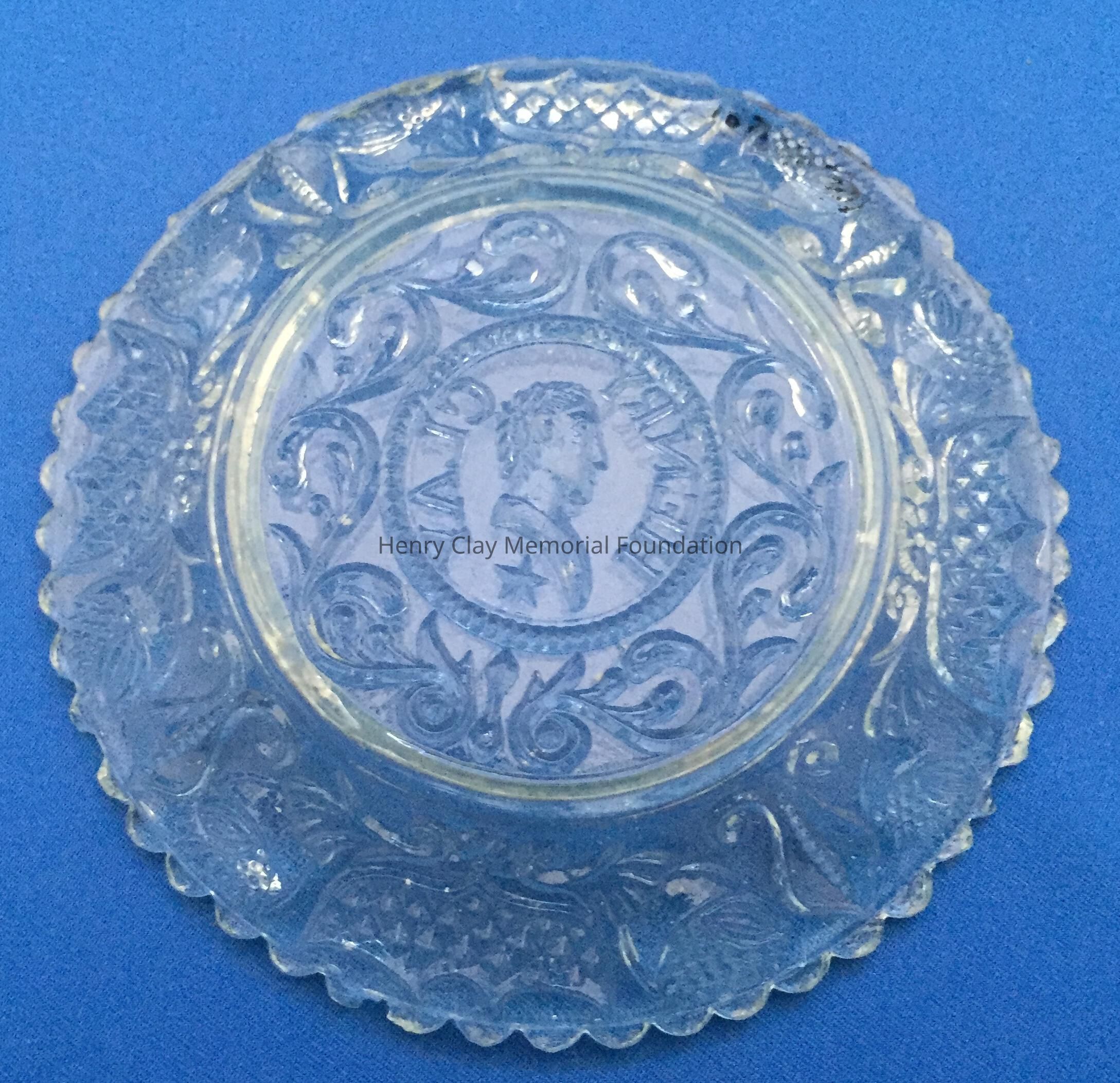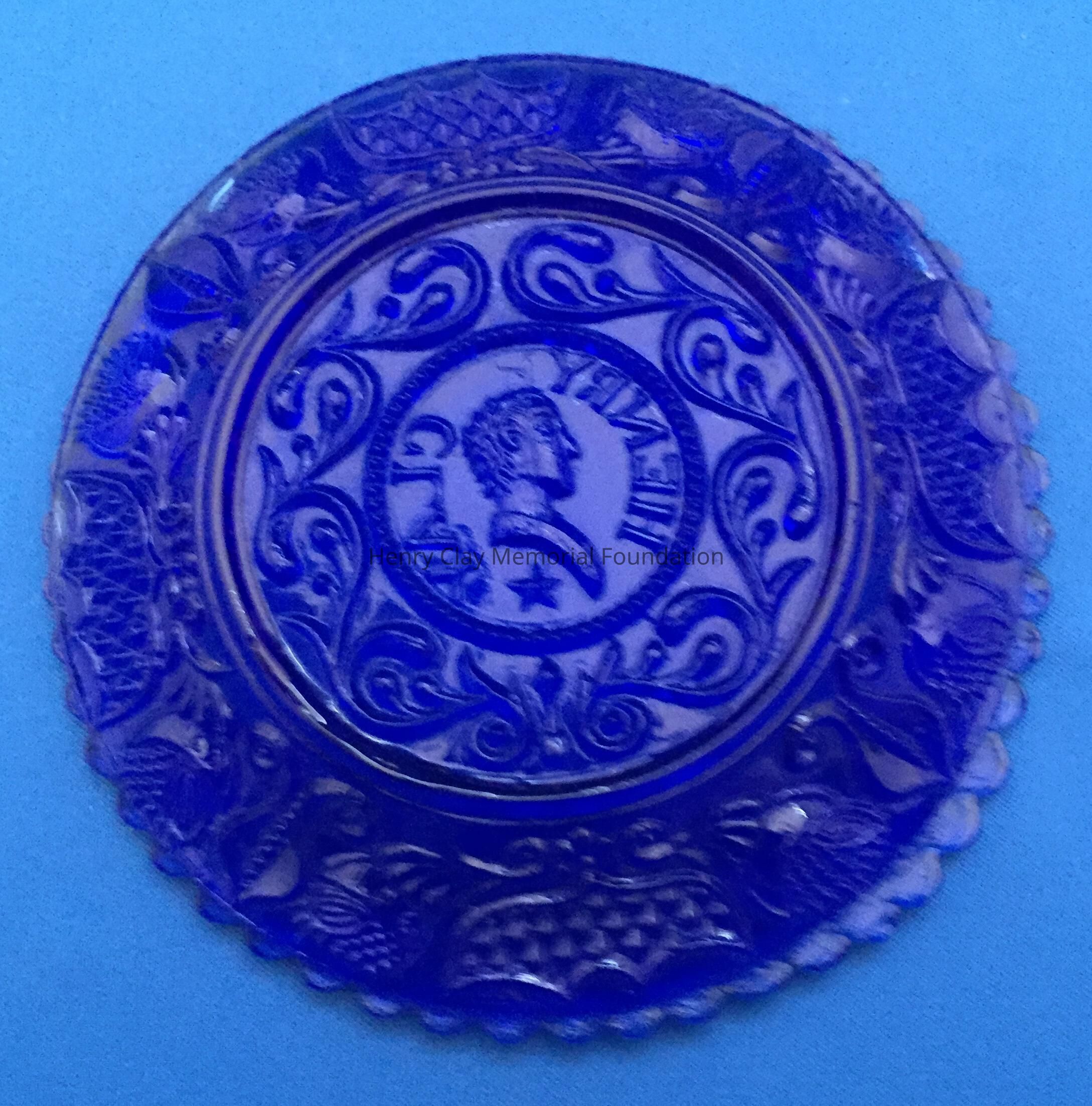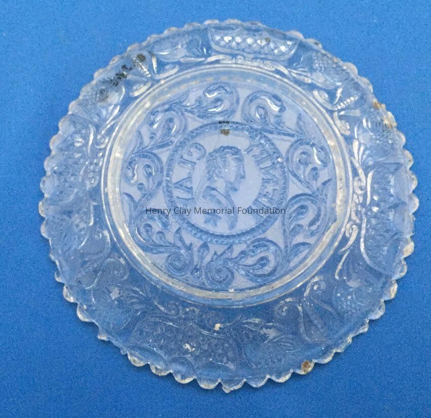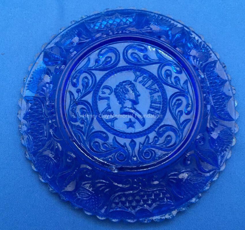 Small pressed glass plates with a bust of Henry Clay facing left in the center. "Henry Clay" is around the bust and star beneath him. There are repeated designs around border of plate with single scalloped edge of uniform sized scallops. Four of these plates are clear, one has a green tint and 3 are blue (one of the blue ones is a dark cobalt blue).Dimensions