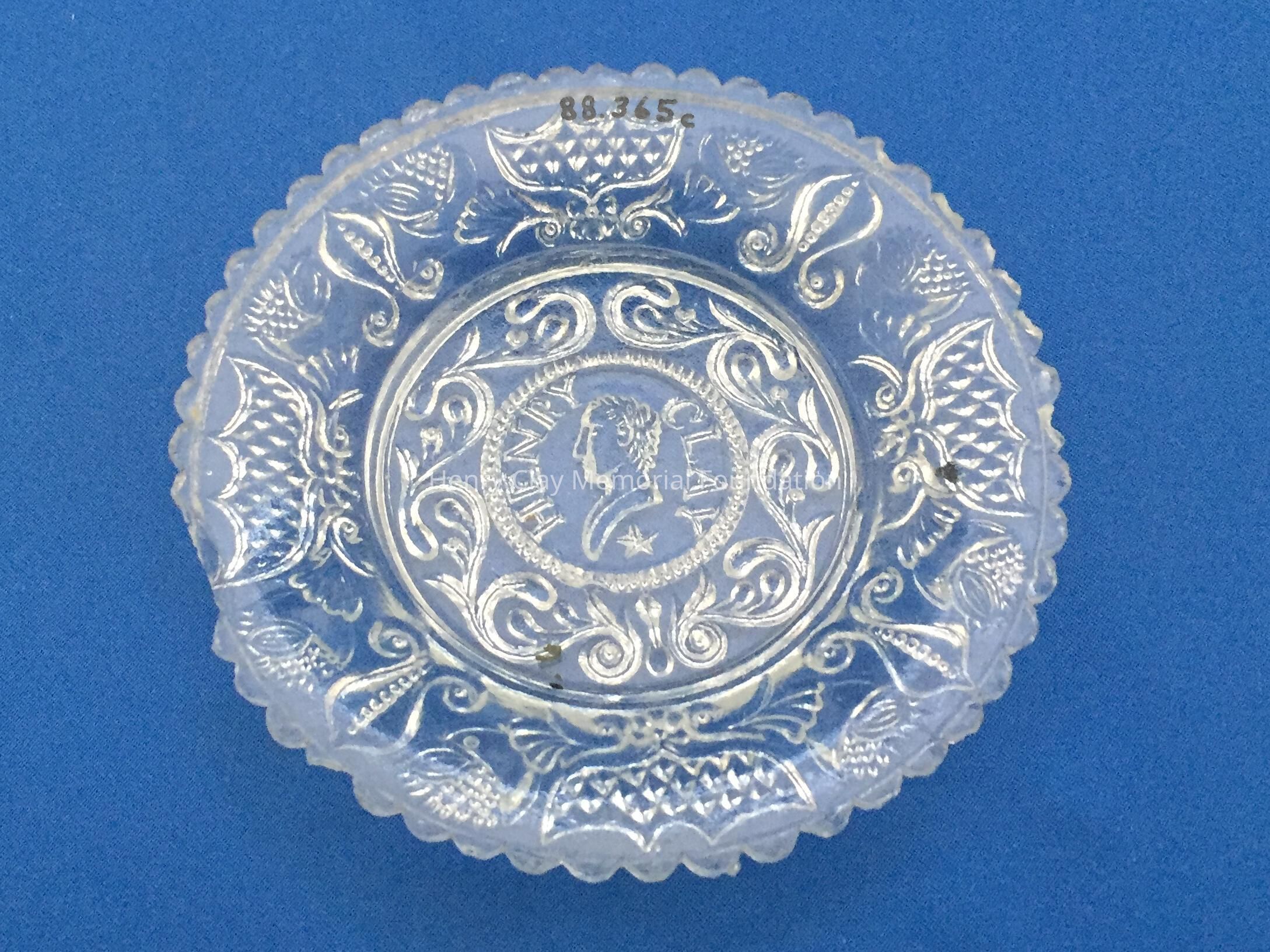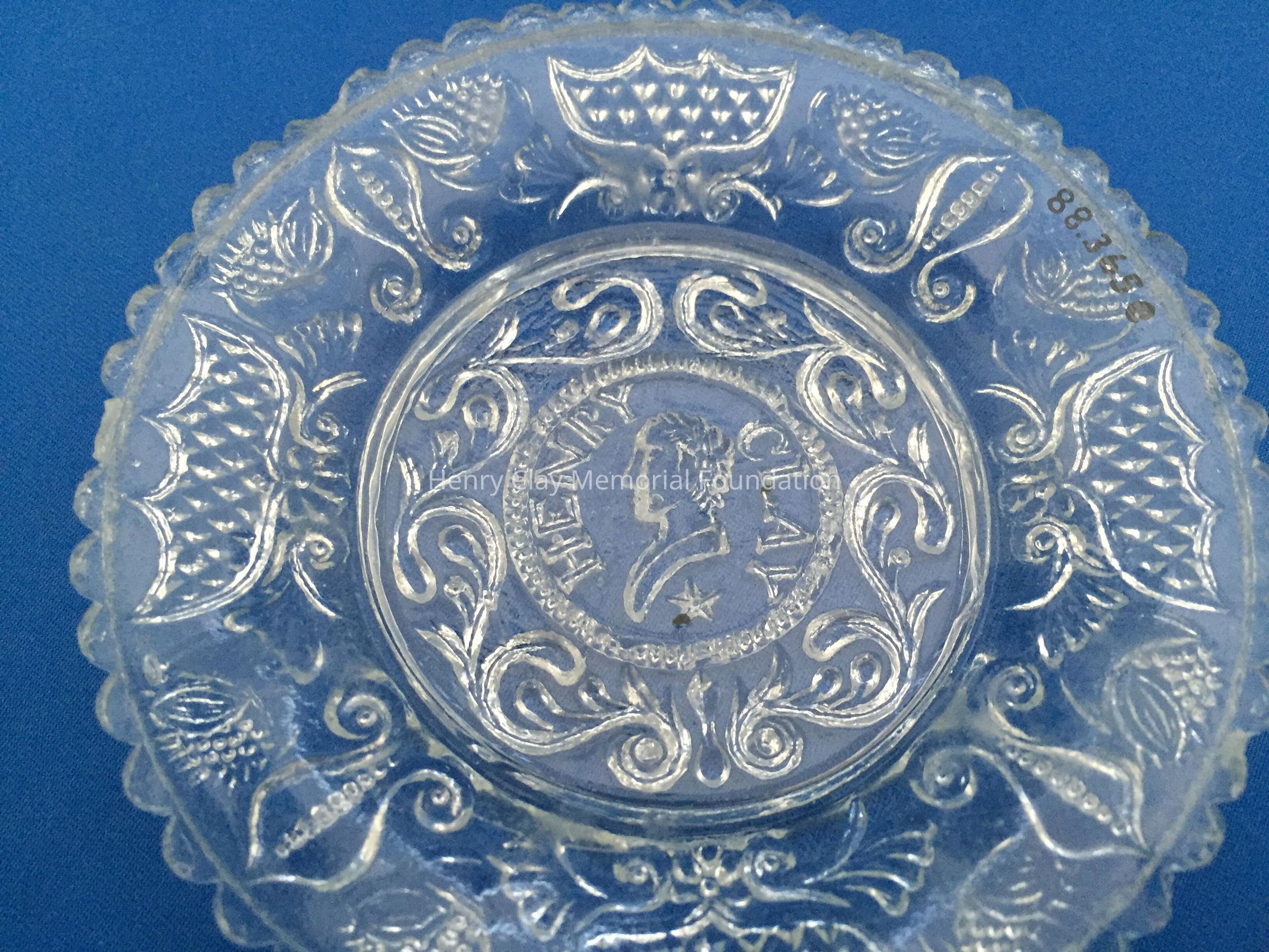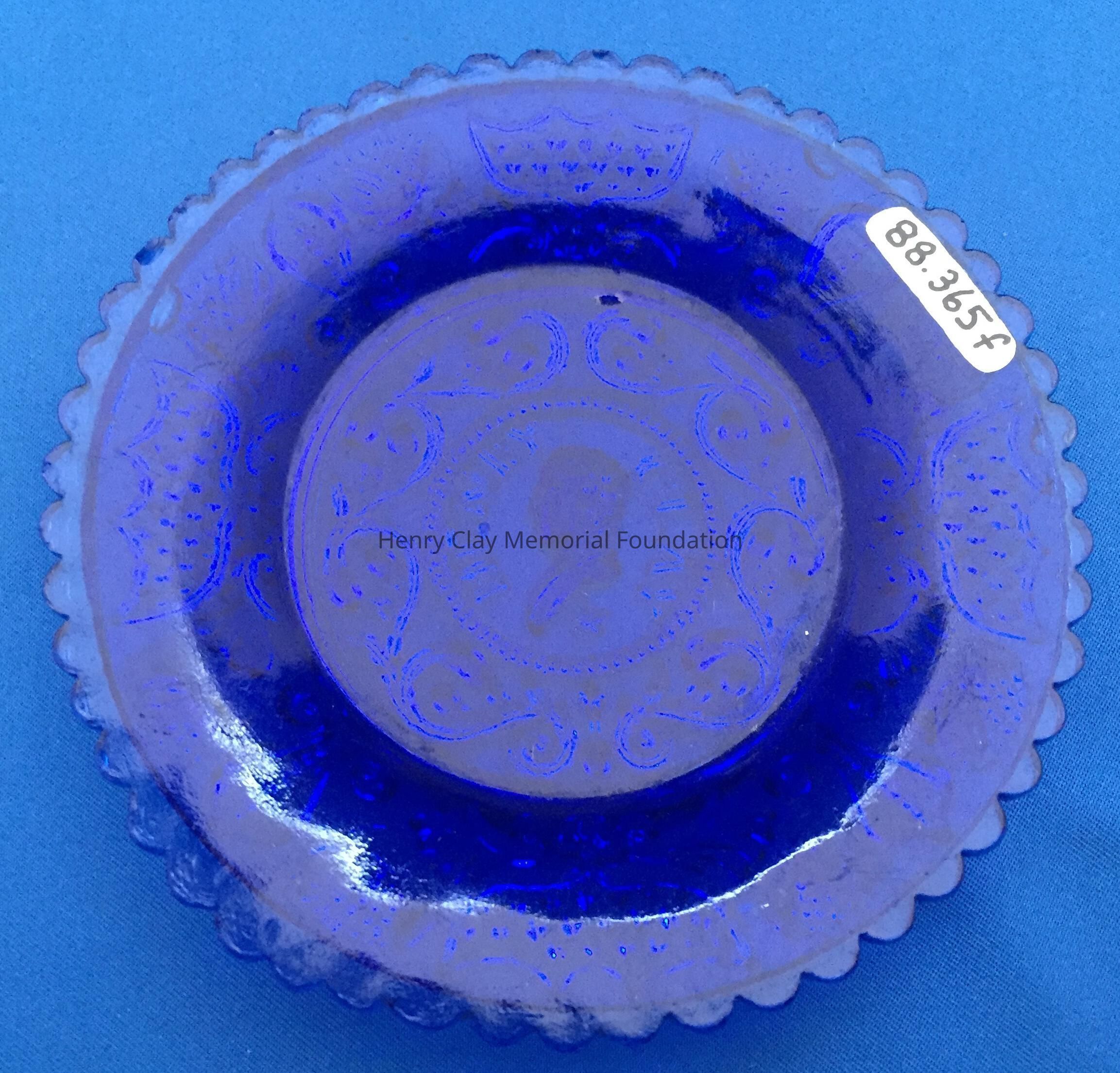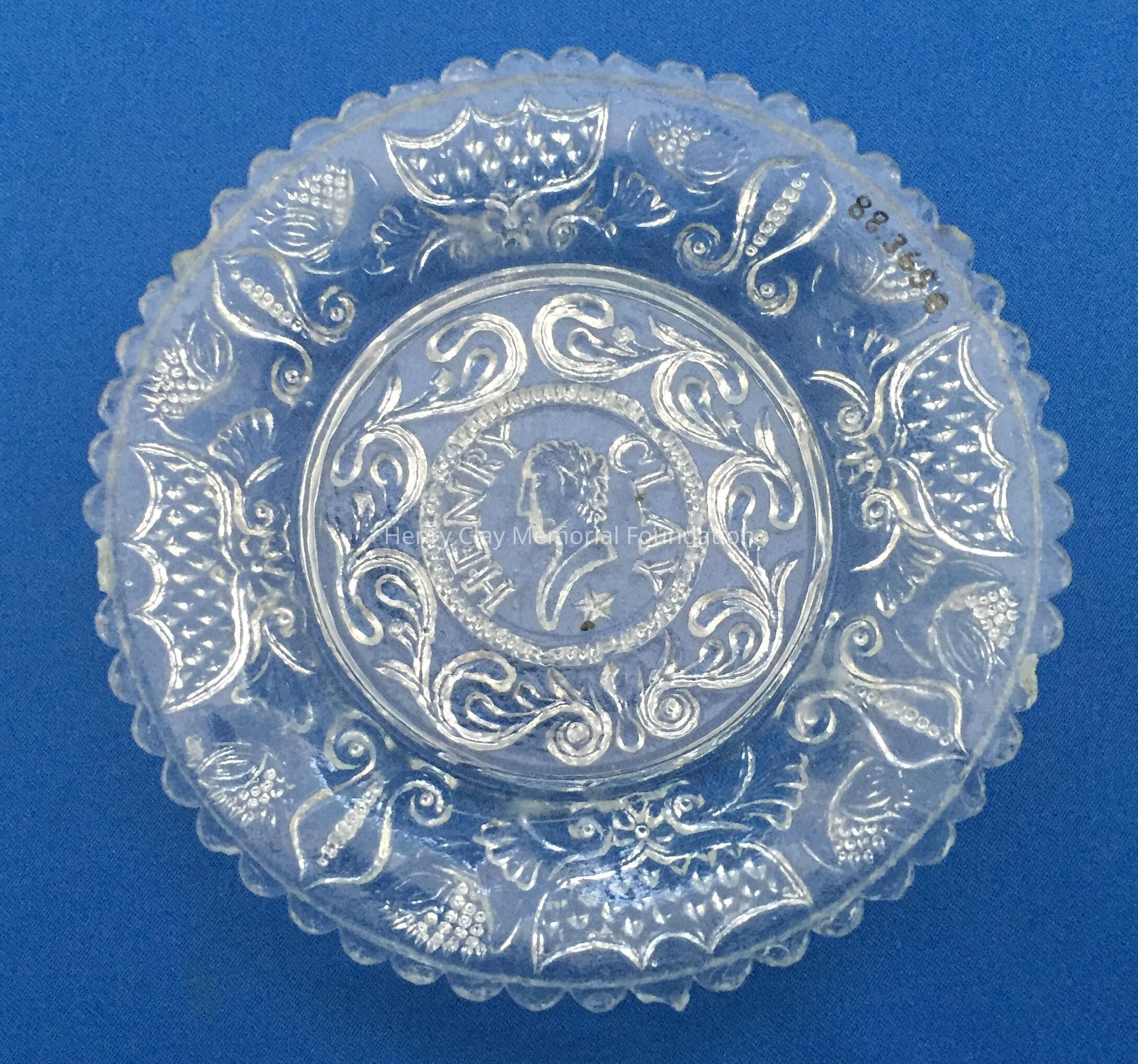 Small pressed glass plates with a bust of Henry Clay facing left in the center. "Henry Clay" is around the bust and star beneath him. There are repeated designs around border of plate with single scalloped edge of uniform sized scallops. Four of these plates are clear, one has a green tint and 3 are blue (one of the blue ones is a dark cobalt blue).Dimensions