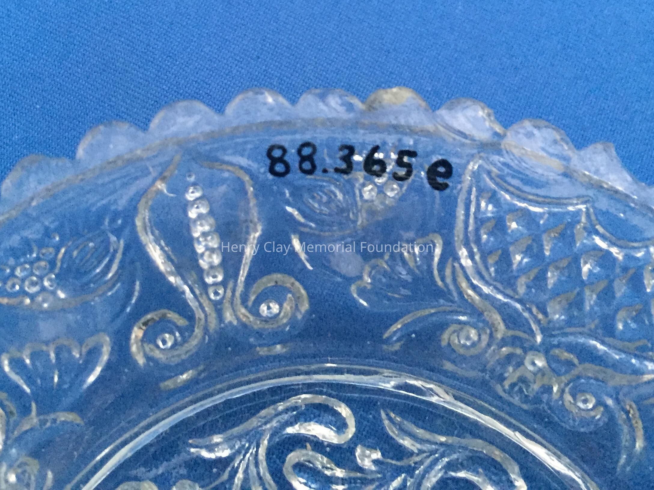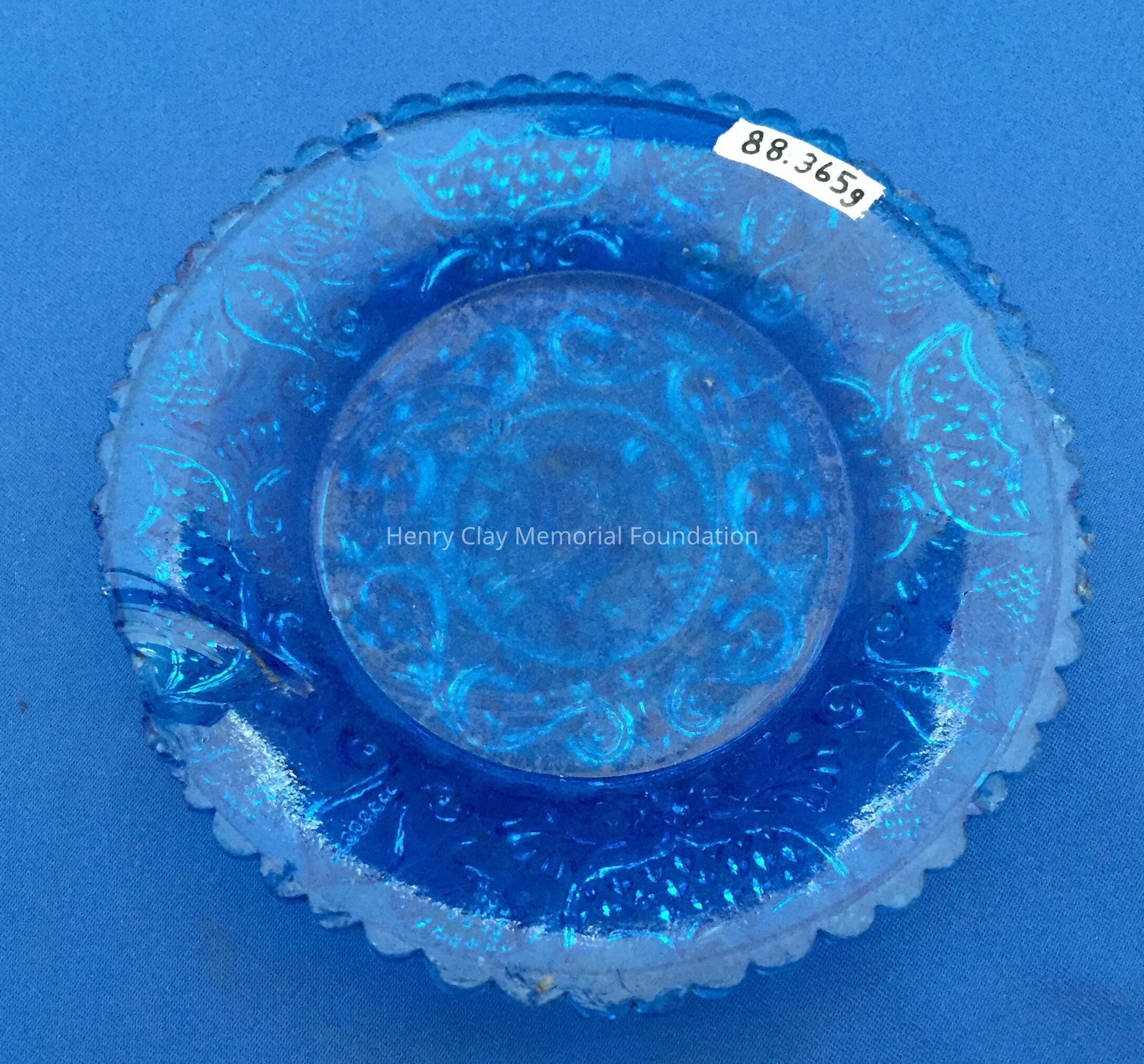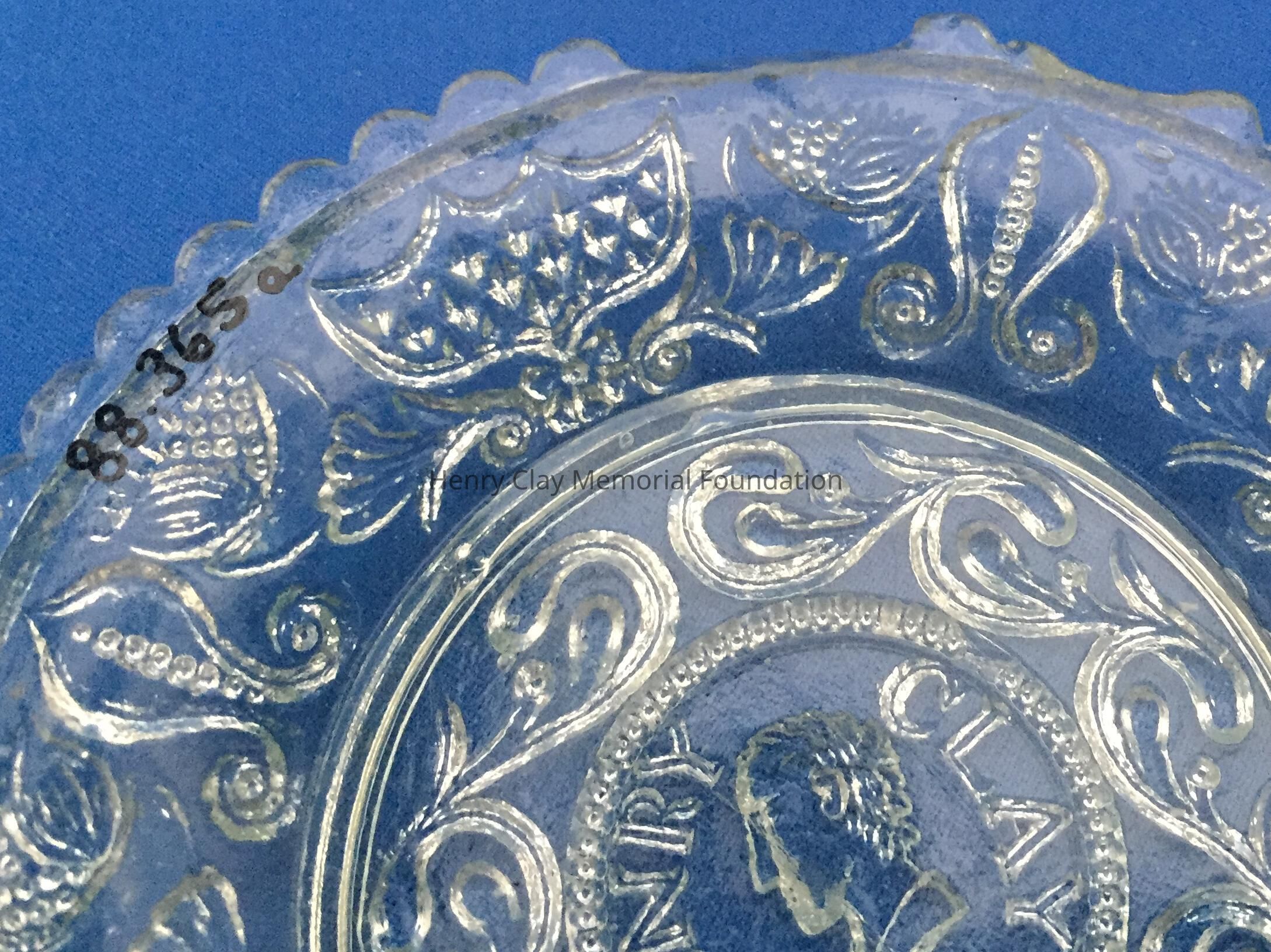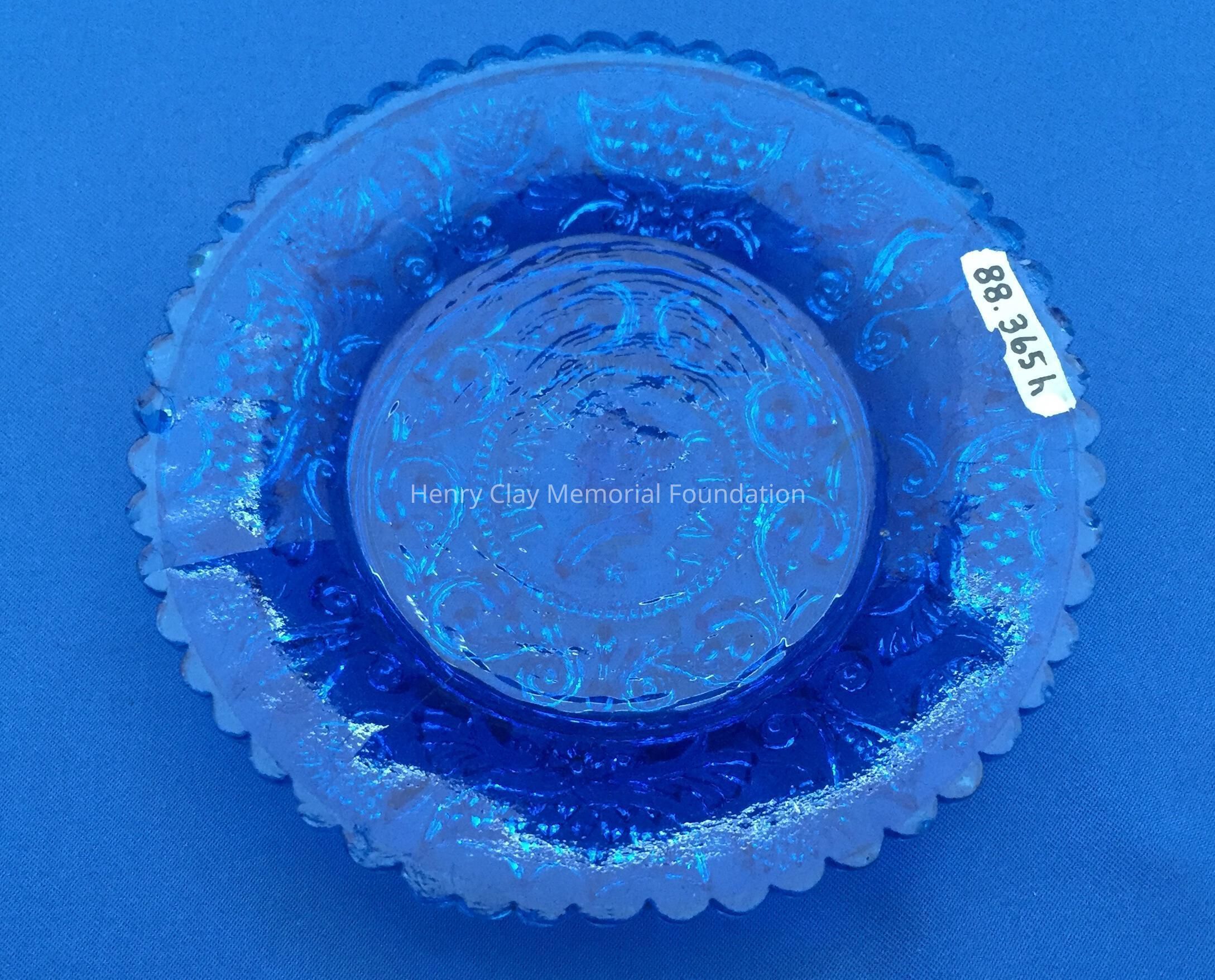 Small pressed glass plates with a bust of Henry Clay facing left in the center. "Henry Clay" is around the bust and star beneath him. There are repeated designs around border of plate with single scalloped edge of uniform sized scallops. Four of these plates are clear, one has a green tint and 3 are blue (one of the blue ones is a dark cobalt blue).Dimensions