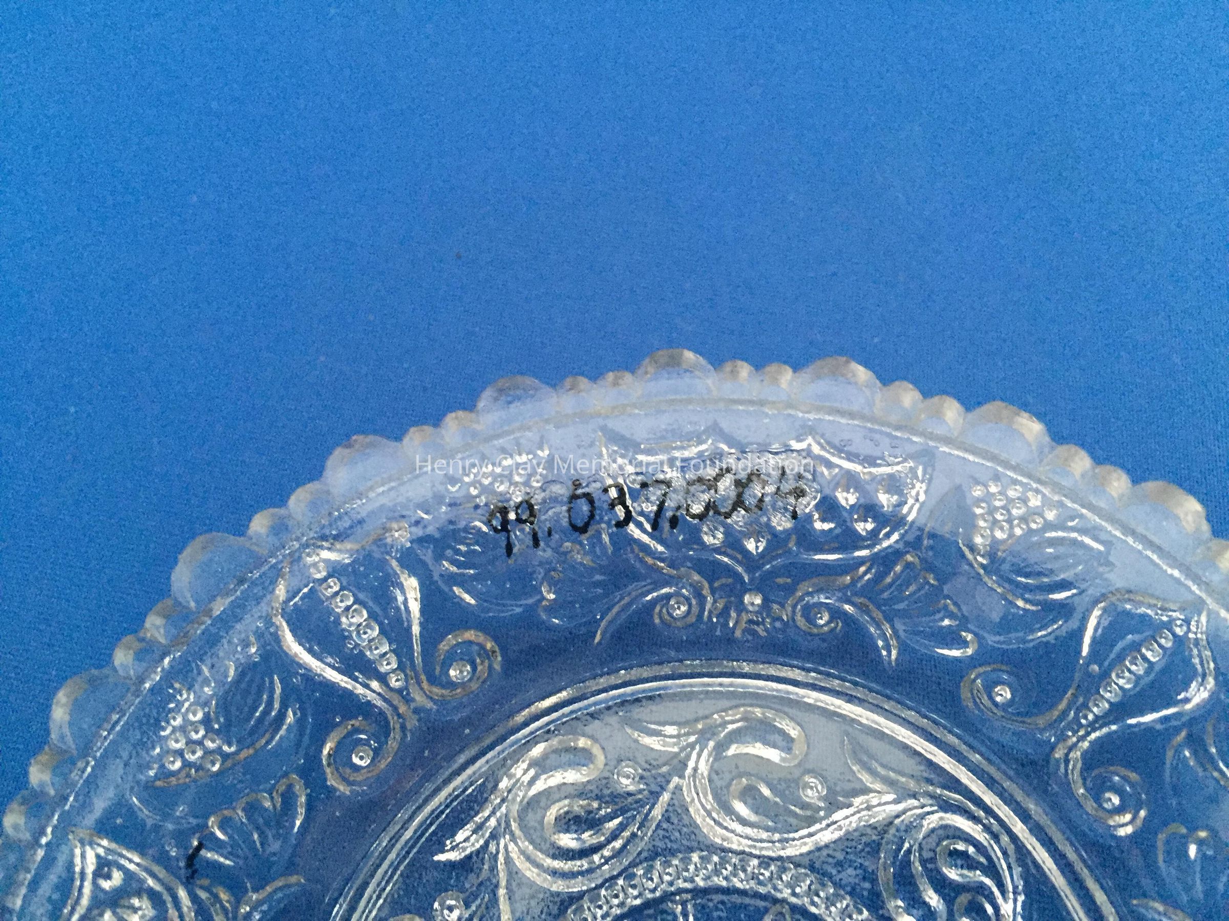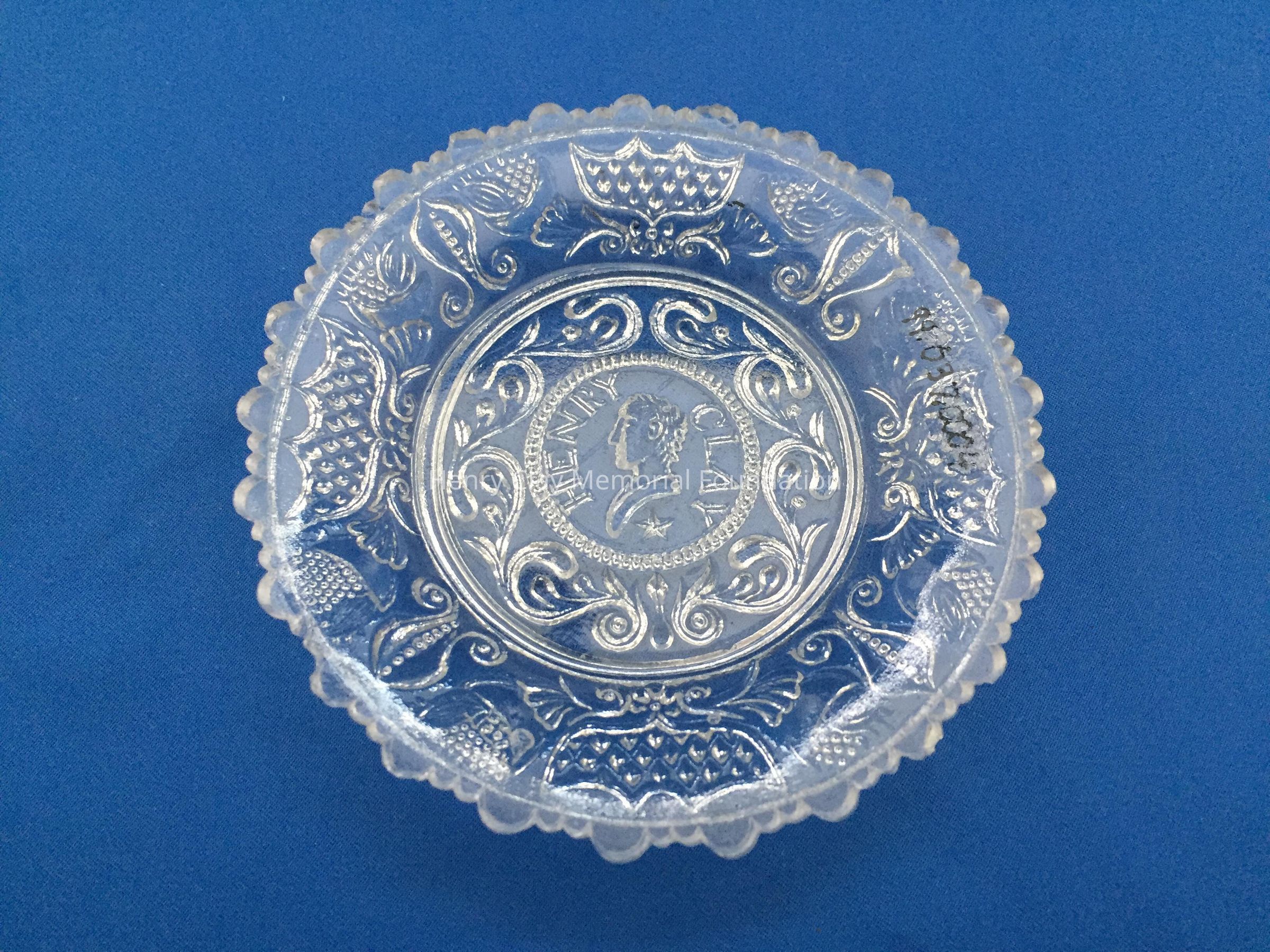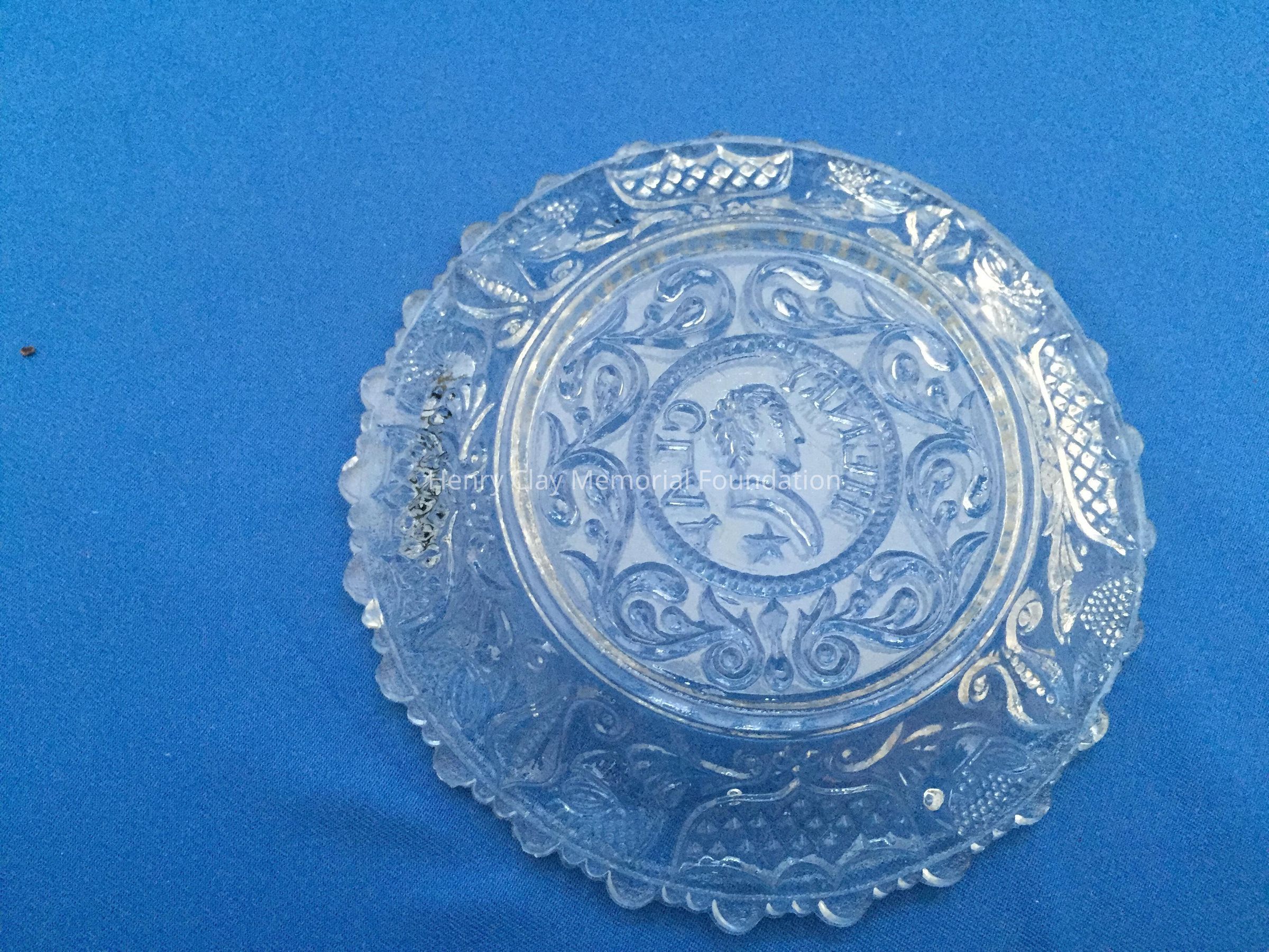Clear pressed glass with a bust of Henry Clay, left profile, in the center. Bust is flanked by the words "Henry Clay." A single star is beneath the bust. Designs in an outer circle surround Clay. Scalloped edge on the outside, one large scallop followed by two small scallops is repeated.Dimensions