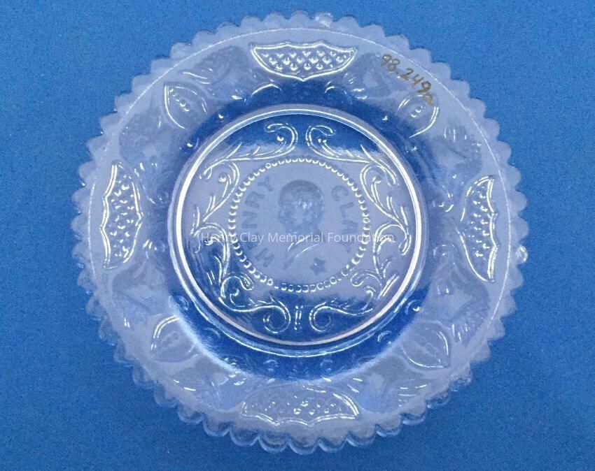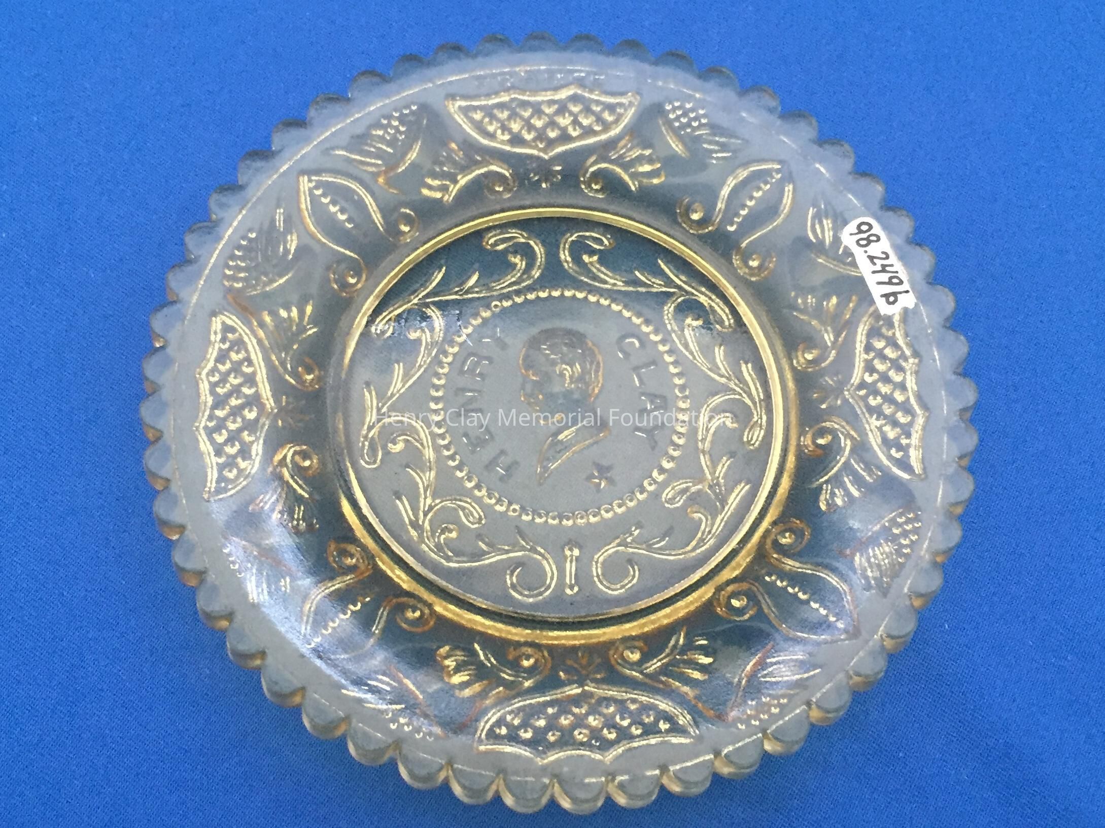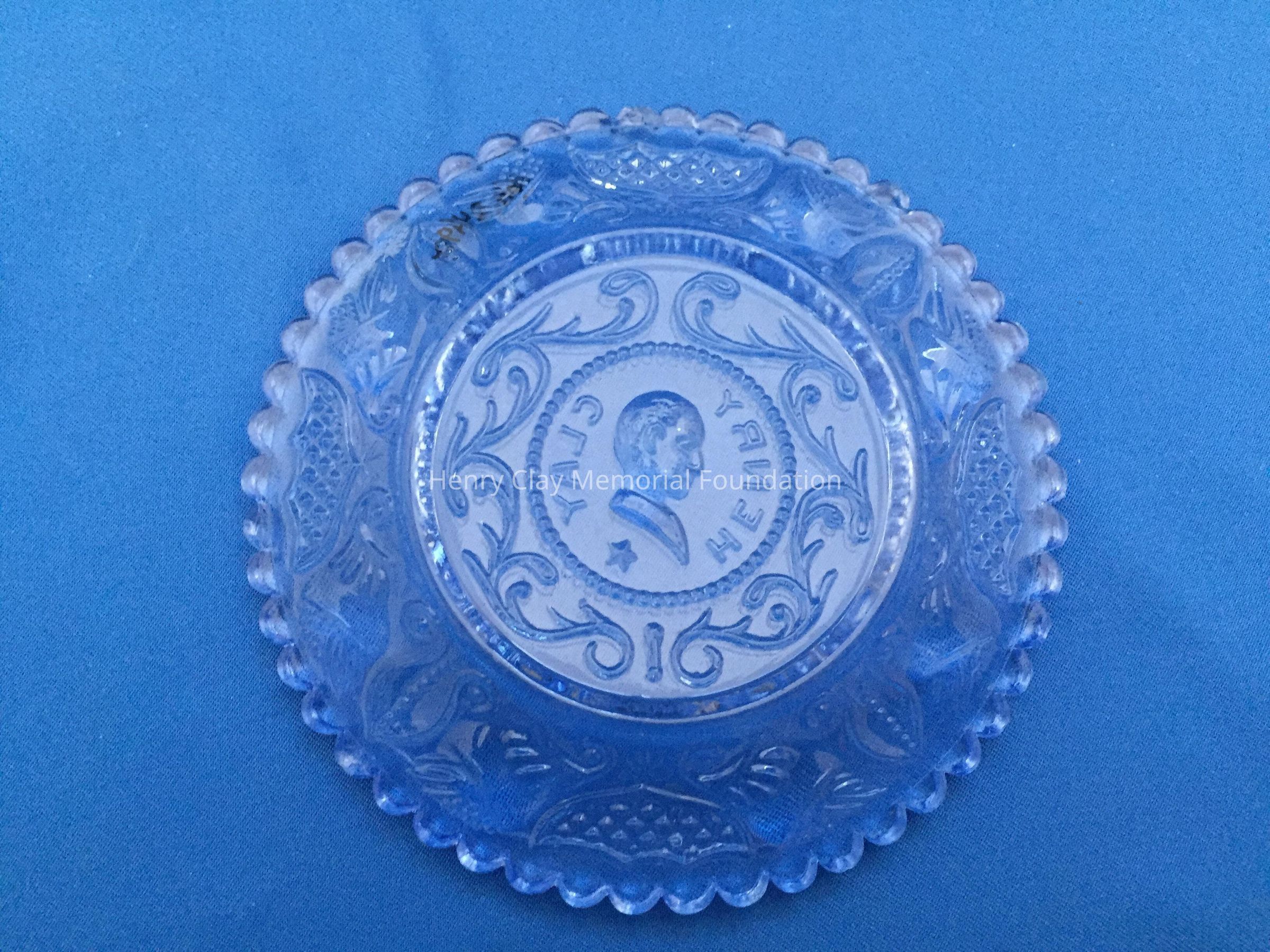 B) One yellow and A) one blue tint pressed glass with bust of Henry Clay facing left in the center. "Henry Clay" is around the bust with a star beneath. Repeated designs around the border, though not as detailed as on other cup plates. Single scalloped edge.Dimensions
