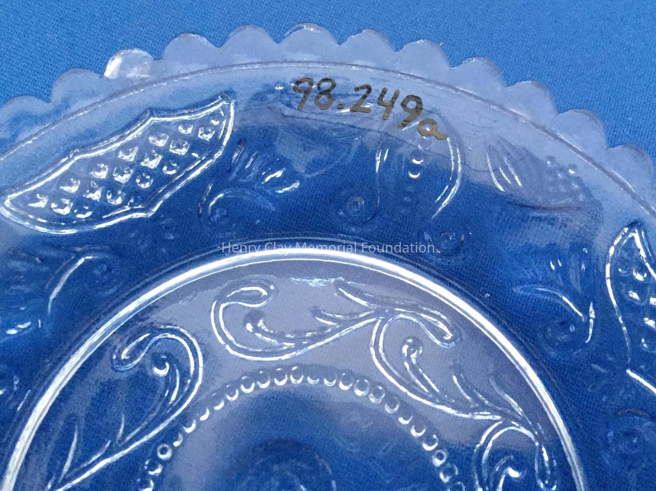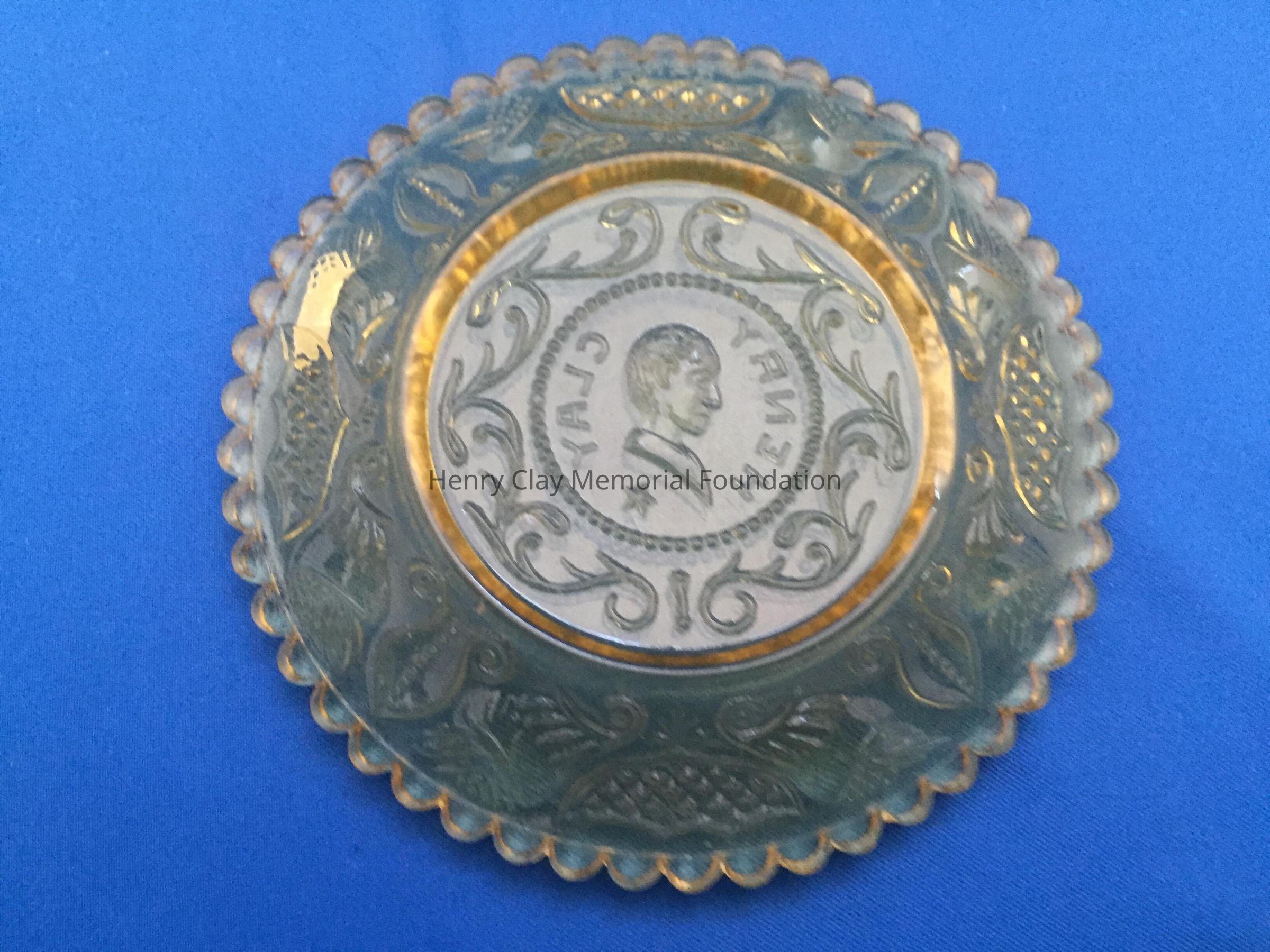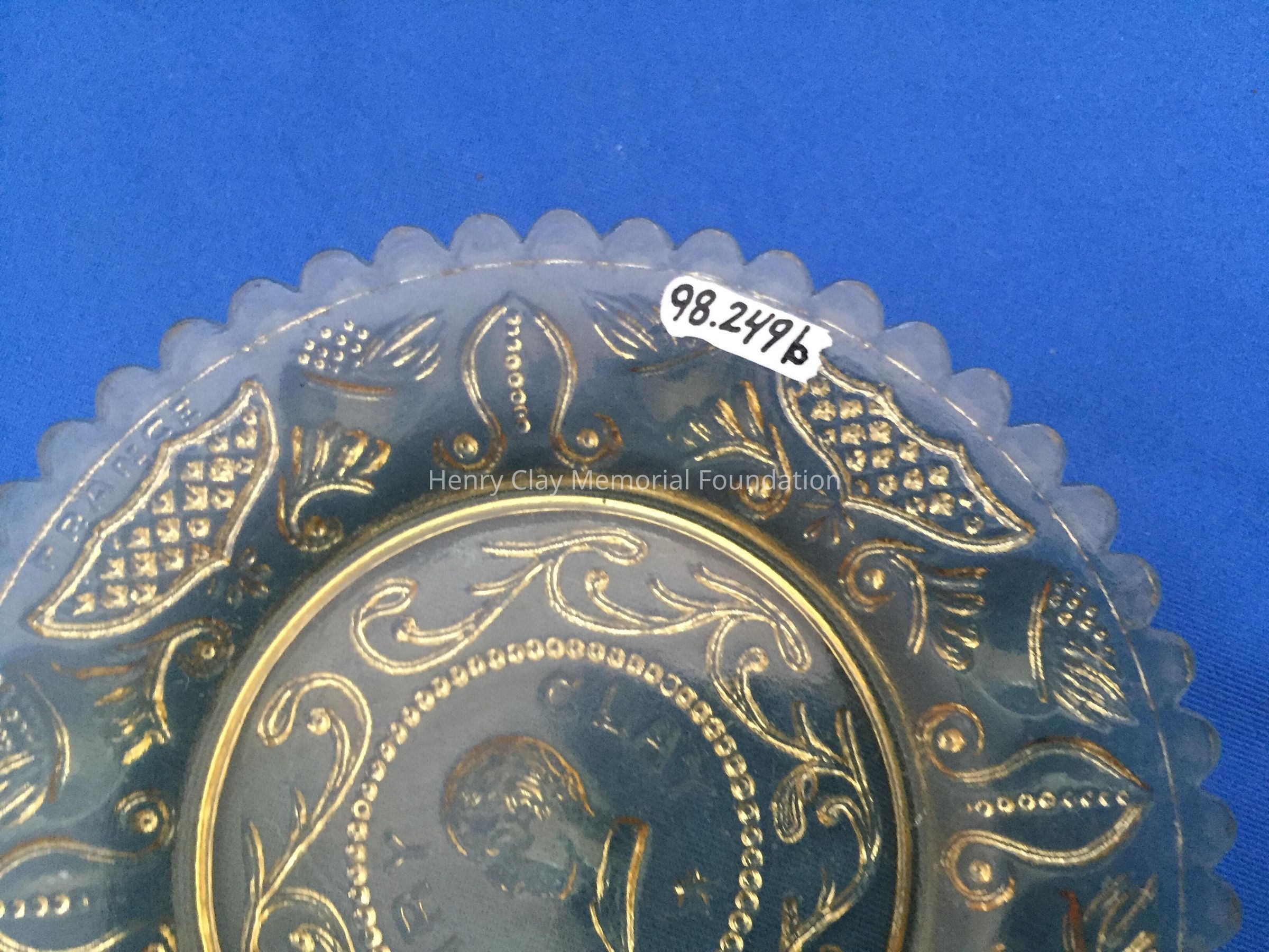 B) One yellow and A) one blue tint pressed glass with bust of Henry Clay facing left in the center. "Henry Clay" is around the bust with a star beneath. Repeated designs around the border, though not as detailed as on other cup plates. Single scalloped edge.Dimensions