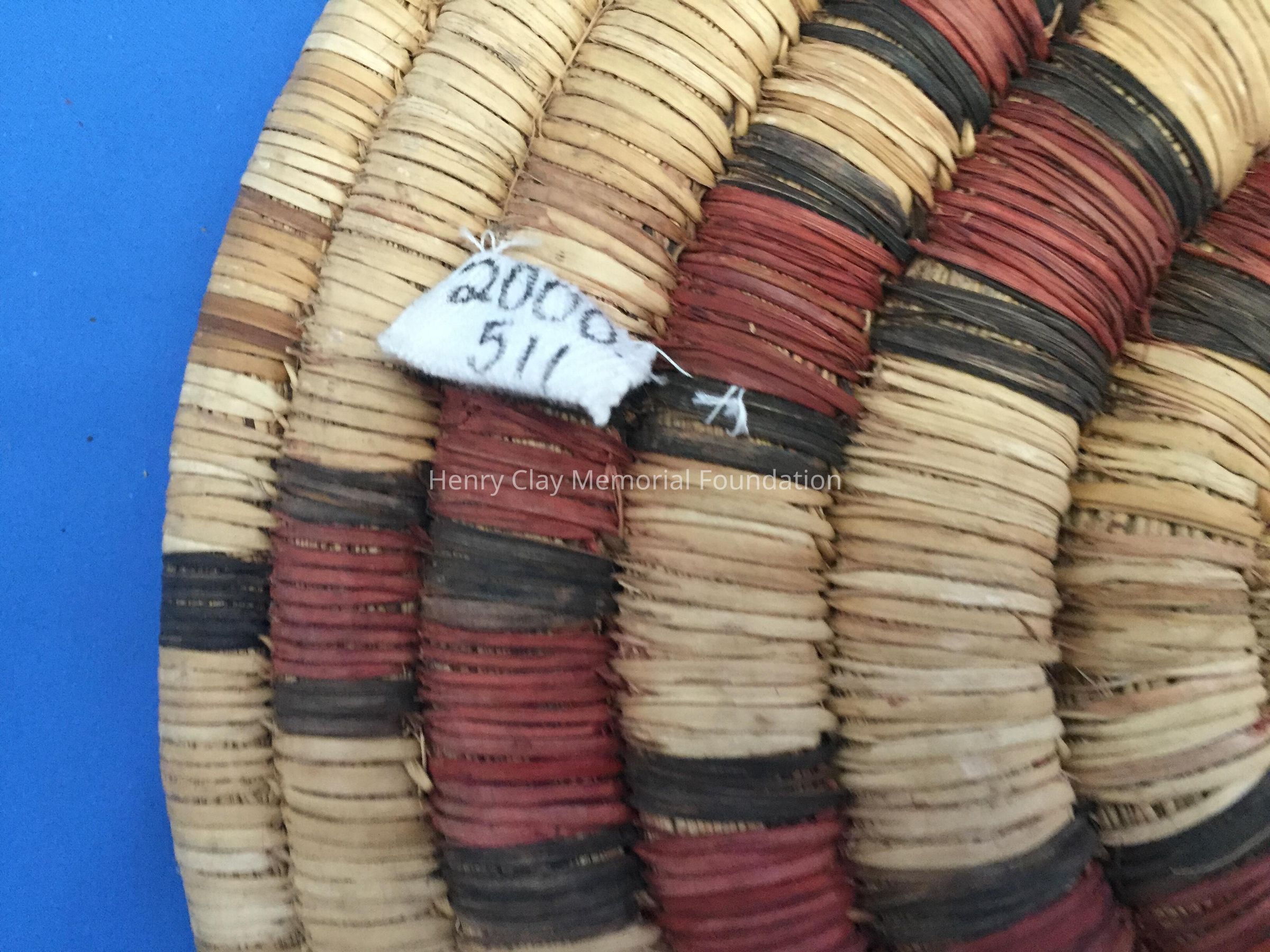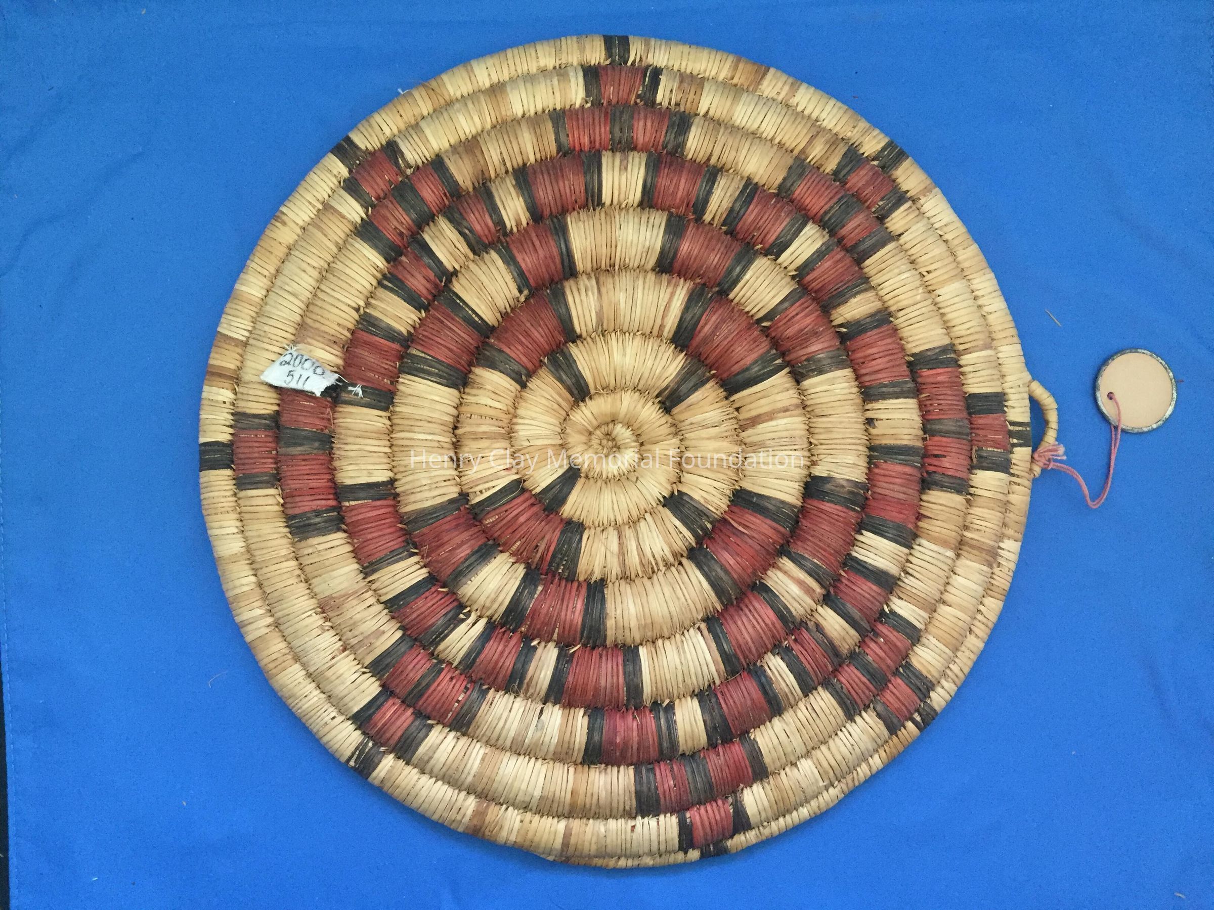 Flat coiled disk made from woven fibers of plant life. Tan in color with brown and maroon segments. There is a small woven handle on the outside and a small paper label hanging from it marked "2.50."