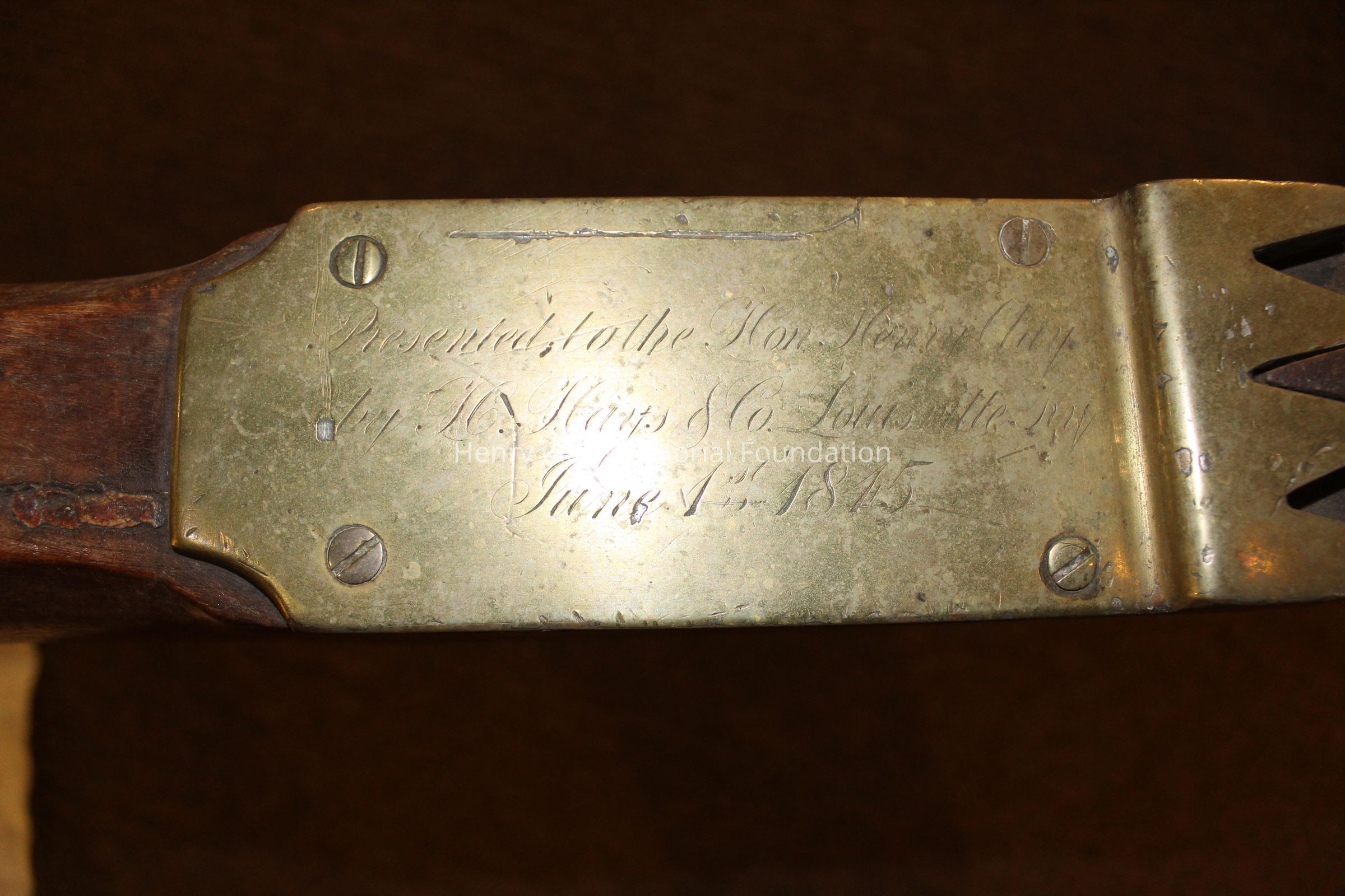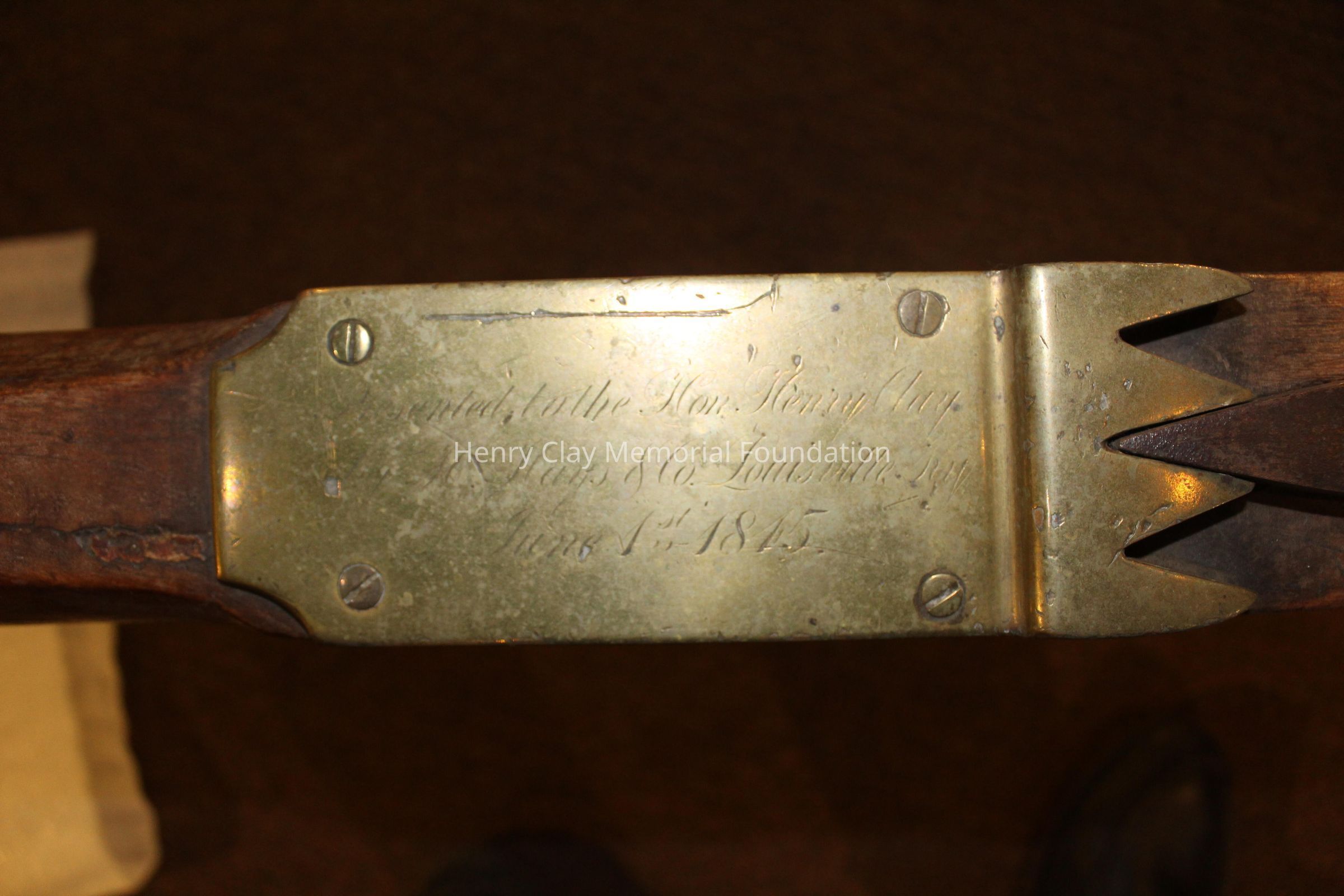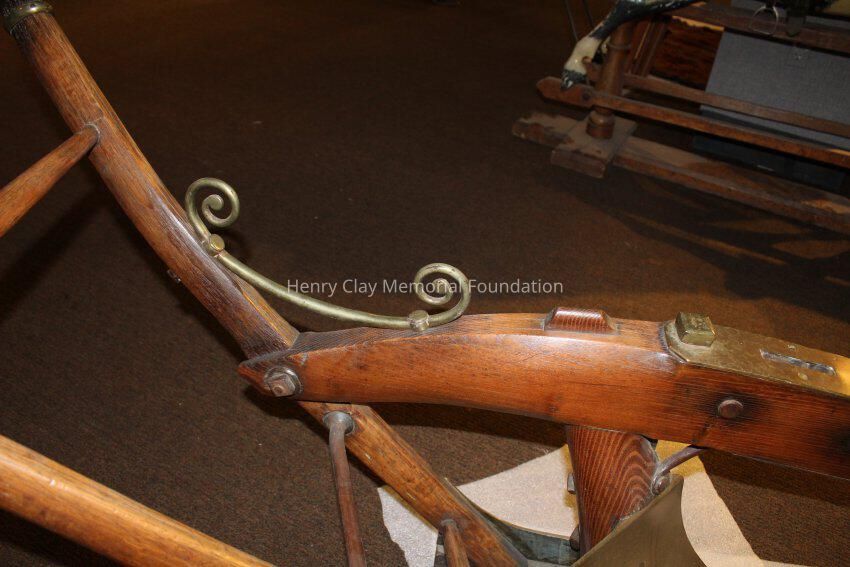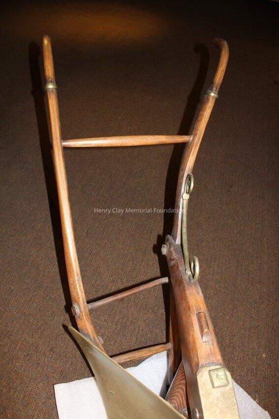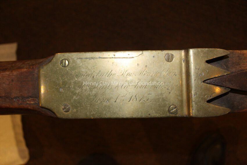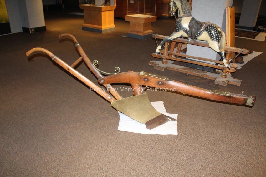 The plow is made of a light colored wood with brass and iron fittings. The two handles meet in a V and join a wooden connector behind the blade, The neck of the plow joins one arm and extends out over the blade. There are brass fittings at the top of each arm and a brass curved support with sprial ends between one arm and the neck conjoined to it. There is a wood dowel joining the two arms about one thrid of the way down the arms. The modlboard is brass and the edge of the blade is steel. There is a brass plate on the neck over the blade with a slot in it. There is a brass plate near the end of the neck that reads "Presented to the Hon. Henry Clay by H. Hays & Co. June 1, 1845." The neck terminates in an iron piece that wraps around the end of the neck forming three loops.