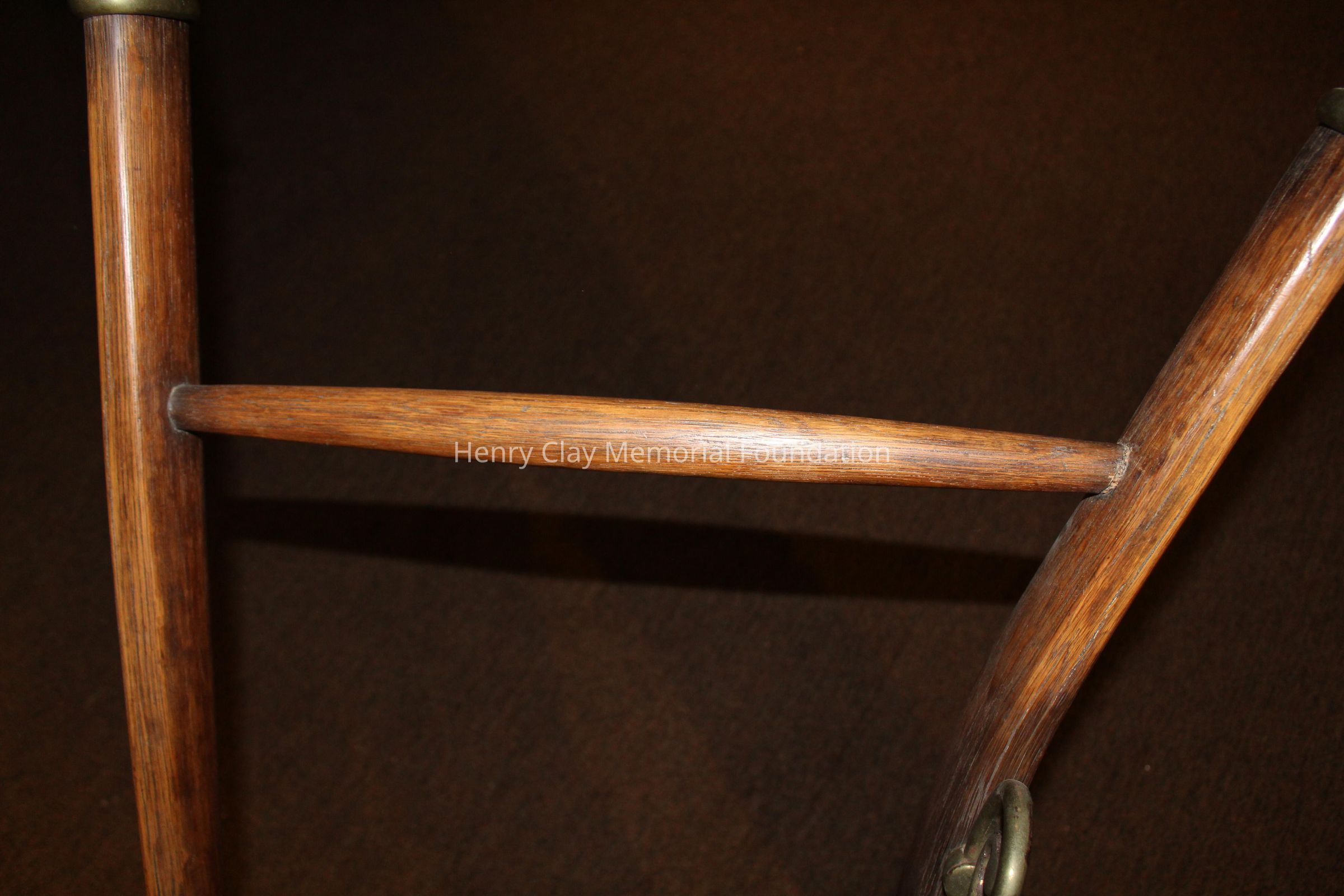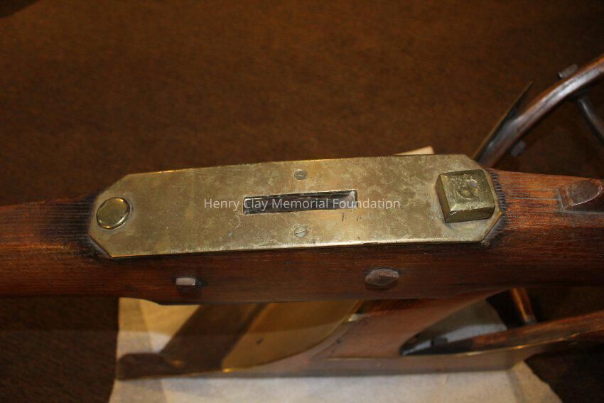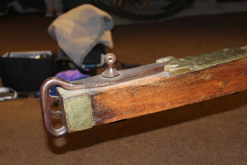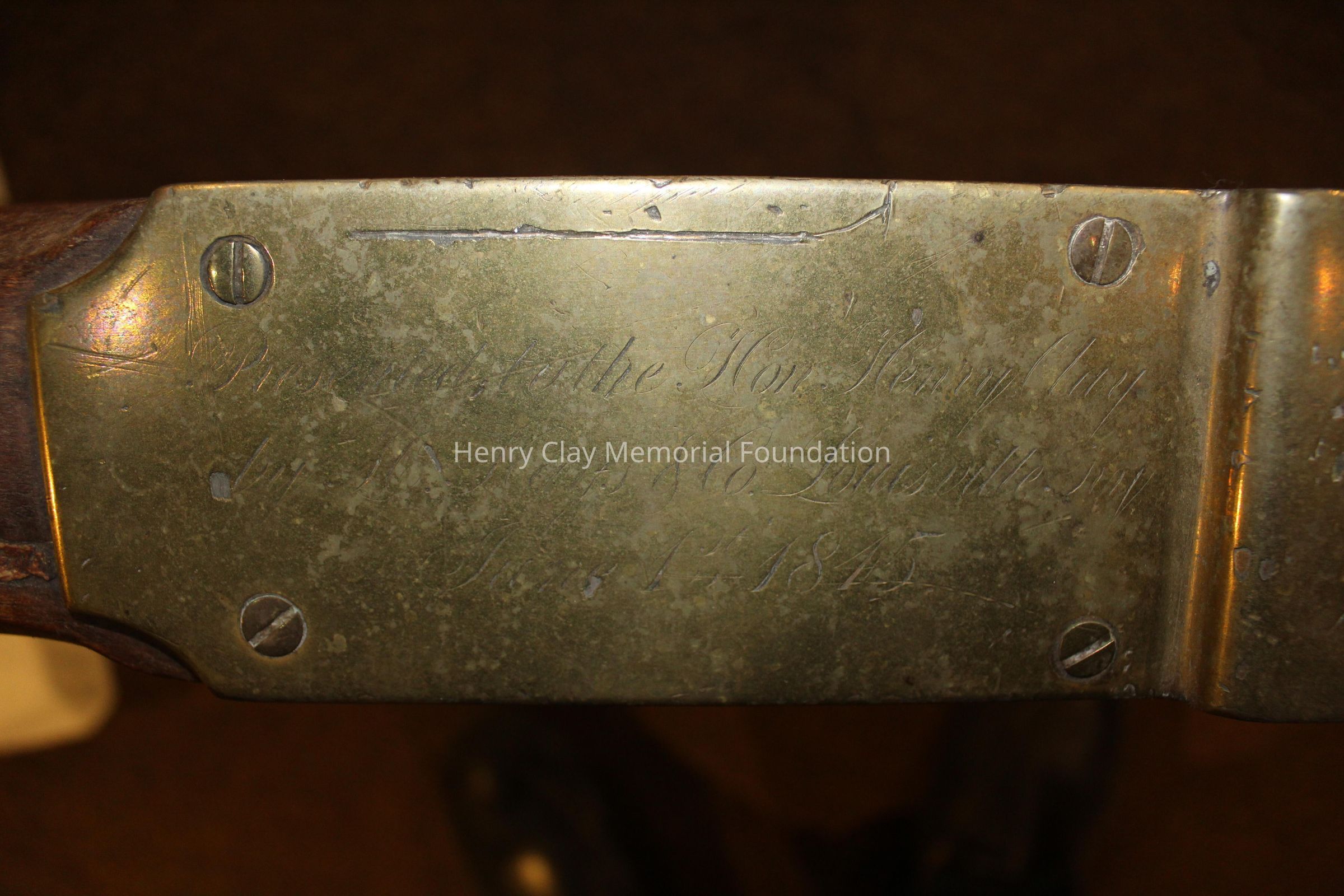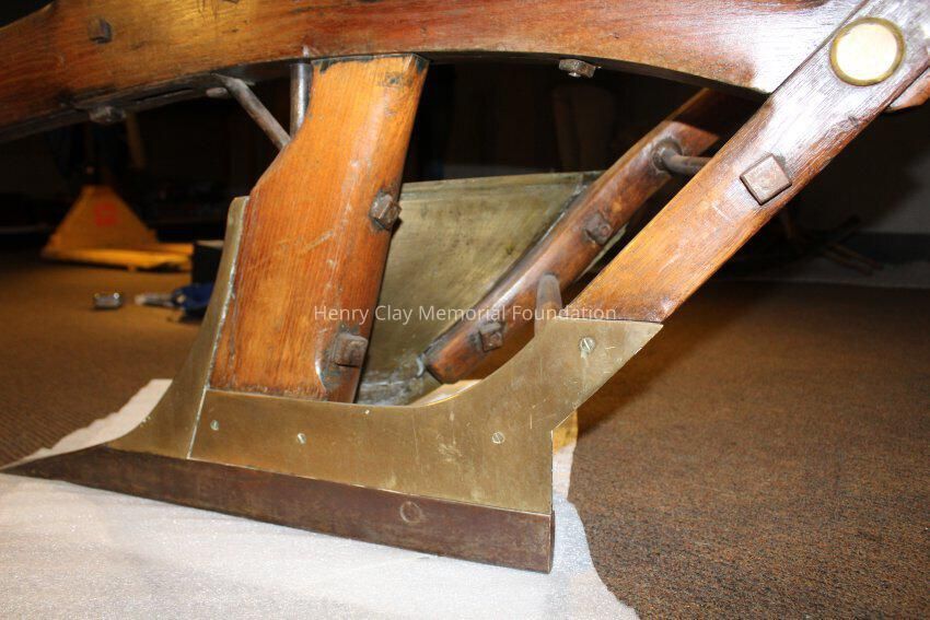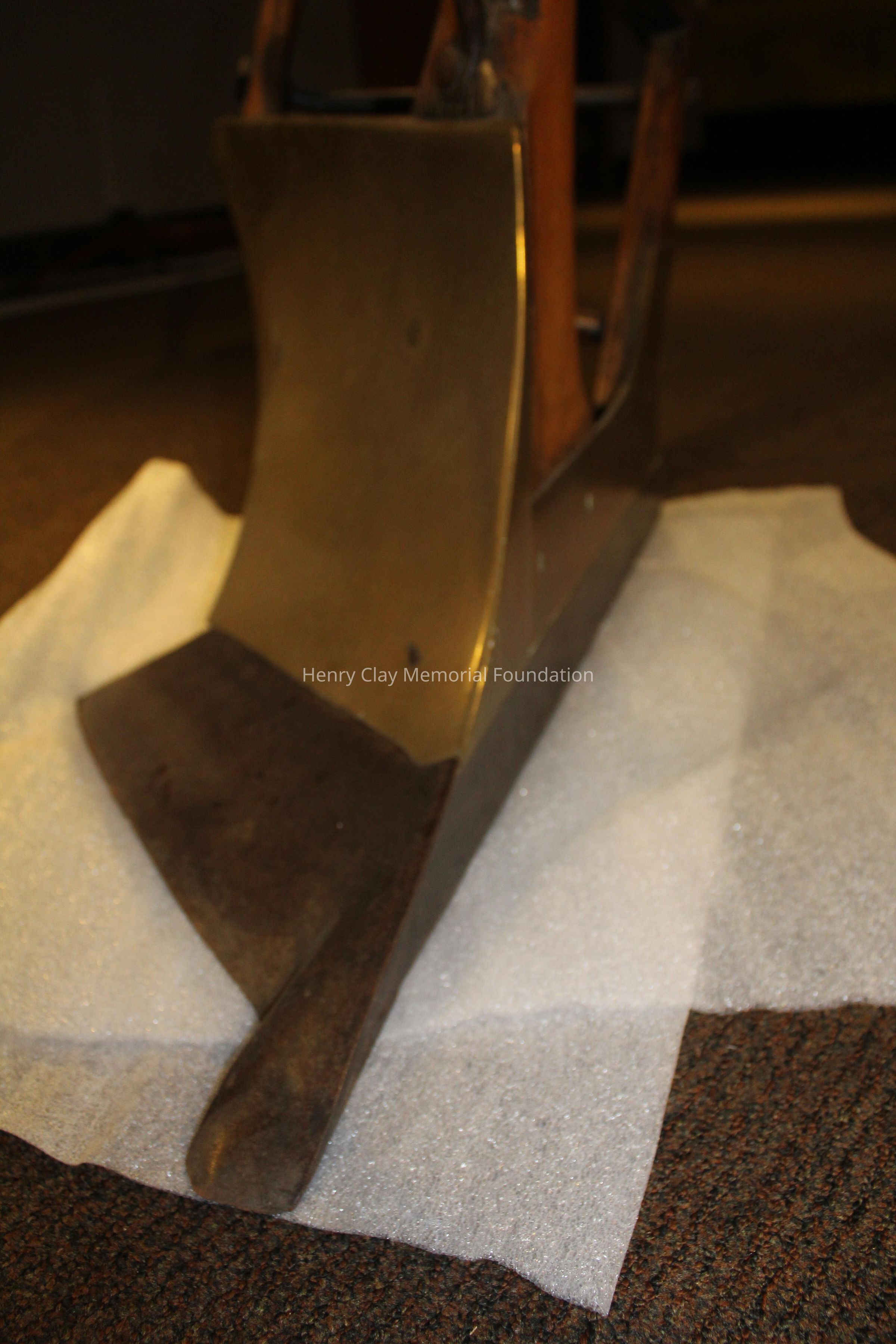 The plow is made of a light colored wood with brass and iron fittings. The two handles meet in a V and join a wooden connector behind the blade, The neck of the plow joins one arm and extends out over the blade. There are brass fittings at the top of each arm and a brass curved support with sprial ends between one arm and the neck conjoined to it. There is a wood dowel joining the two arms about one thrid of the way down the arms. The modlboard is brass and the edge of the blade is steel. There is a brass plate on the neck over the blade with a slot in it. There is a brass plate near the end of the neck that reads "Presented to the Hon. Henry Clay by H. Hays & Co. June 1, 1845." The neck terminates in an iron piece that wraps around the end of the neck forming three loops.