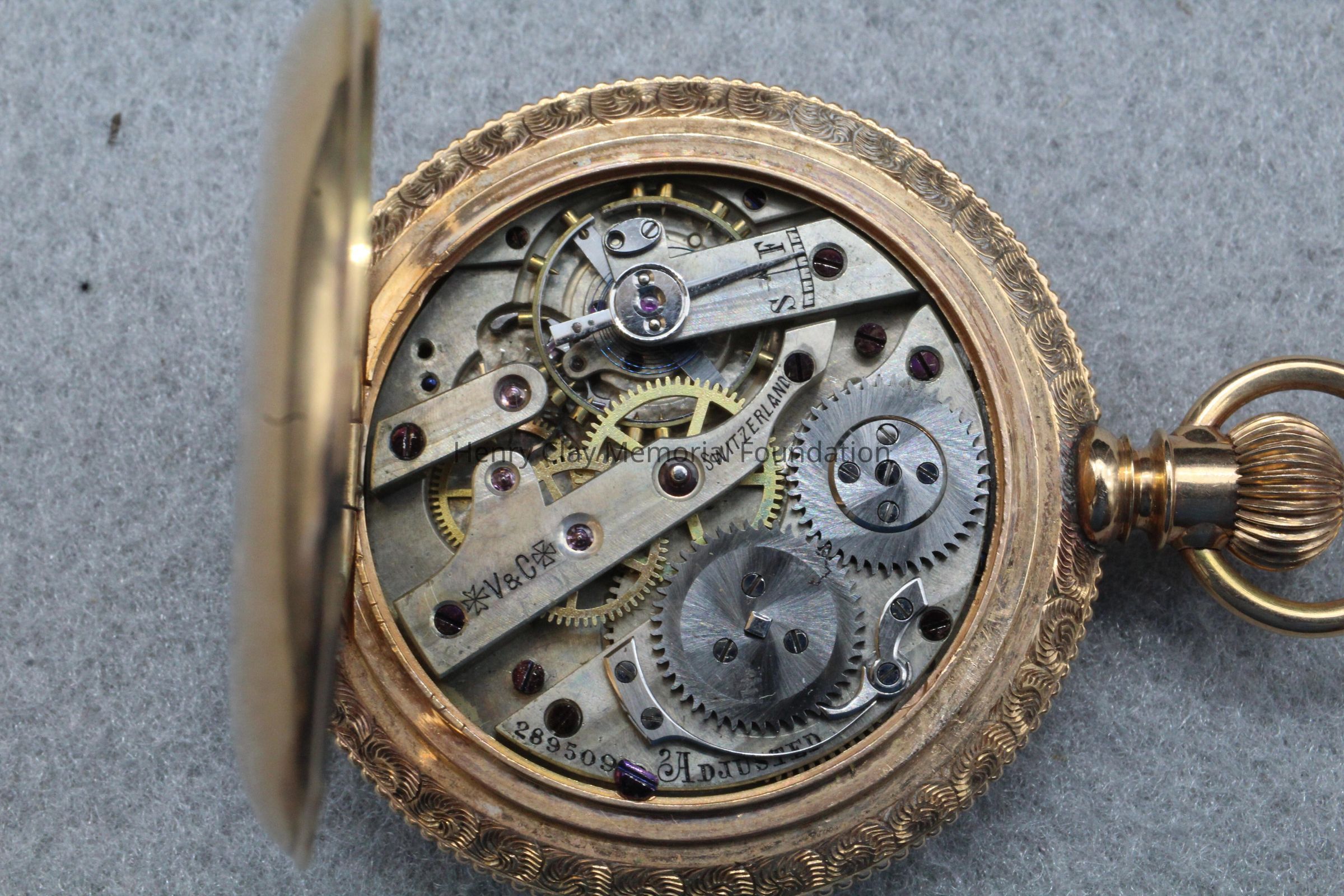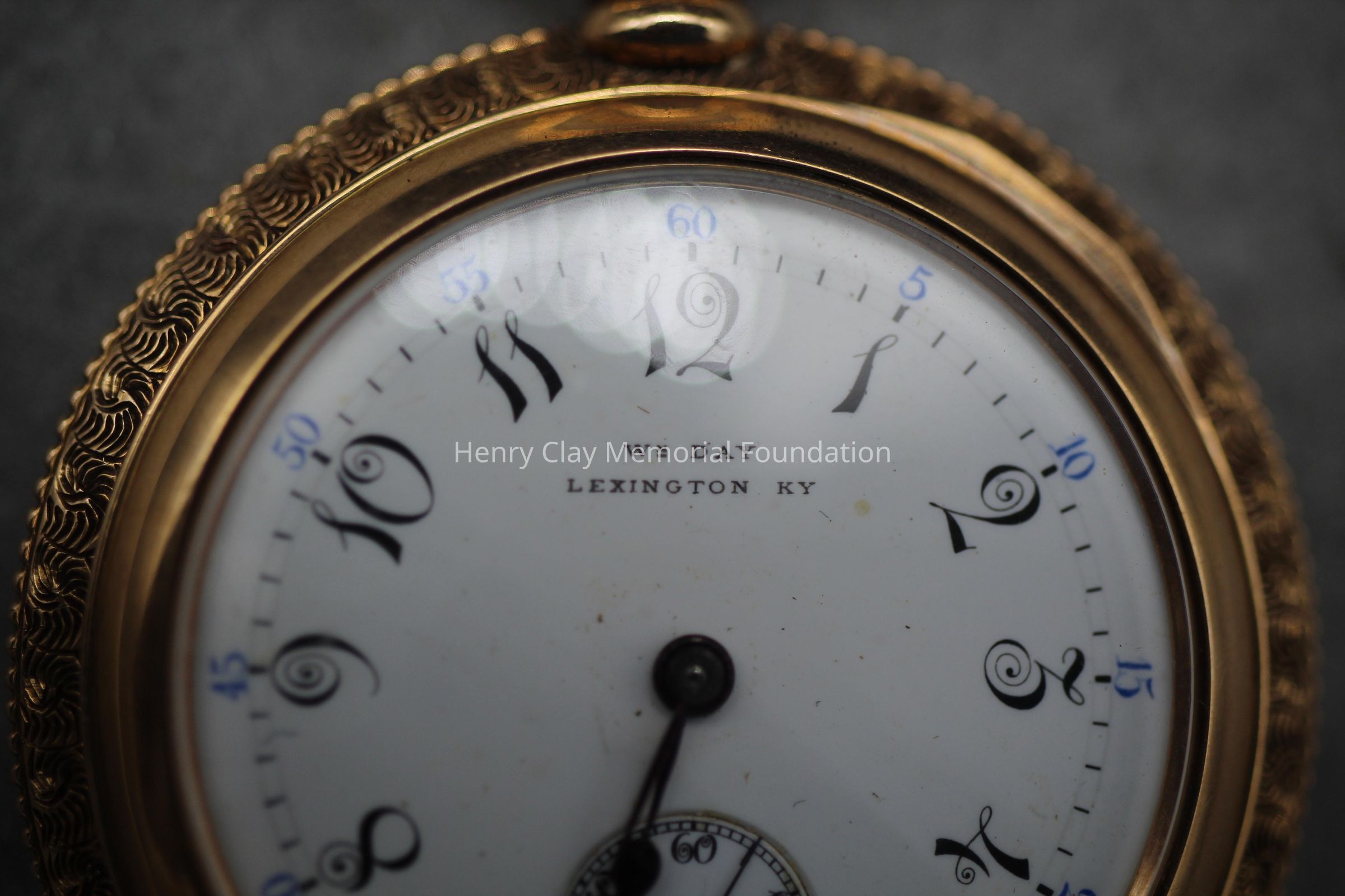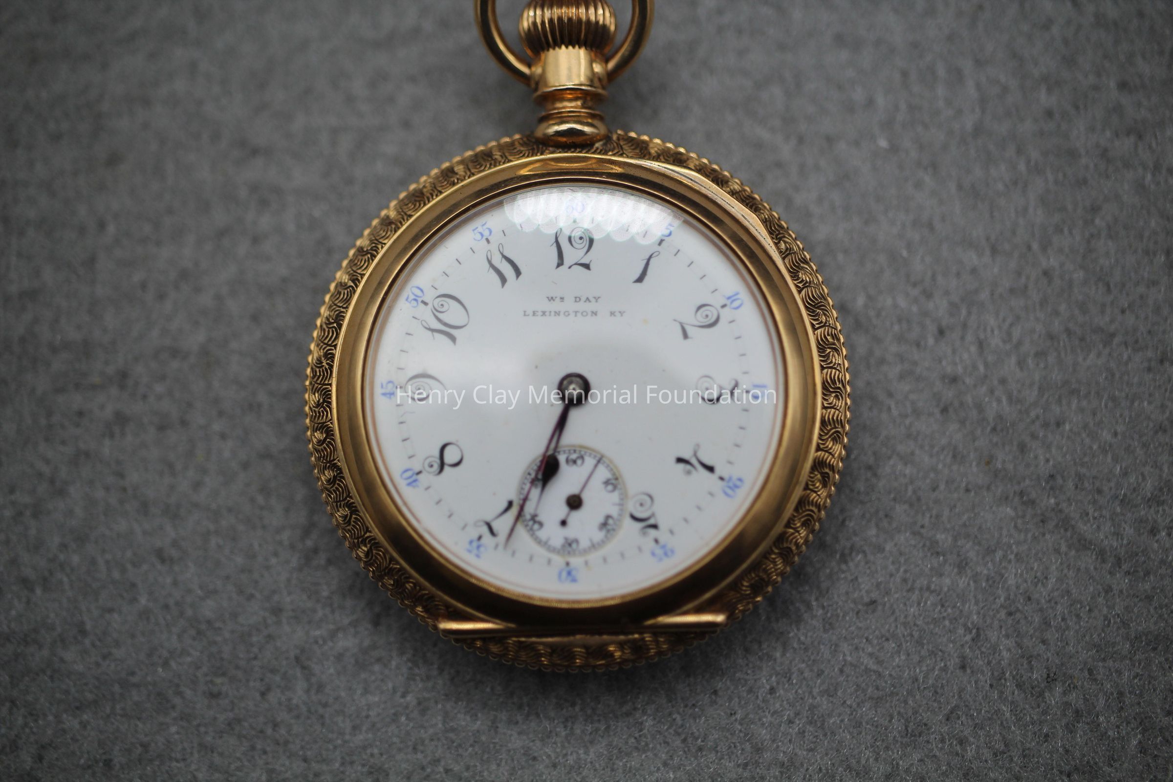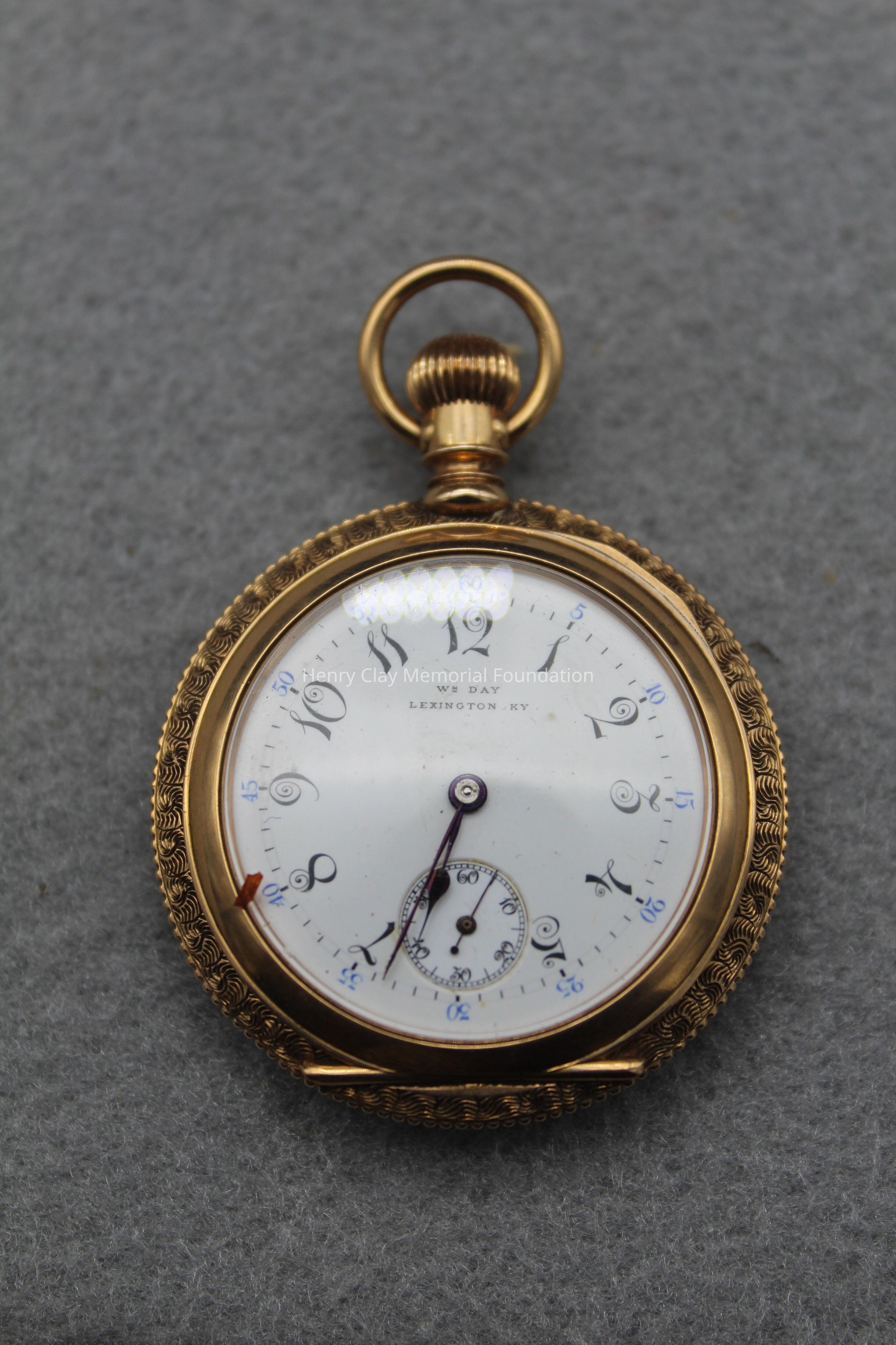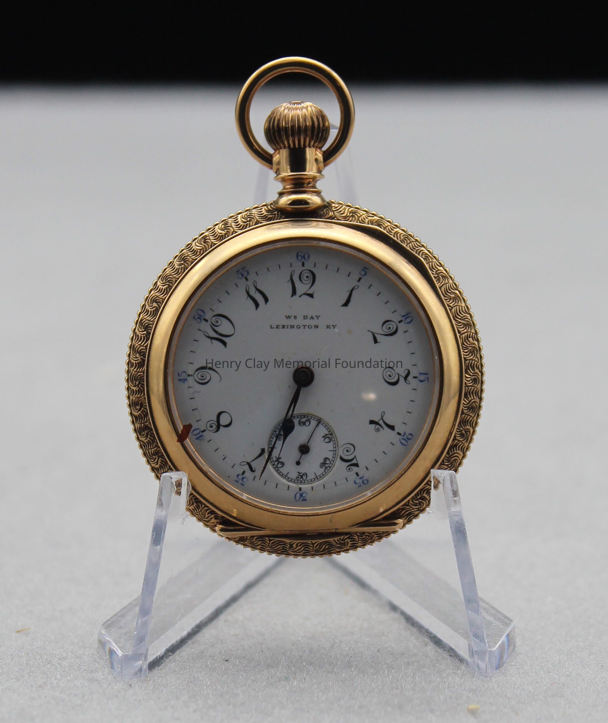 Gold stem wind pocket watch with white face. Hour numerals are black with numerals for minutes around the outside in blue. There is a small seconds dial at bottom center. Marked "WE Day Lexington KY at top center. Case is engine turned around edge. Back s engraved with the initials "JRC". Inside of back case cover is stampes "Warranted 14k US Assay" and "B.W.C. Co. 730436. Works are stamped "V&C Switzerland" and "289509 Adjust".
