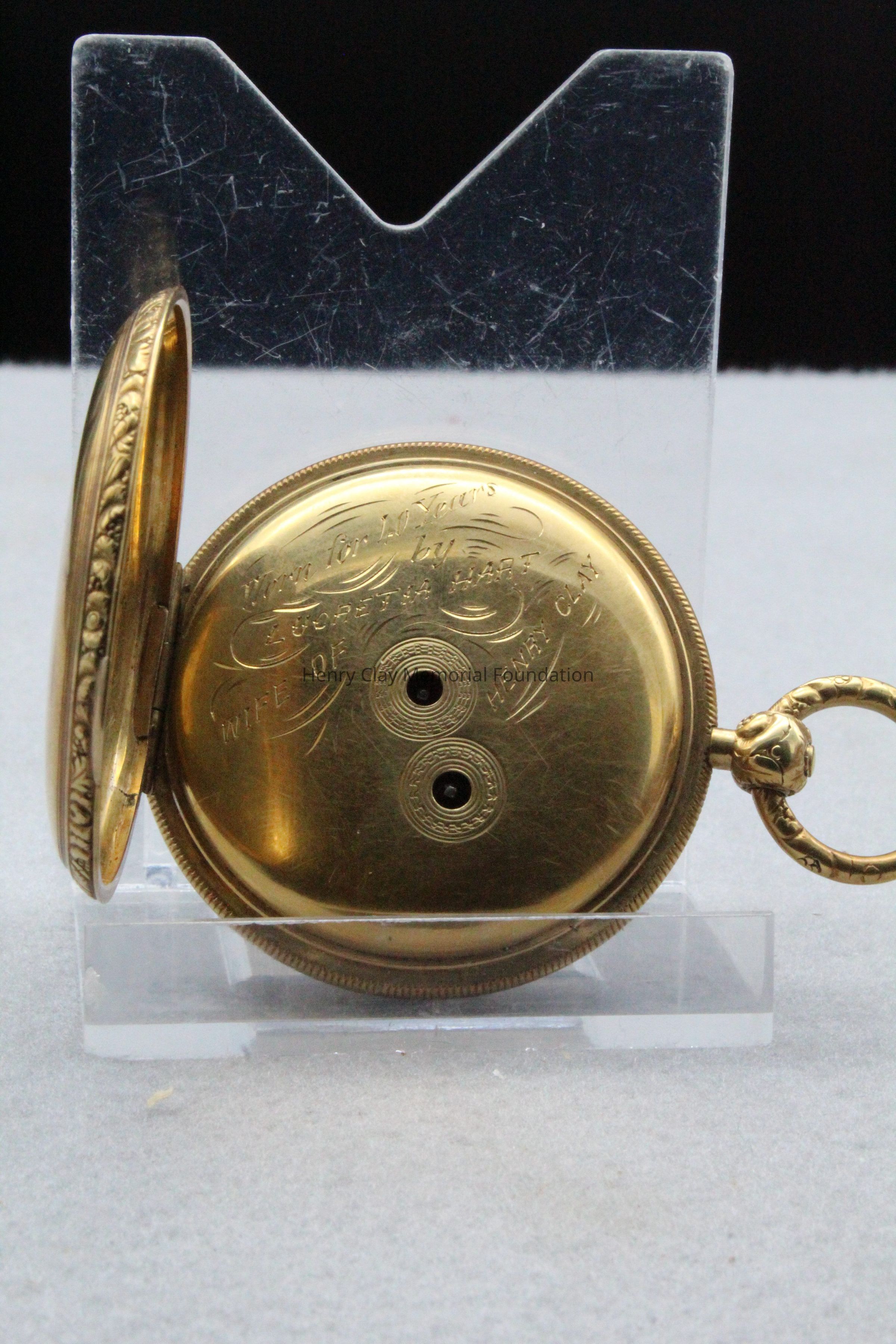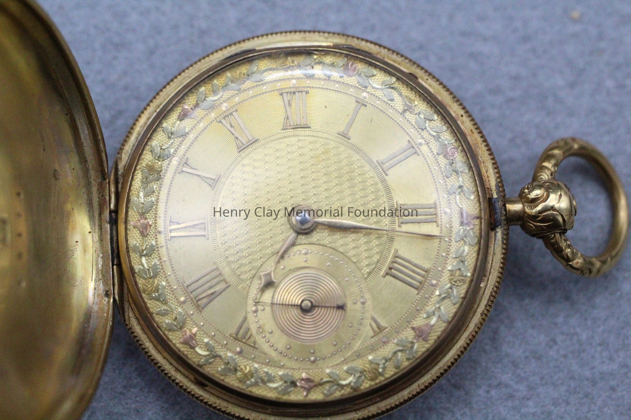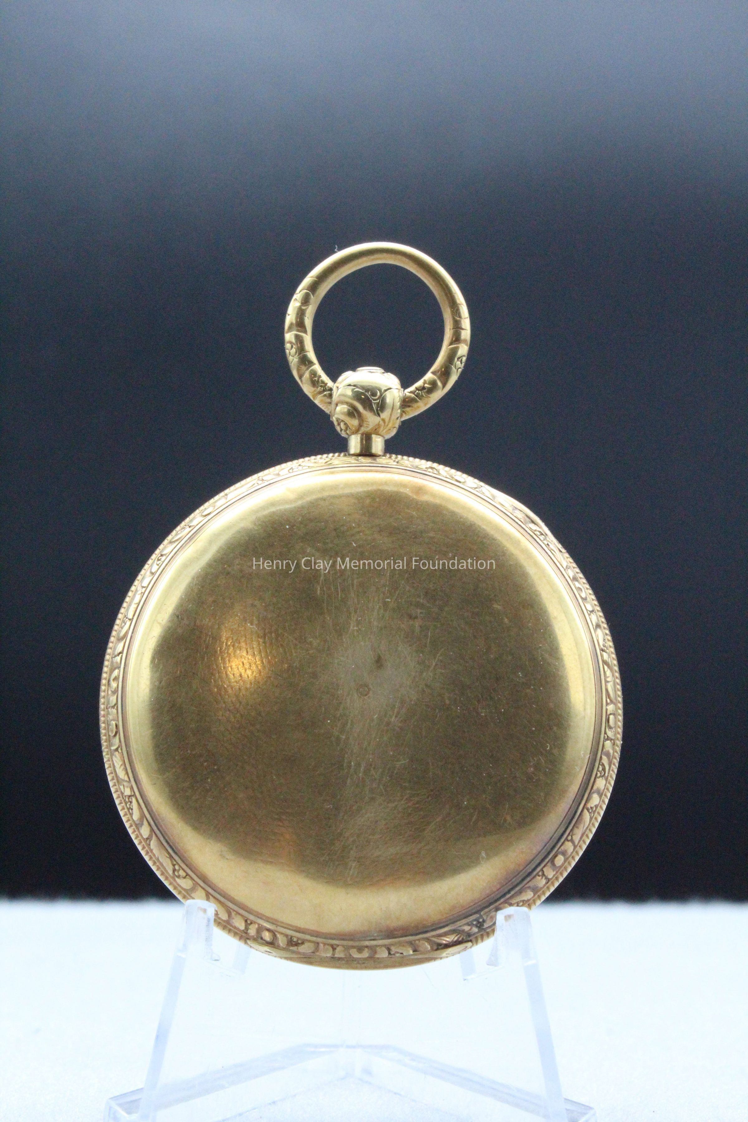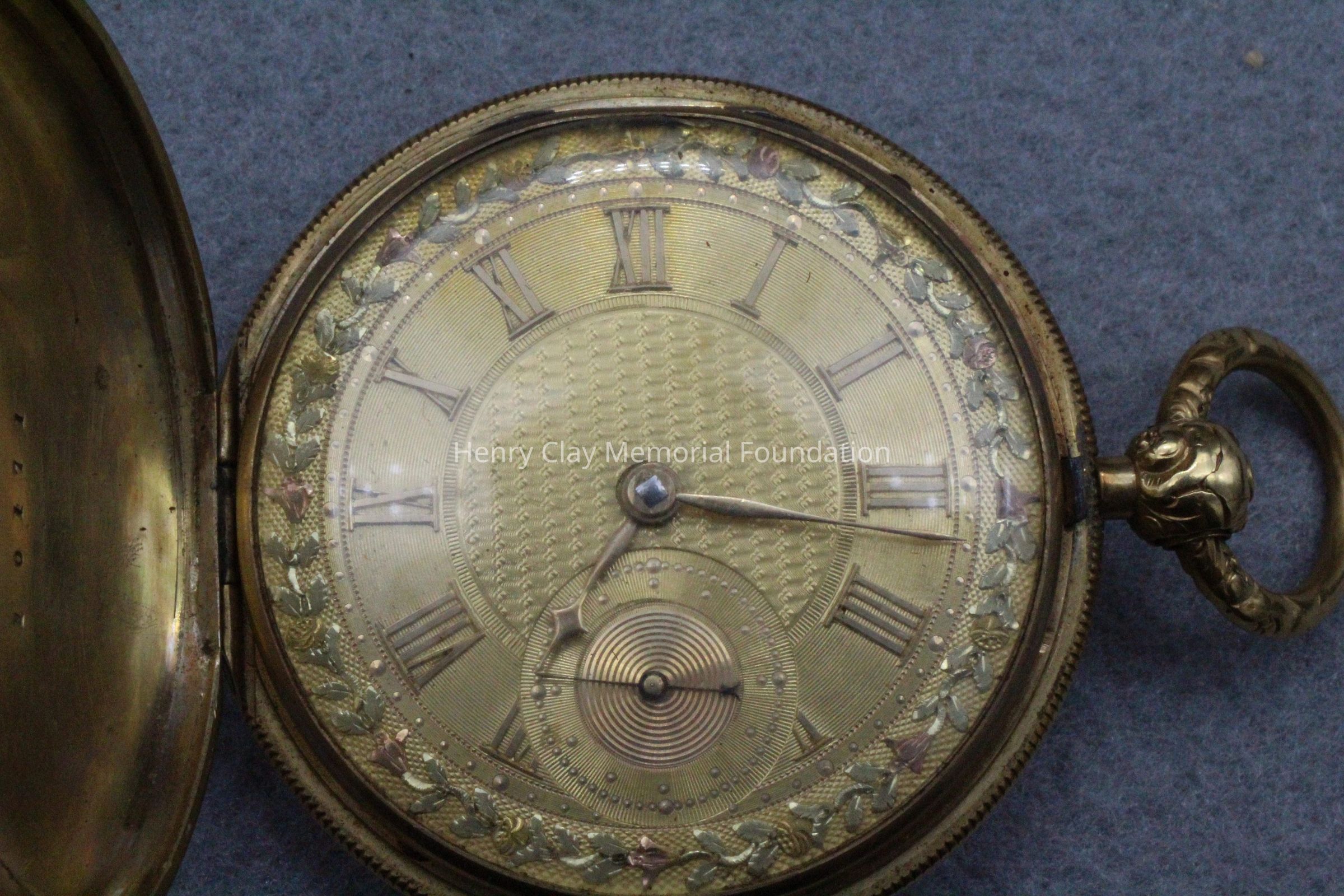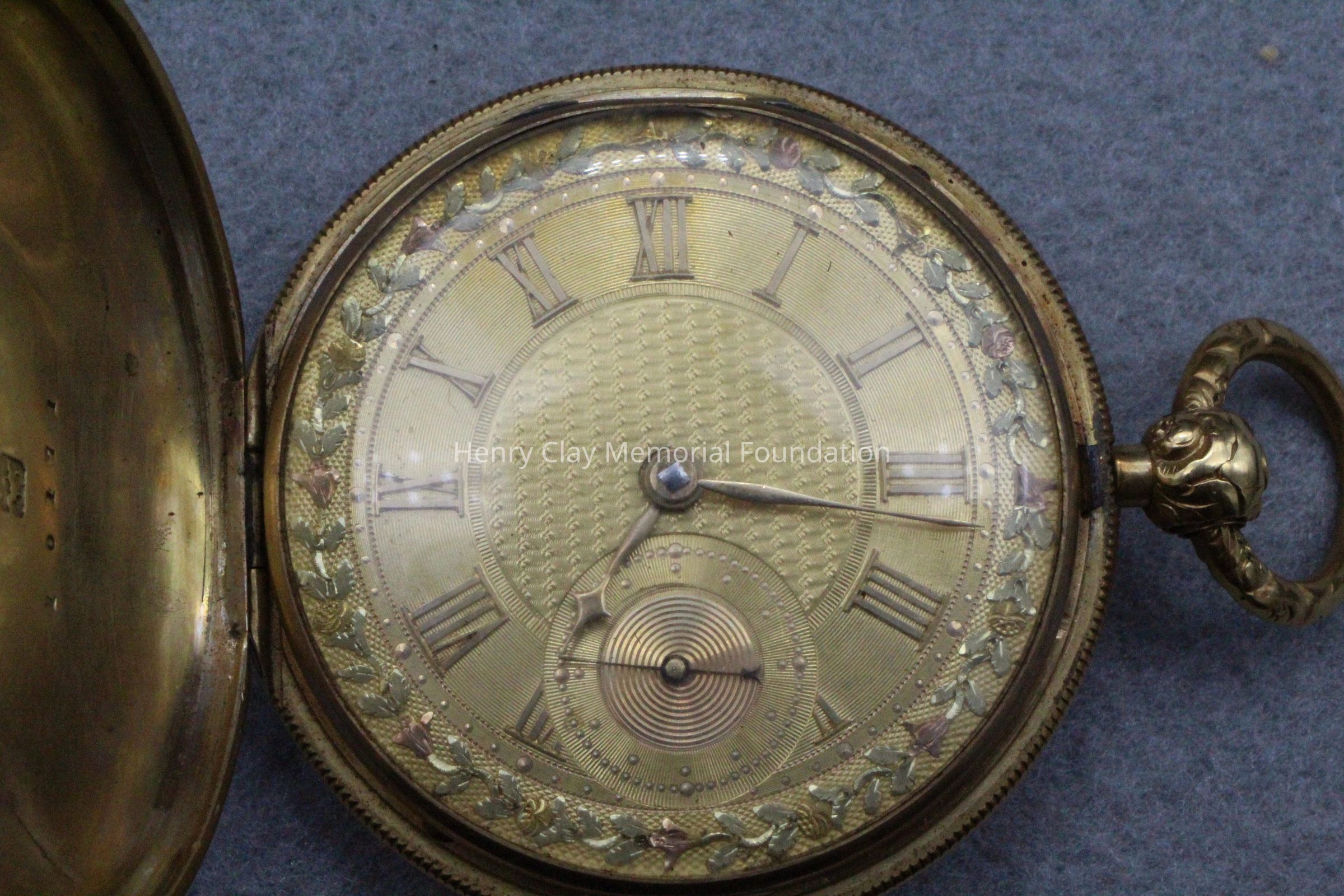 Gold ladies pocket watch. Has front and back case covers with worn circular engine turned designs overall. The stem has a gold ring and latch release to open the covers at the end. The edge of the watch and the stem are covered with floral designs. The face is gold with Roman numerals. it has a small seconds dial set into the main dial. There is a floral design around the outside that appears to be done with multicolored gold flowers and leaves. The inside of the face is done in a scale pattern. On the inside of the case lids are maker's marks and assay marks. They are a shield with three sheaves of wheat surrounding a sword, a crown over the number 18, a lion rampant, and a leopard with crown and the number 10171. The back of the watch contains two holes for key winding and is engraved, "Worn for 40 years by Lucretia Hart, wife of Henry Clay". The works are engraved "Improved deatched patenet lever by Davis & Brothers Liverpool 10171 Warrented".