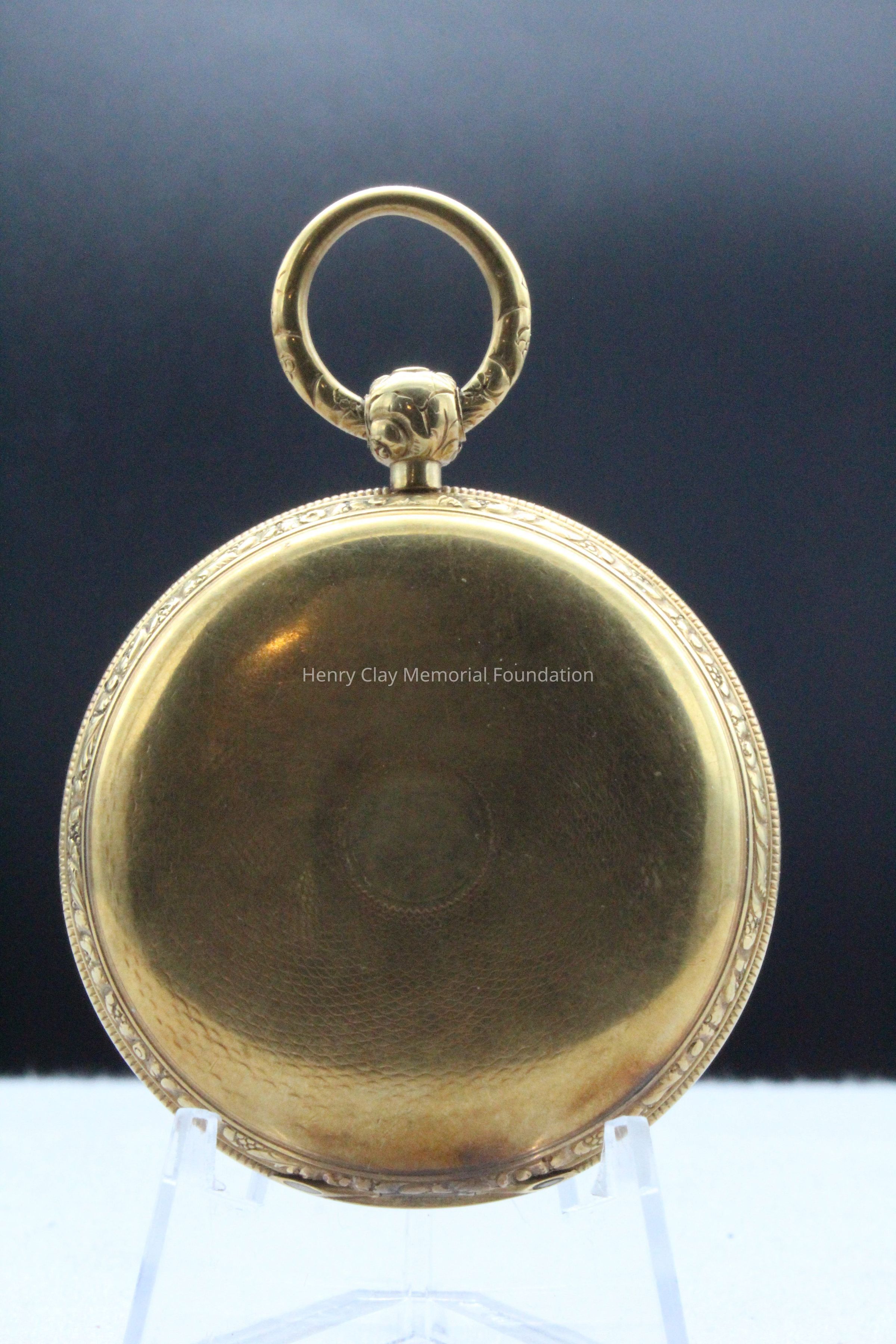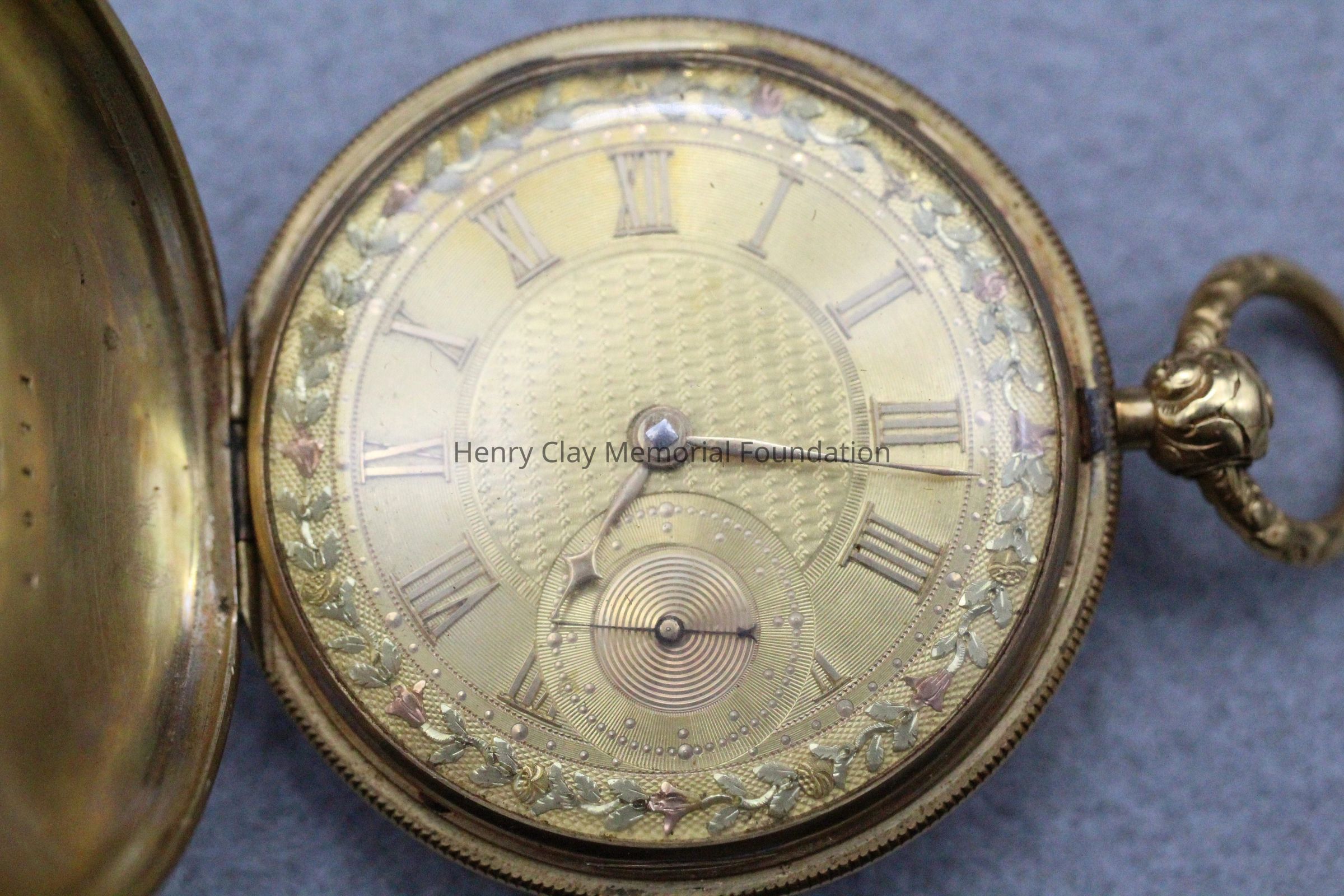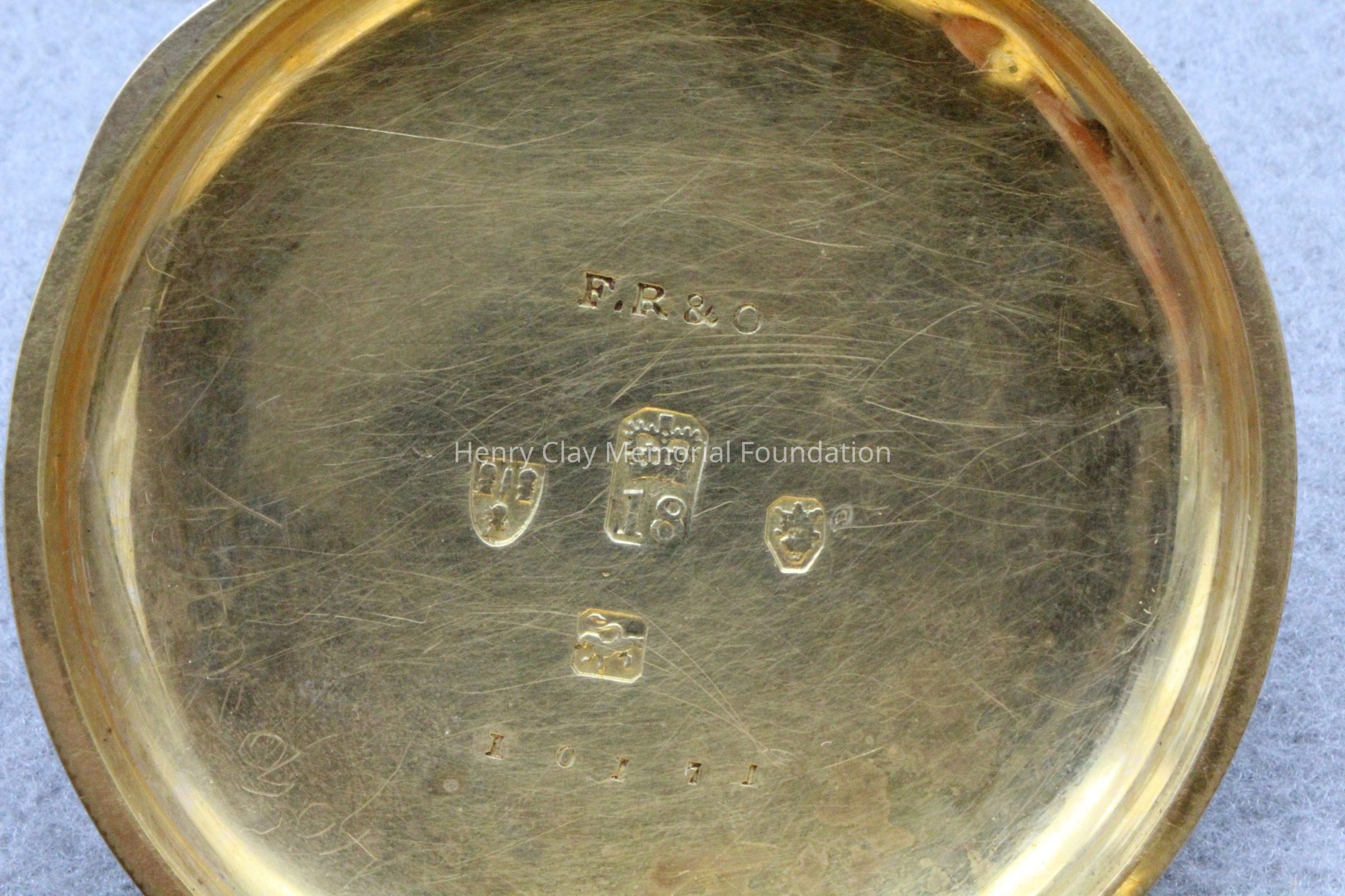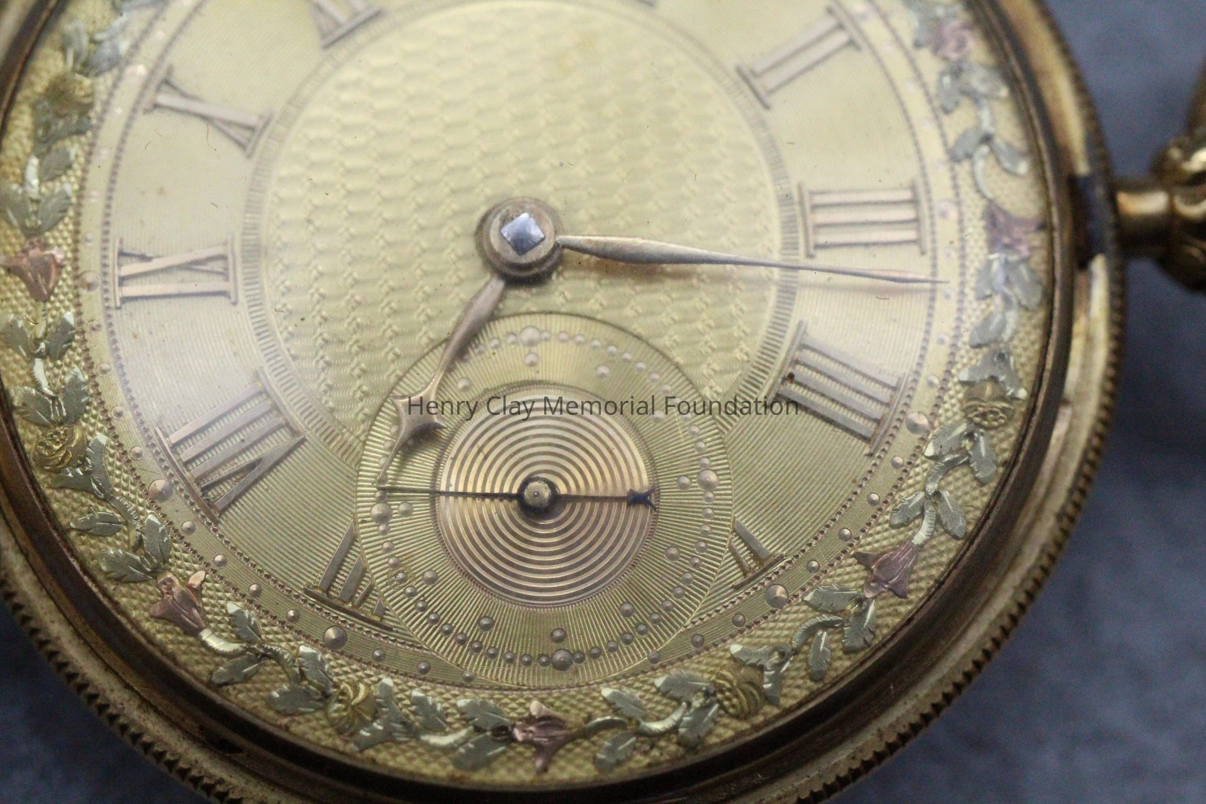 Gold ladies pocket watch. Has front and back case covers with worn circular engine turned designs overall. The stem has a gold ring and latch release to open the covers at the end. The edge of the watch and the stem are covered with floral designs. The face is gold with Roman numerals. it has a small seconds dial set into the main dial. There is a floral design around the outside that appears to be done with multicolored gold flowers and leaves. The inside of the face is done in a scale pattern. On the inside of the case lids are maker's marks and assay marks. They are a shield with three sheaves of wheat surrounding a sword, a crown over the number 18, a lion rampant, and a leopard with crown and the number 10171. The back of the watch contains two holes for key winding and is engraved, "Worn for 40 years by Lucretia Hart, wife of Henry Clay". The works are engraved "Improved deatched patenet lever by Davis & Brothers Liverpool 10171 Warrented".