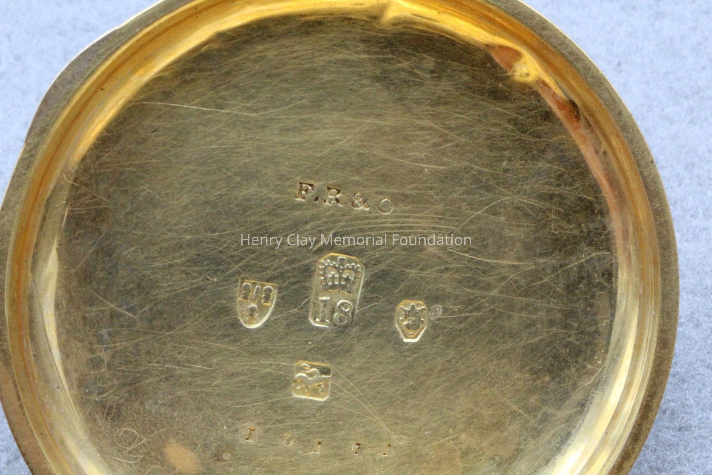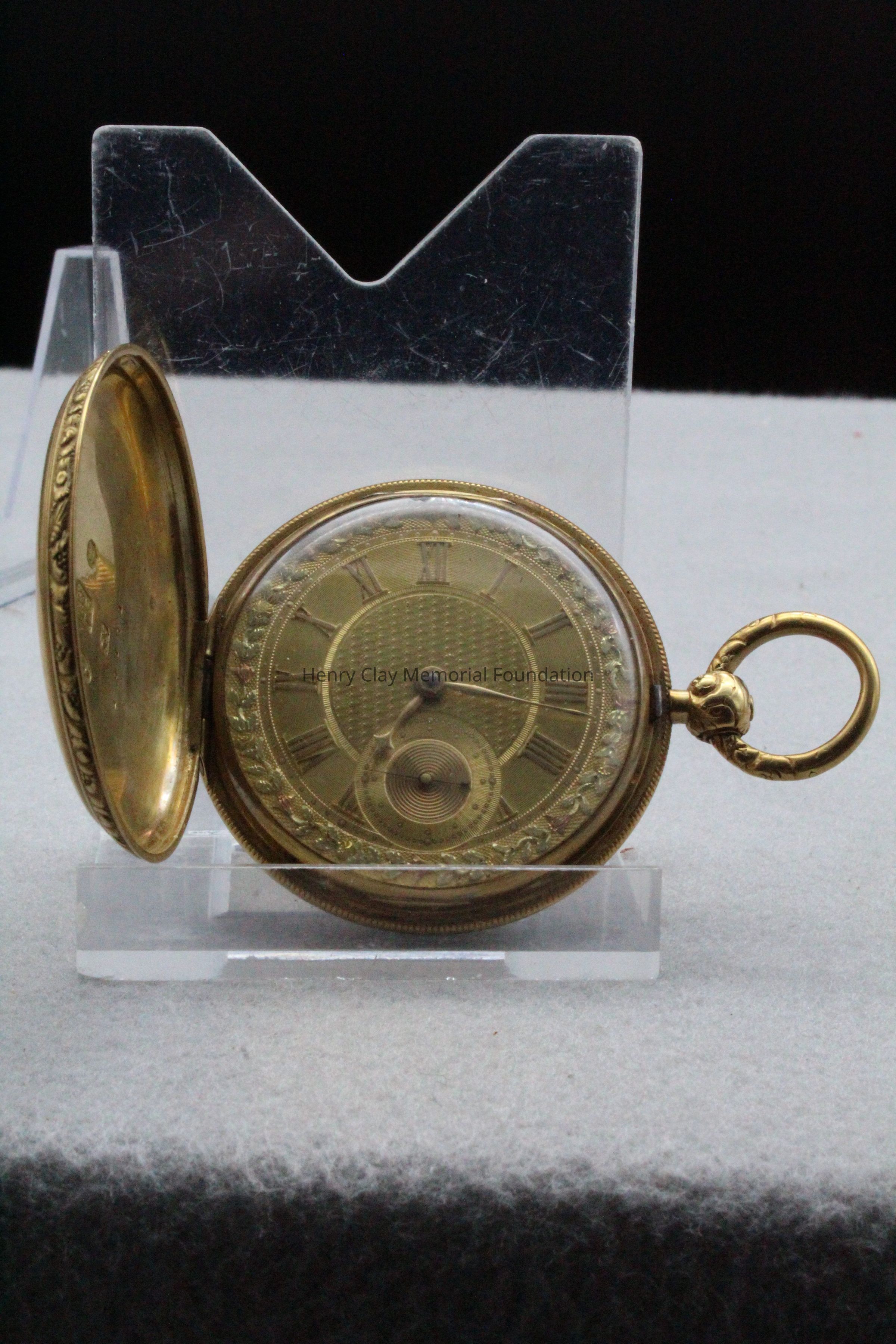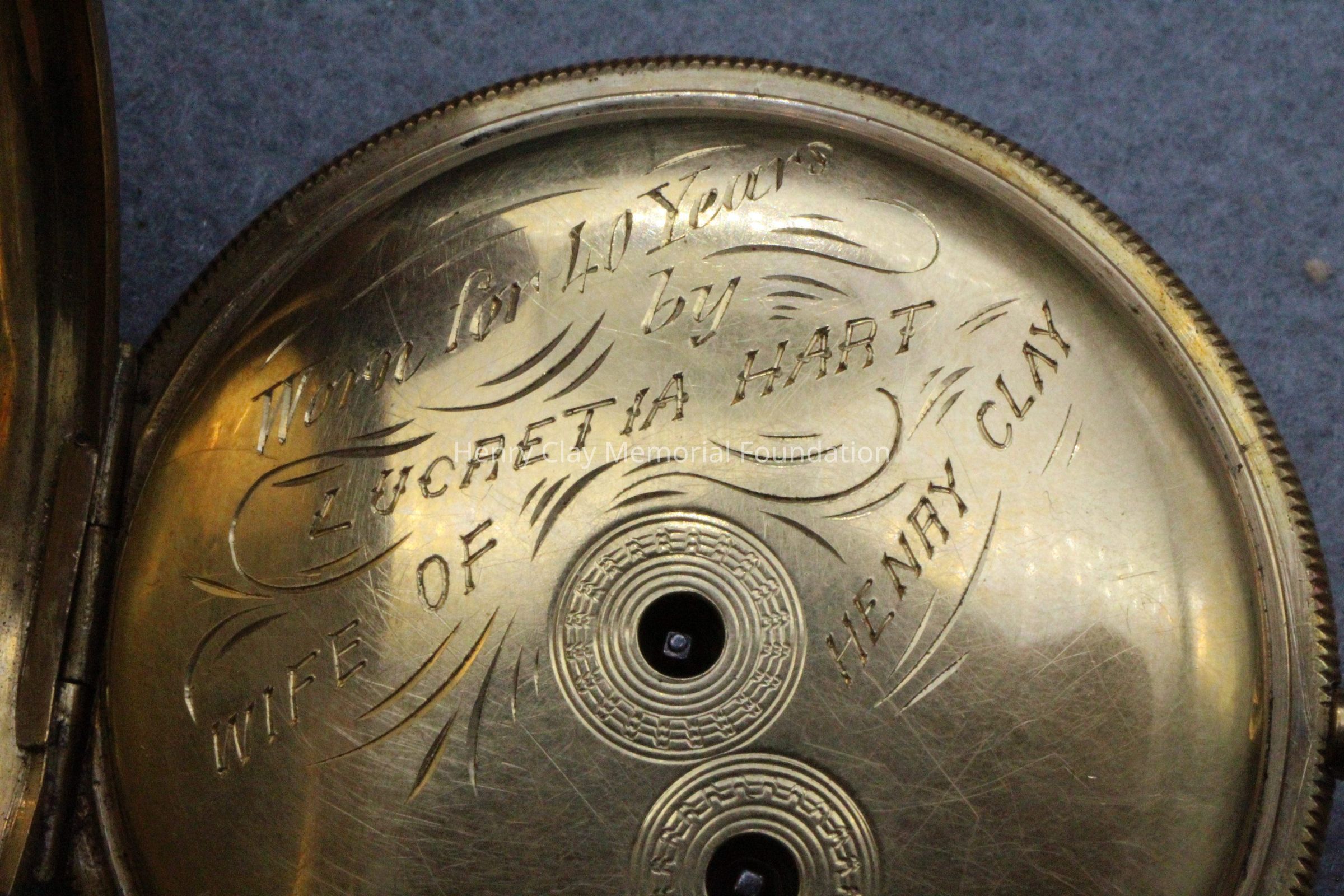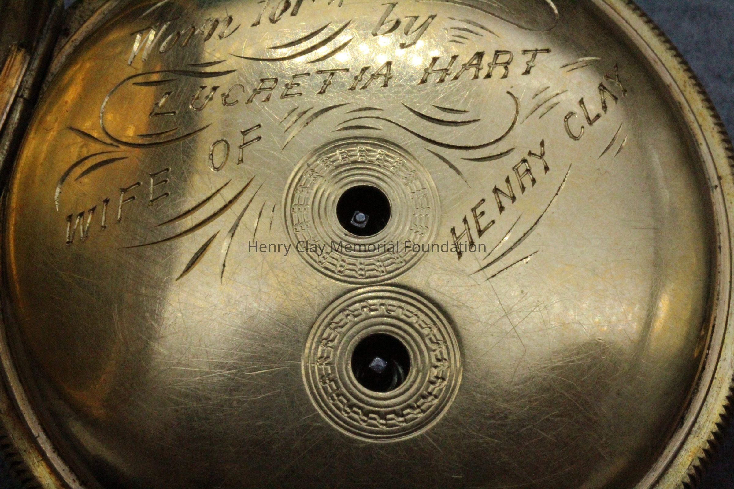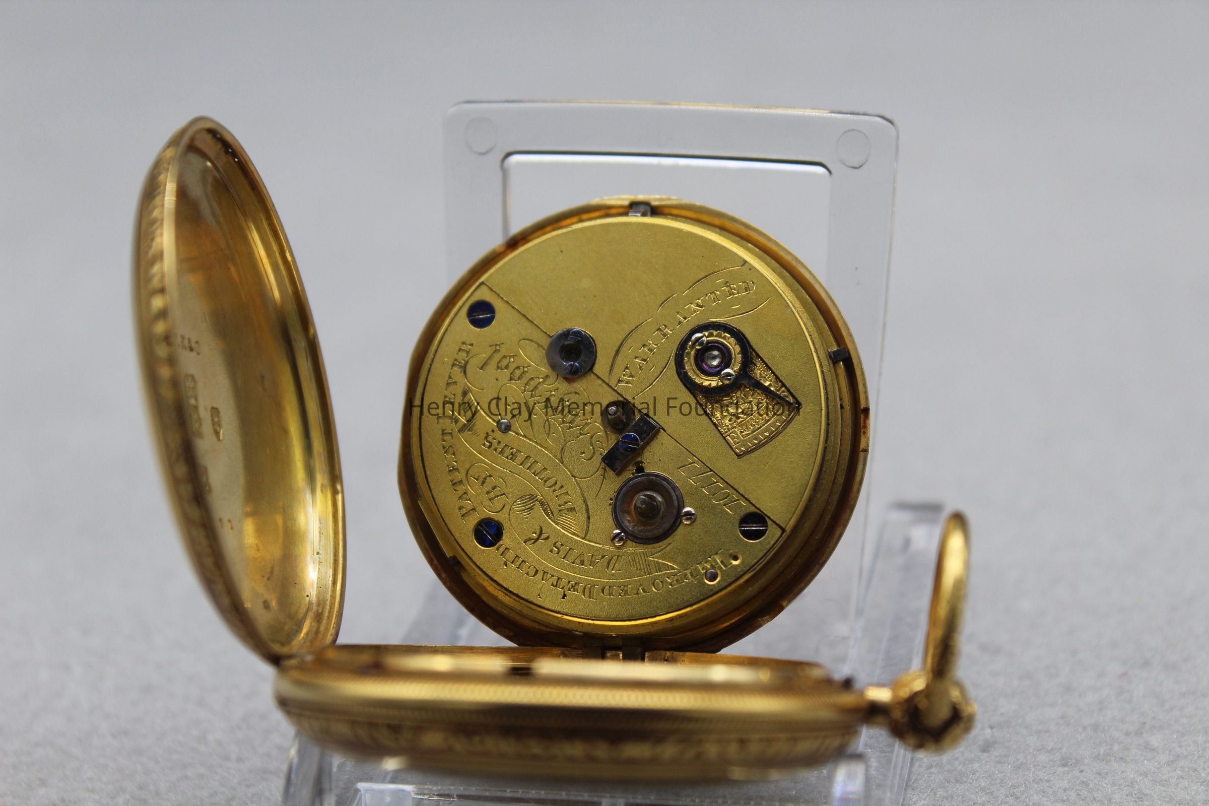 Gold ladies pocket watch. Has front and back case covers with worn circular engine turned designs overall. The stem has a gold ring and latch release to open the covers at the end. The edge of the watch and the stem are covered with floral designs. The face is gold with Roman numerals. it has a small seconds dial set into the main dial. There is a floral design around the outside that appears to be done with multicolored gold flowers and leaves. The inside of the face is done in a scale pattern. On the inside of the case lids are maker's marks and assay marks. They are a shield with three sheaves of wheat surrounding a sword, a crown over the number 18, a lion rampant, and a leopard with crown and the number 10171. The back of the watch contains two holes for key winding and is engraved, "Worn for 40 years by Lucretia Hart, wife of Henry Clay". The works are engraved "Improved deatched patenet lever by Davis & Brothers Liverpool 10171 Warrented".