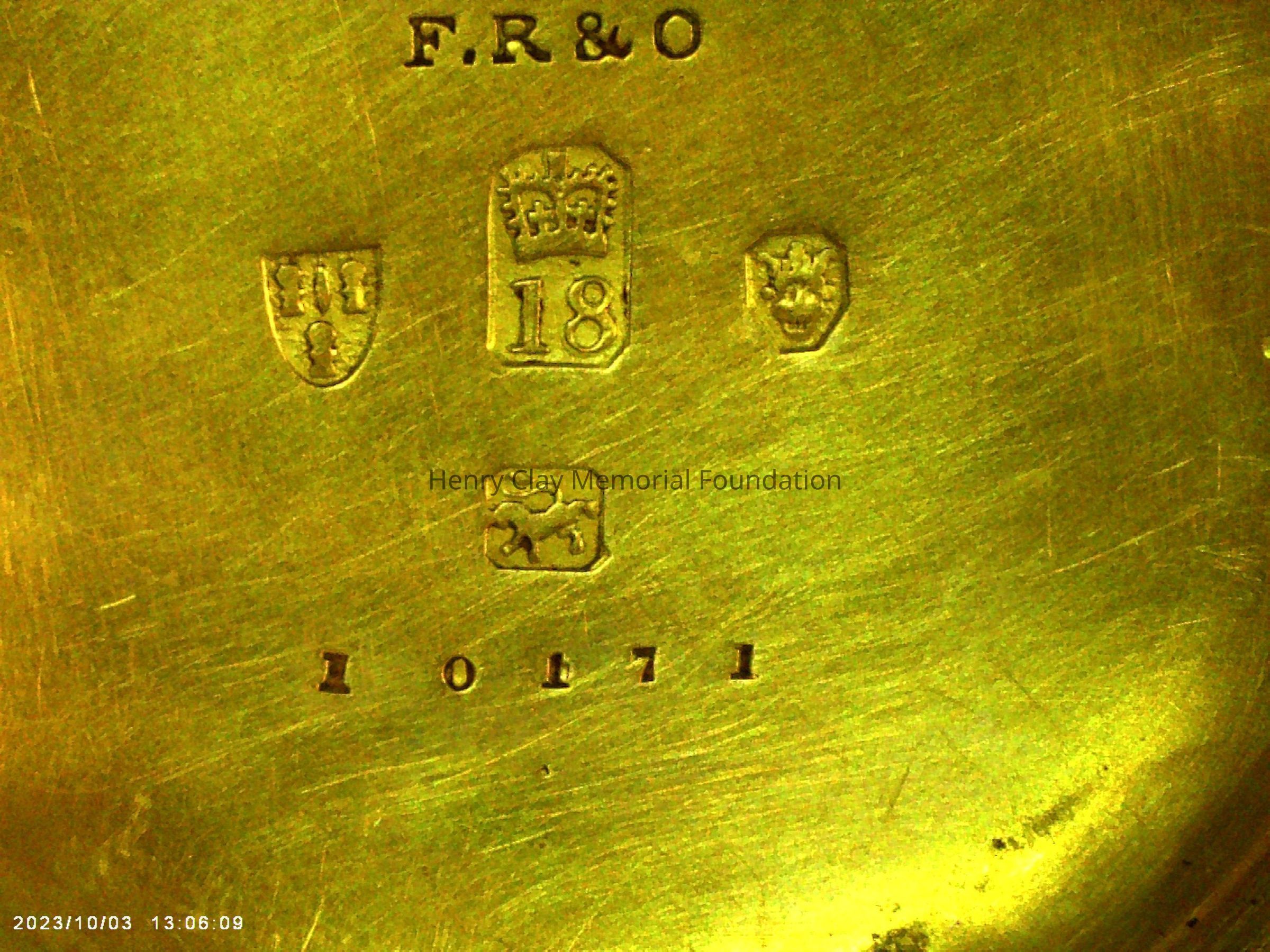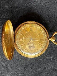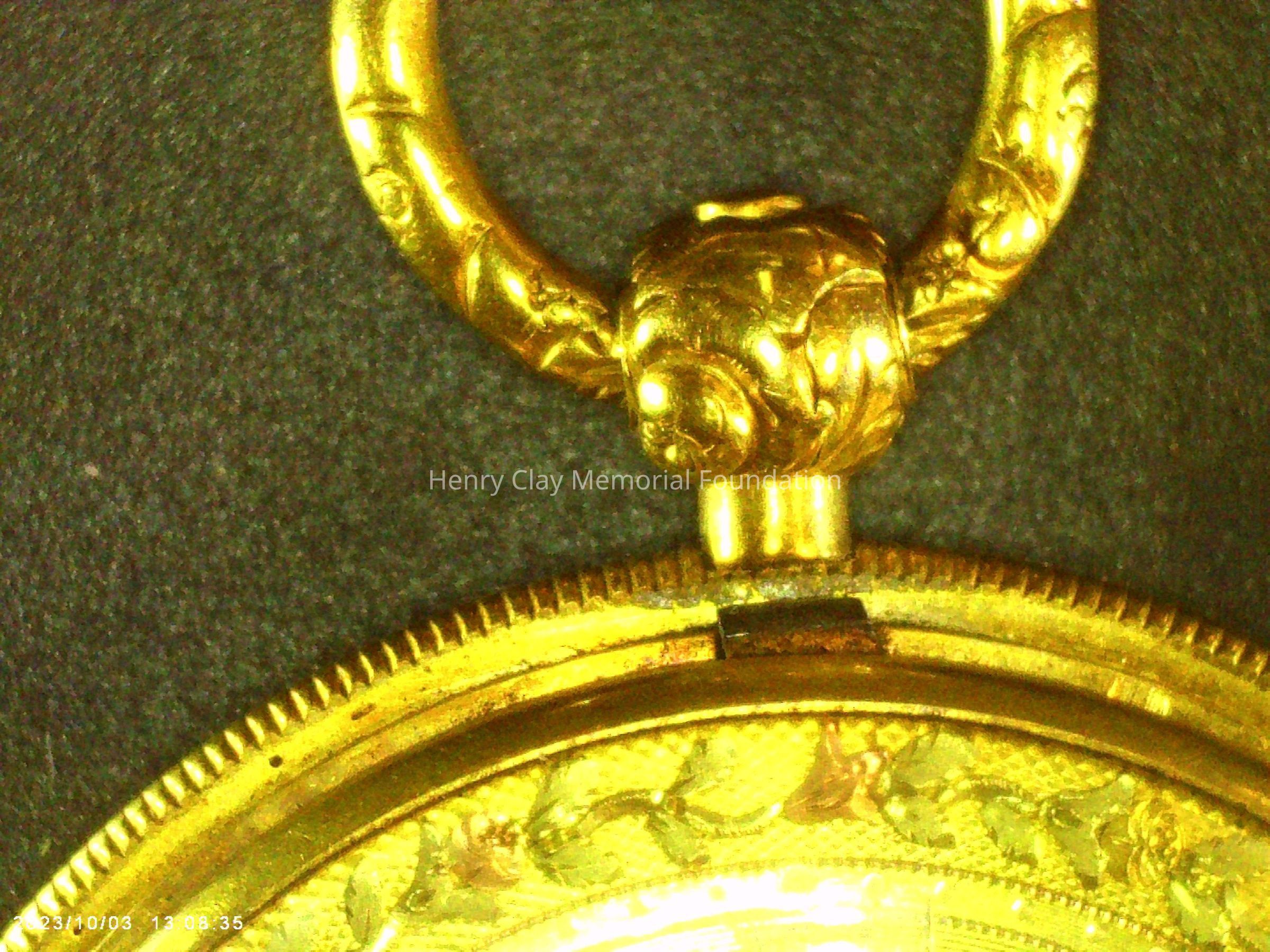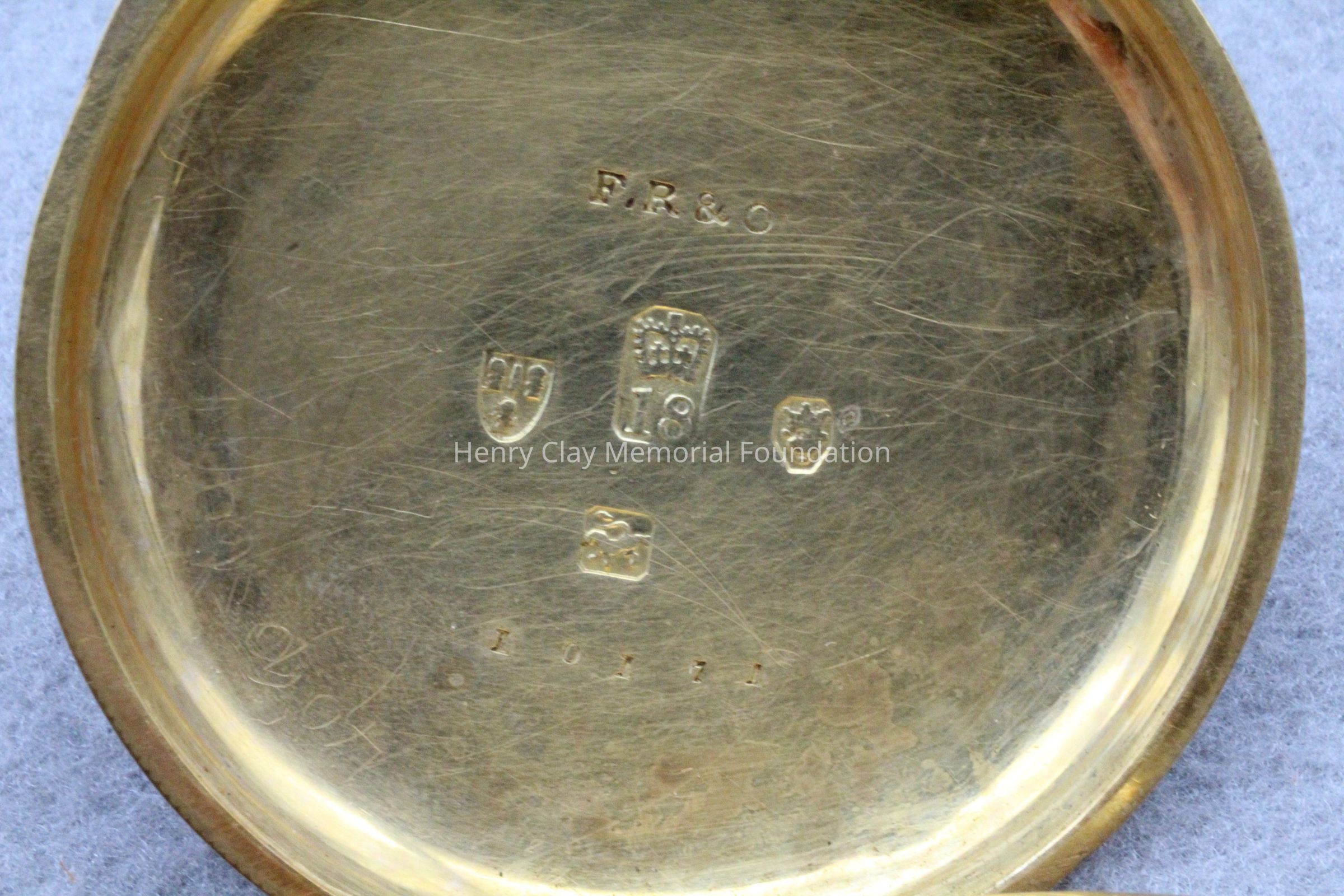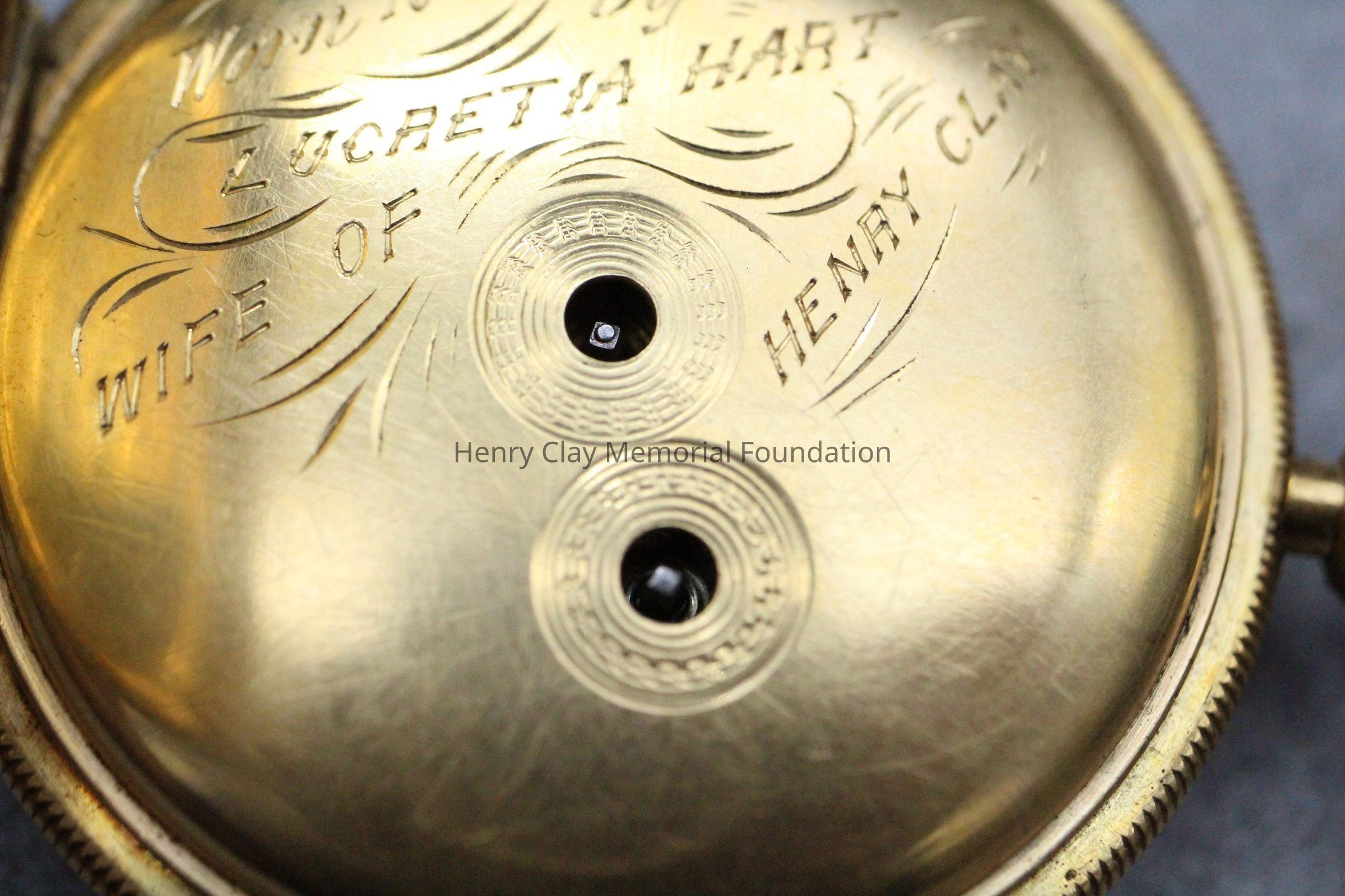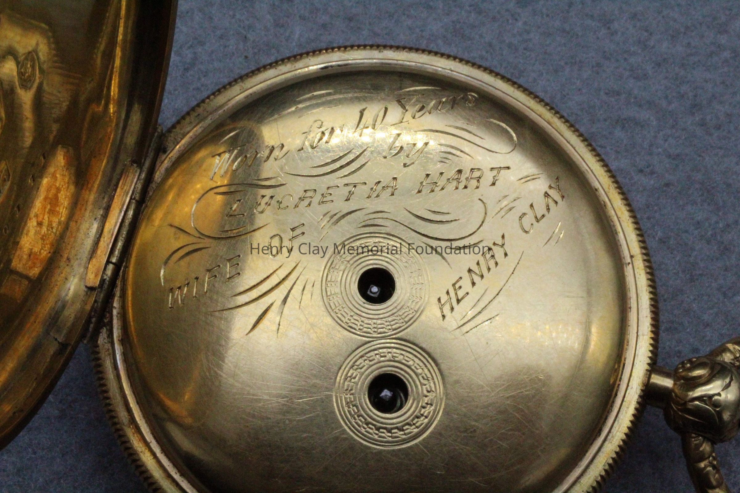 Gold ladies pocket watch. Has front and back case covers with worn circular engine turned designs overall. The stem has a gold ring and latch release to open the covers at the end. The edge of the watch and the stem are covered with floral designs. The face is gold with Roman numerals. it has a small seconds dial set into the main dial. There is a floral design around the outside that appears to be done with multicolored gold flowers and leaves. The inside of the face is done in a scale pattern. On the inside of the case lids are maker's marks and assay marks. They are a shield with three sheaves of wheat surrounding a sword, a crown over the number 18, a lion rampant, and a leopard with crown and the number 10171. The back of the watch contains two holes for key winding and is engraved, "Worn for 40 years by Lucretia Hart, wife of Henry Clay". The works are engraved "Improved deatched patenet lever by Davis & Brothers Liverpool 10171 Warrented".
