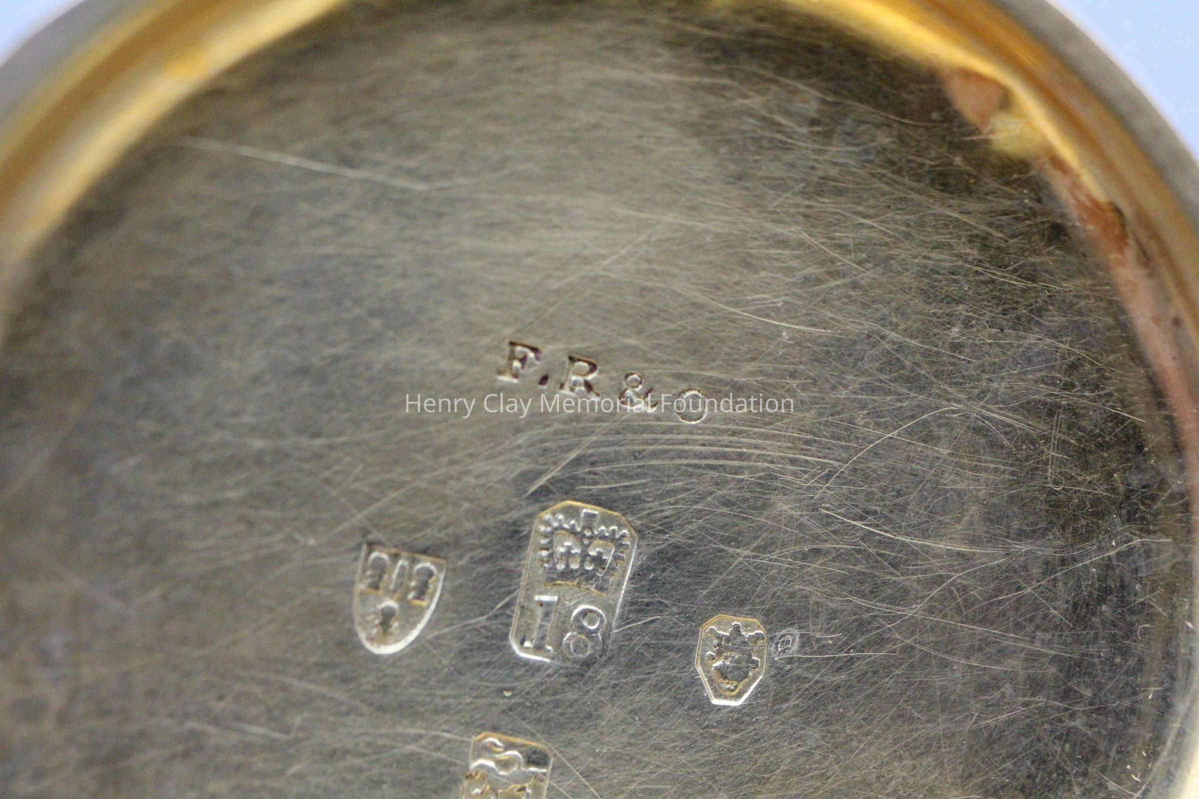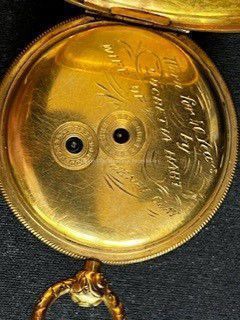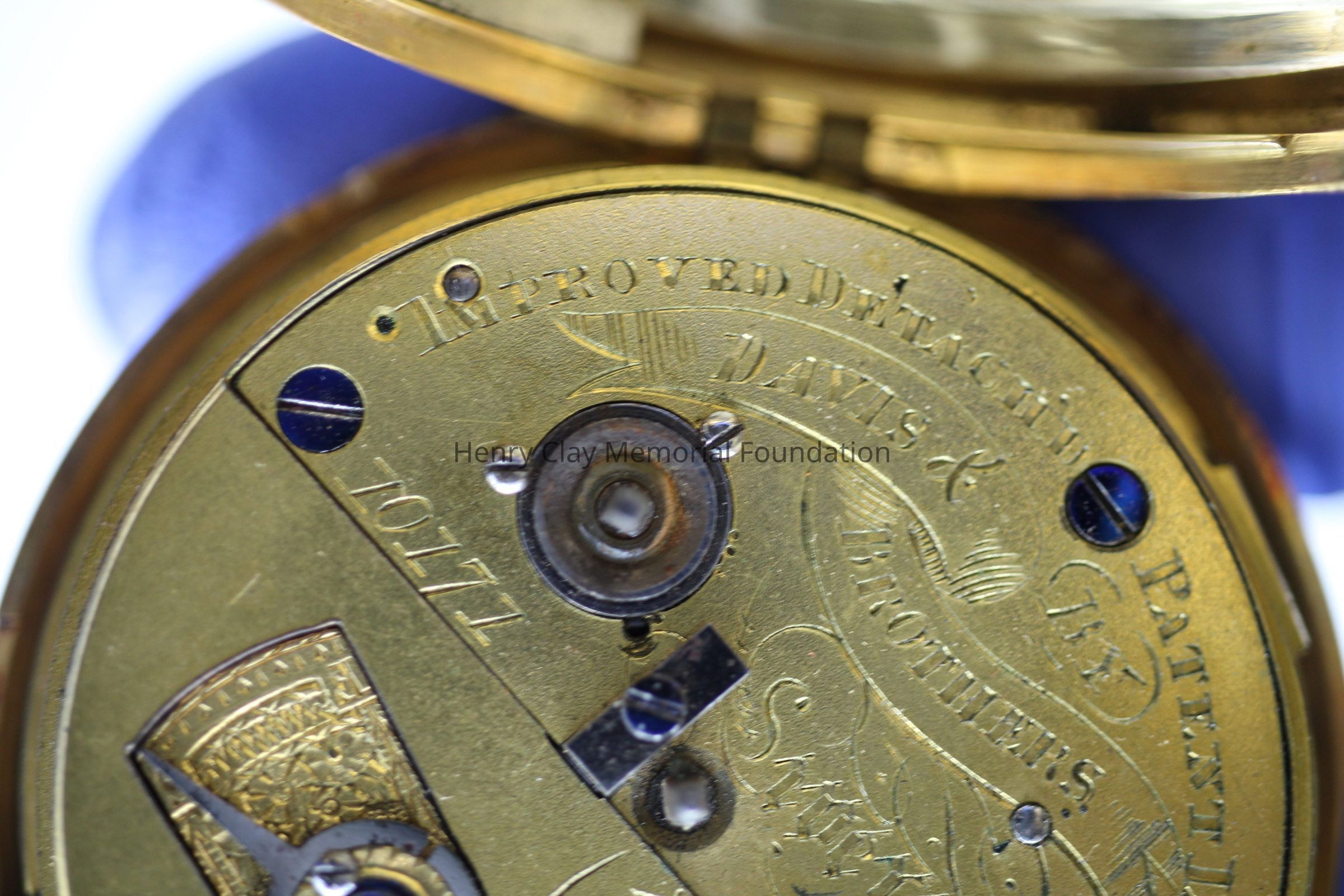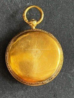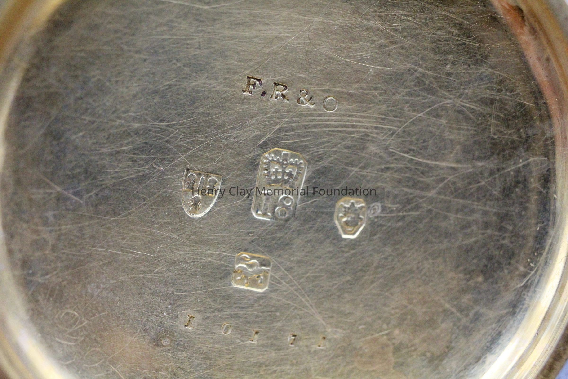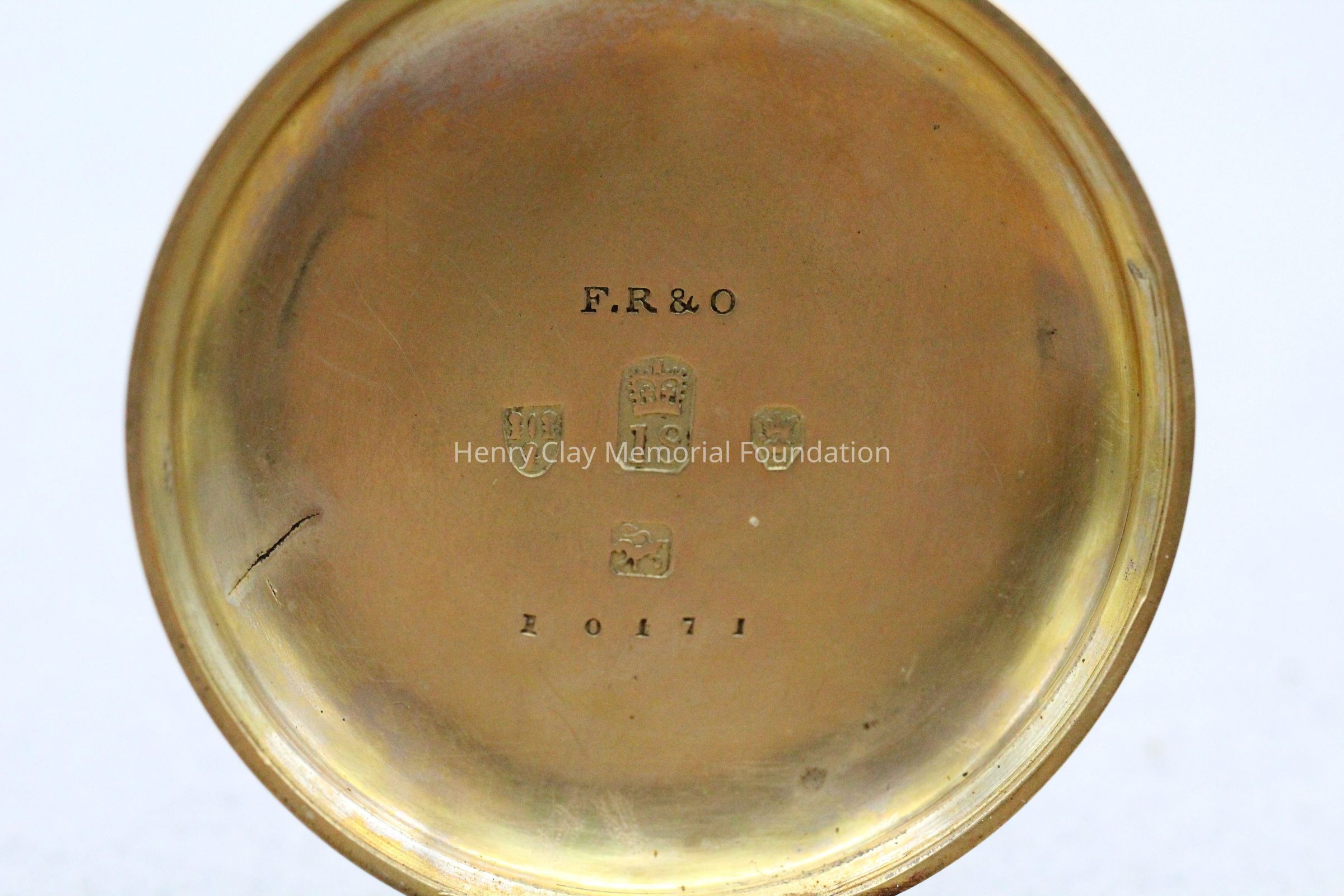 Gold ladies pocket watch. Has front and back case covers with worn circular engine turned designs overall. The stem has a gold ring and latch release to open the covers at the end. The edge of the watch and the stem are covered with floral designs. The face is gold with Roman numerals. it has a small seconds dial set into the main dial. There is a floral design around the outside that appears to be done with multicolored gold flowers and leaves. The inside of the face is done in a scale pattern. On the inside of the case lids are maker's marks and assay marks. They are a shield with three sheaves of wheat surrounding a sword, a crown over the number 18, a lion rampant, and a leopard with crown and the number 10171. The back of the watch contains two holes for key winding and is engraved, "Worn for 40 years by Lucretia Hart, wife of Henry Clay". The works are engraved "Improved deatched patenet lever by Davis & Brothers Liverpool 10171 Warrented".