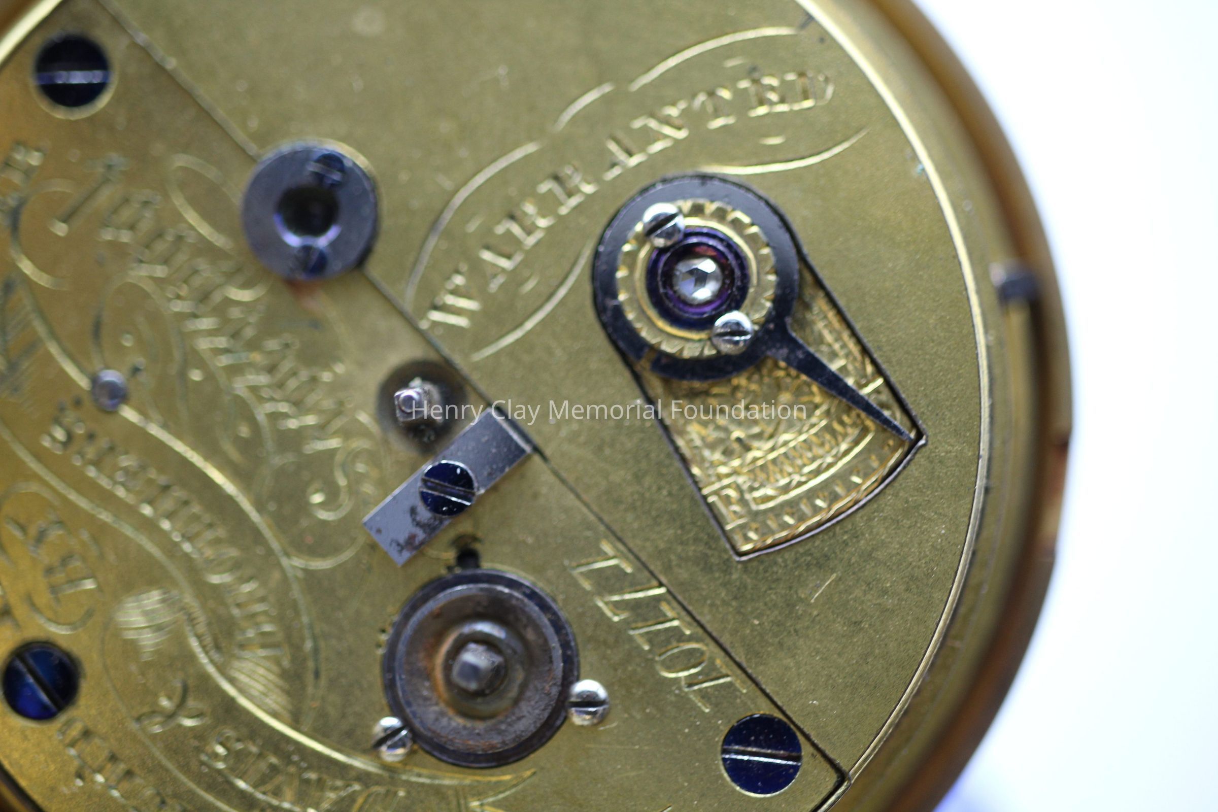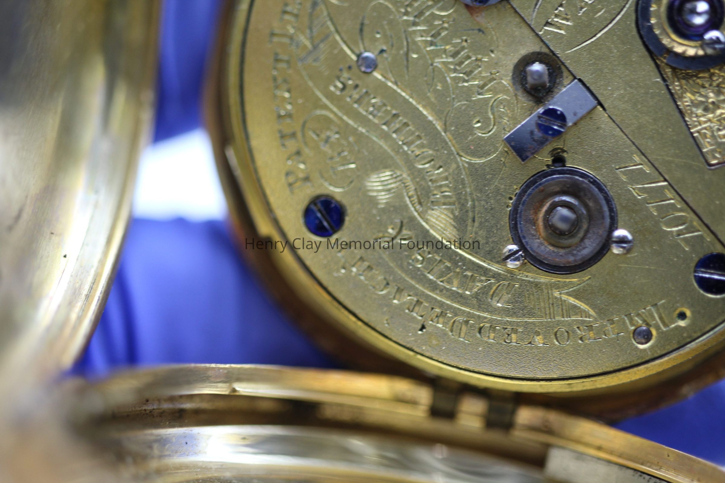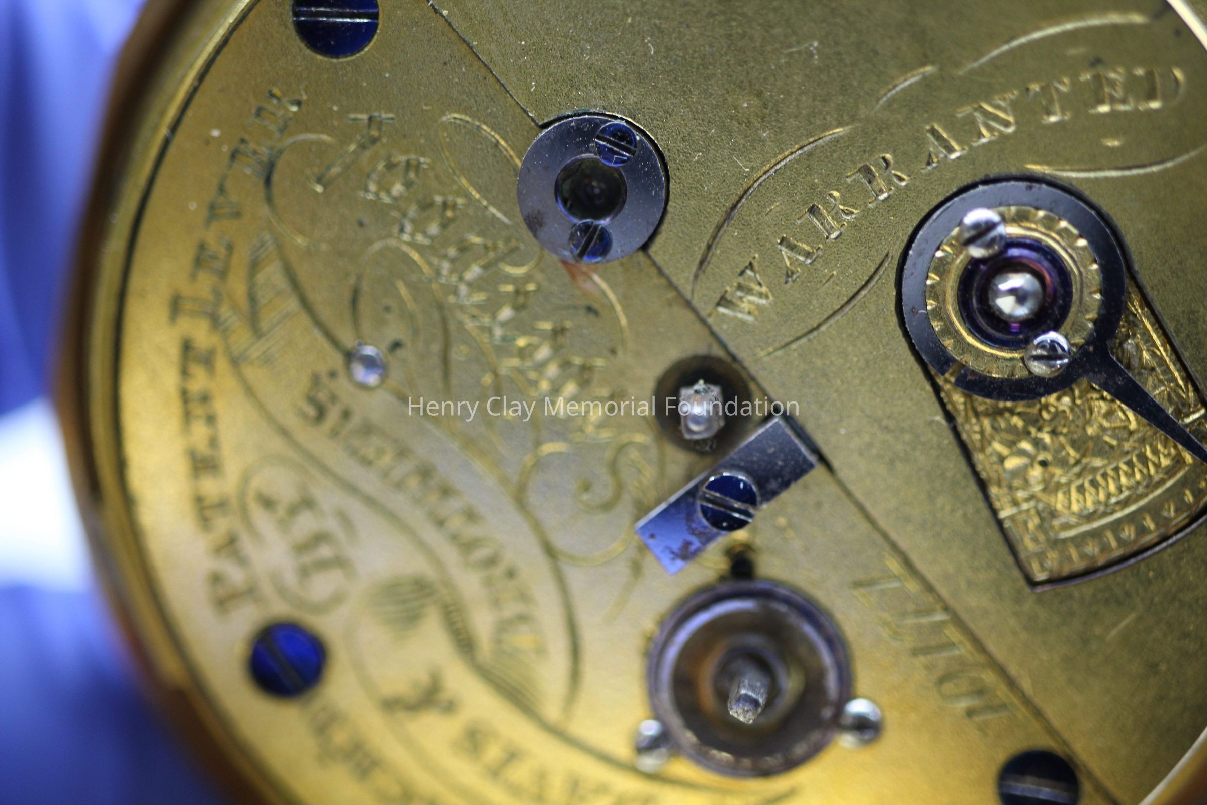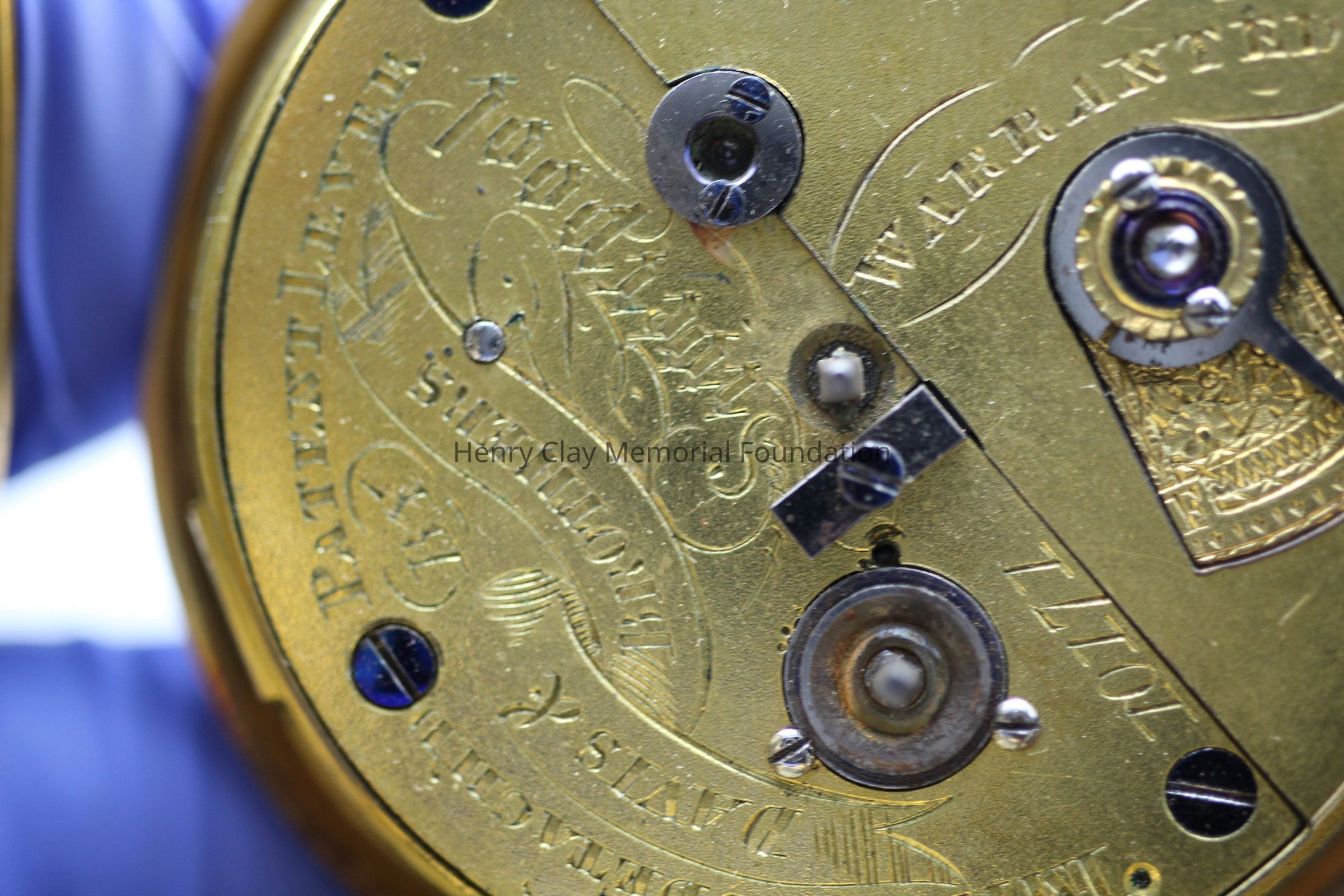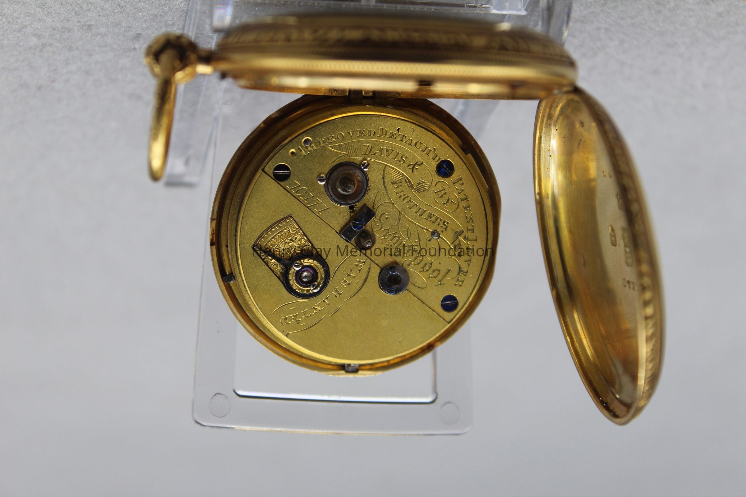 Gold ladies pocket watch. Has front and back case covers with worn circular engine turned designs overall. The stem has a gold ring and latch release to open the covers at the end. The edge of the watch and the stem are covered with floral designs. The face is gold with Roman numerals. it has a small seconds dial set into the main dial. There is a floral design around the outside that appears to be done with multicolored gold flowers and leaves. The inside of the face is done in a scale pattern. On the inside of the case lids are maker's marks and assay marks. They are a shield with three sheaves of wheat surrounding a sword, a crown over the number 18, a lion rampant, and a leopard with crown and the number 10171. The back of the watch contains two holes for key winding and is engraved, "Worn for 40 years by Lucretia Hart, wife of Henry Clay". The works are engraved "Improved deatched patenet lever by Davis & Brothers Liverpool 10171 Warrented".