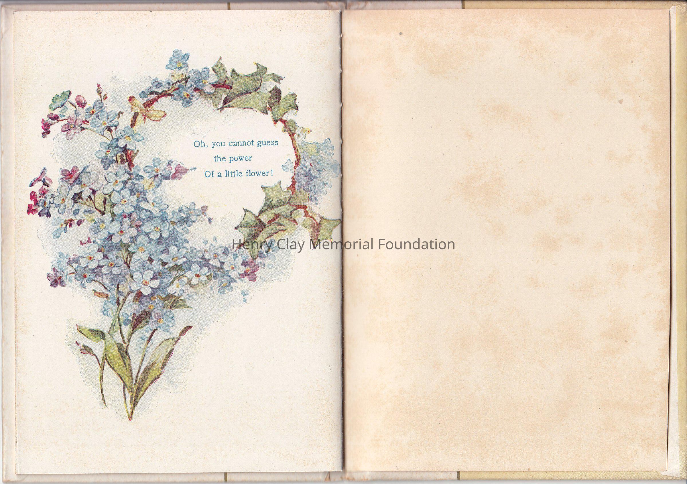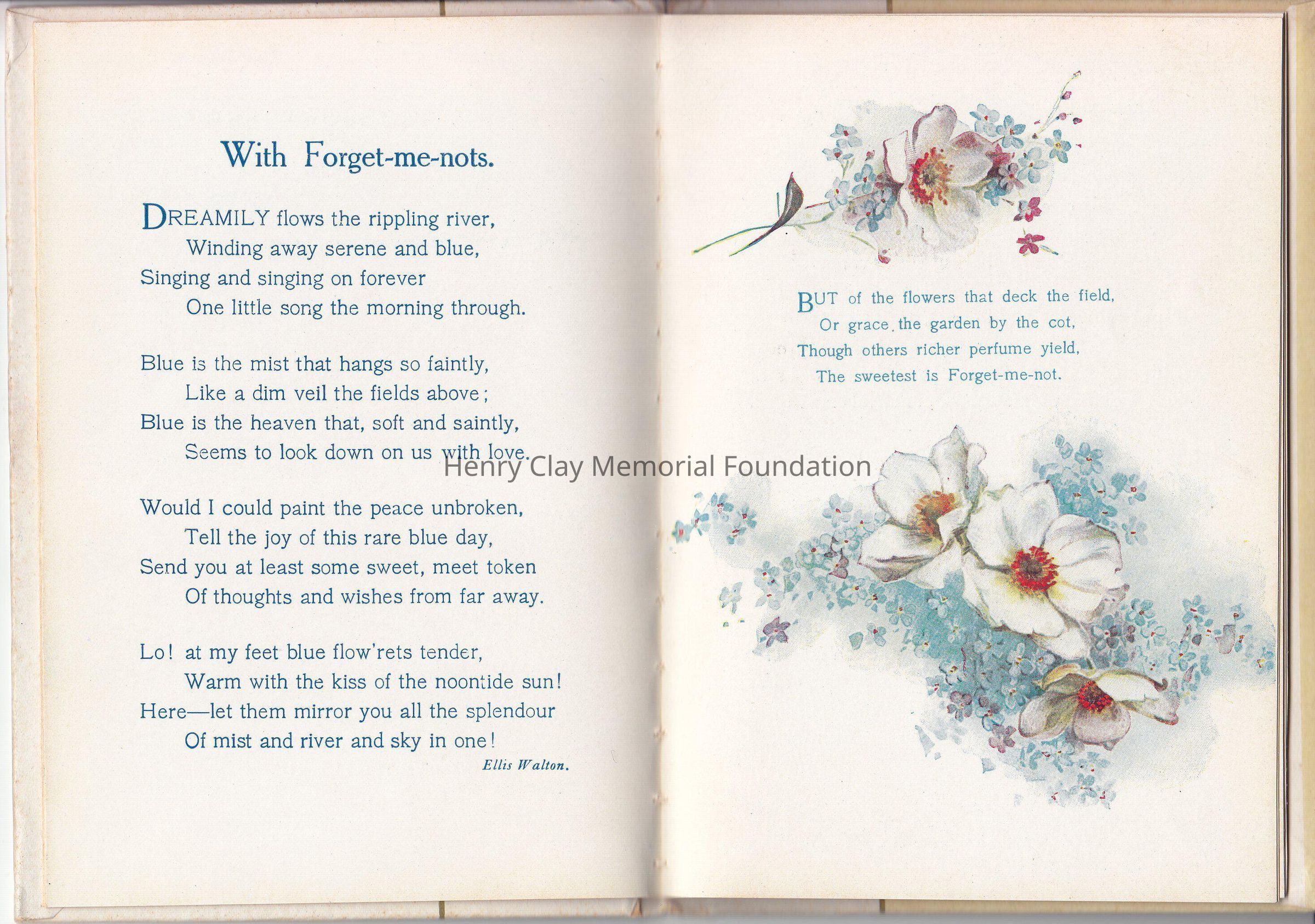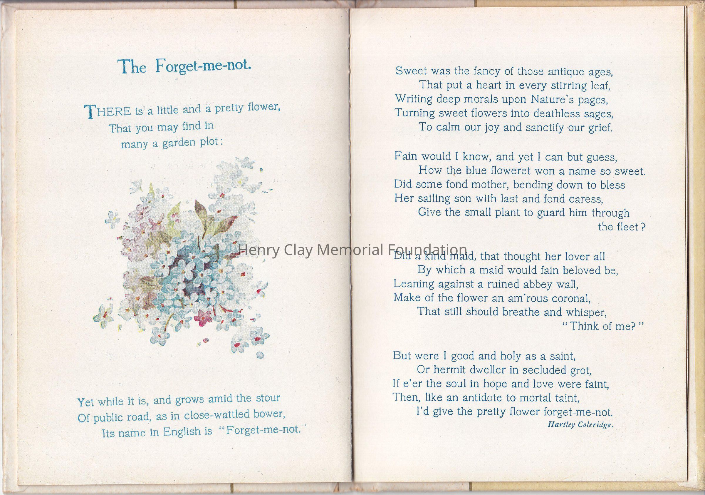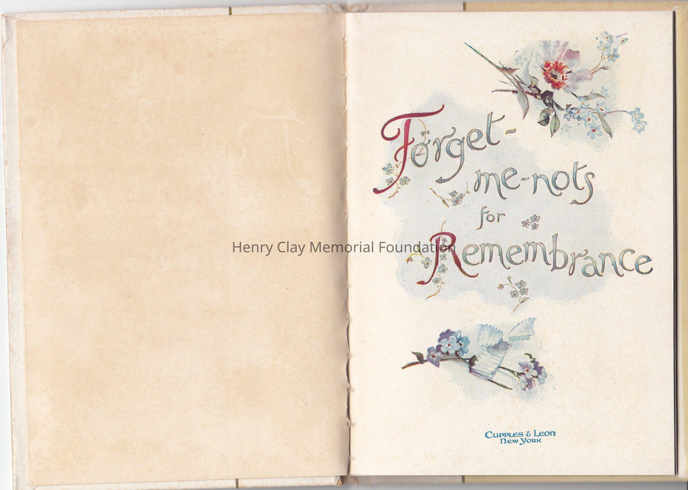 A small booklet of 15 pages, hardcover. The cover is marble like, with a gold straight line center left. A flower bouquet made of Forget-me-not is on the right side, "Forget-me-nots for remembrance" on the left side. Inside various poems created by various poets, decorated with colorful drawing of flowers. Editor is Cupples &Leon New York, as is written on the front page. It was a christmas present as it stated on the front page.