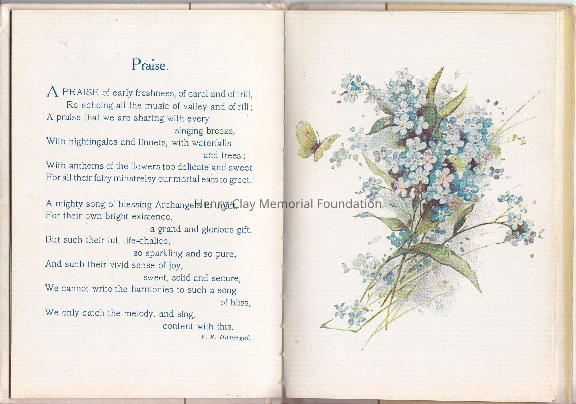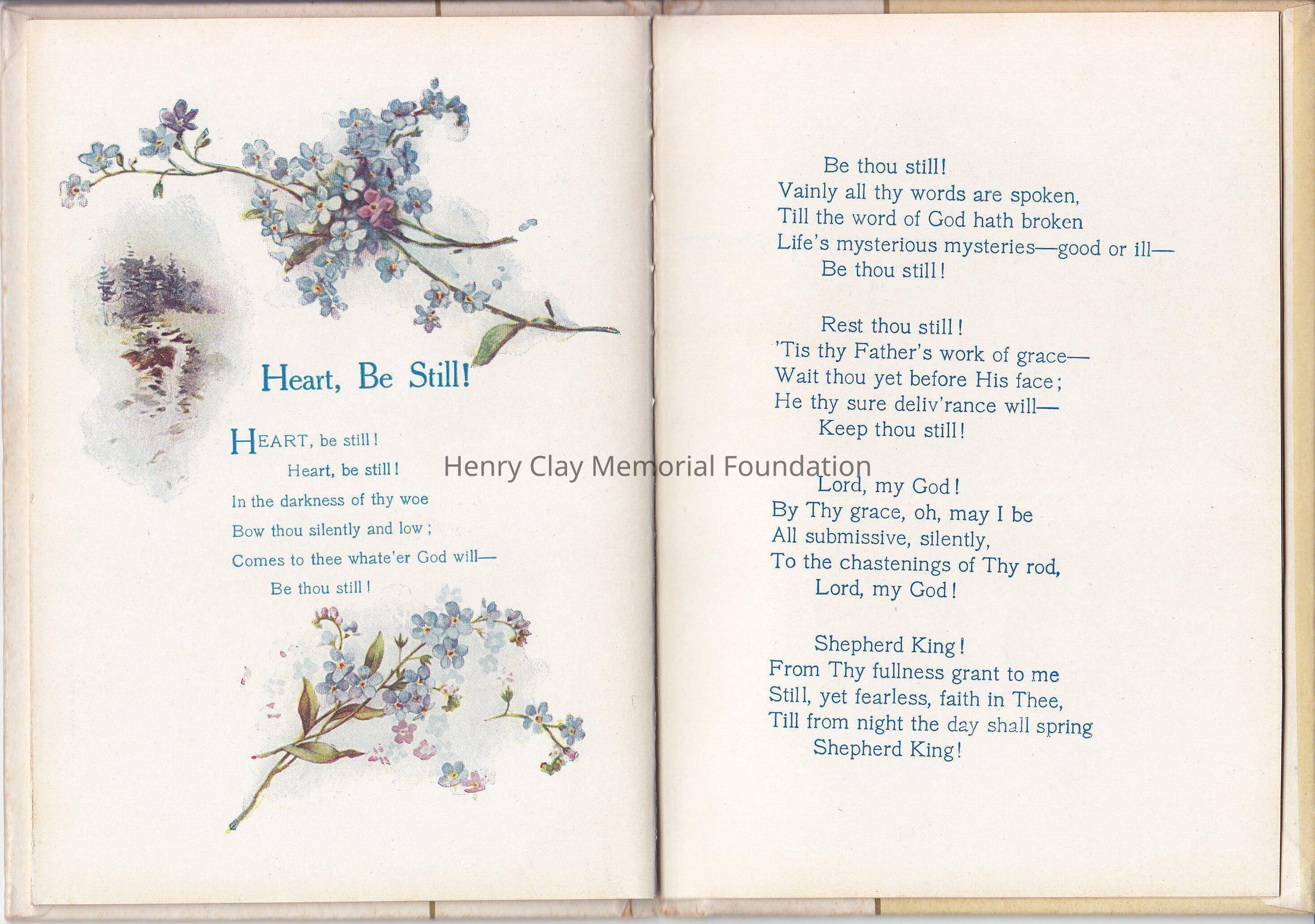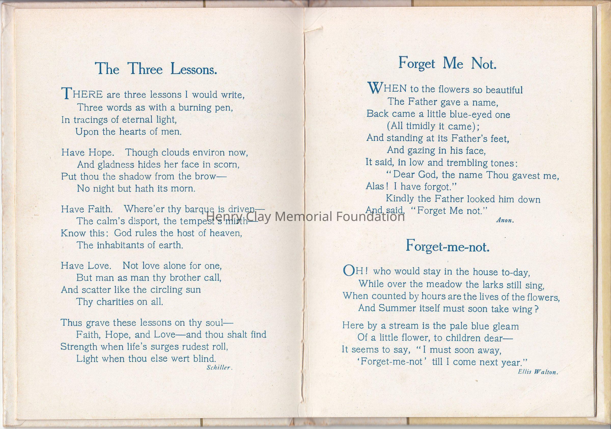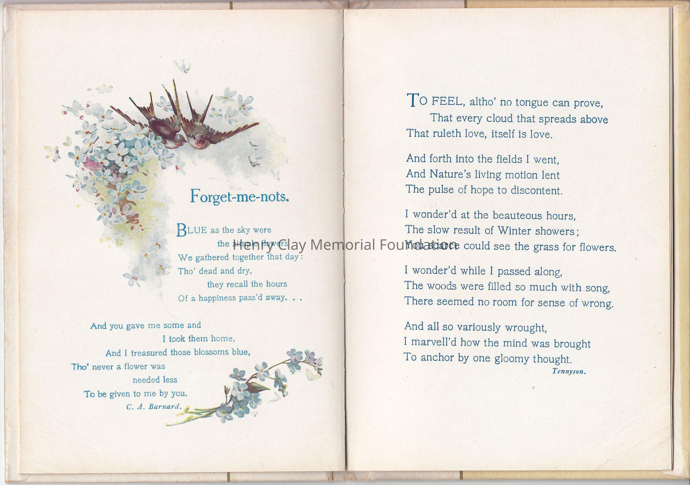 A small booklet of 15 pages, hardcover. The cover is marble like, with a gold straight line center left. A flower bouquet made of Forget-me-not is on the right side, "Forget-me-nots for remembrance" on the left side. Inside various poems created by various poets, decorated with colorful drawing of flowers. Editor is Cupples &Leon New York, as is written on the front page. It was a christmas present as it stated on the front page.