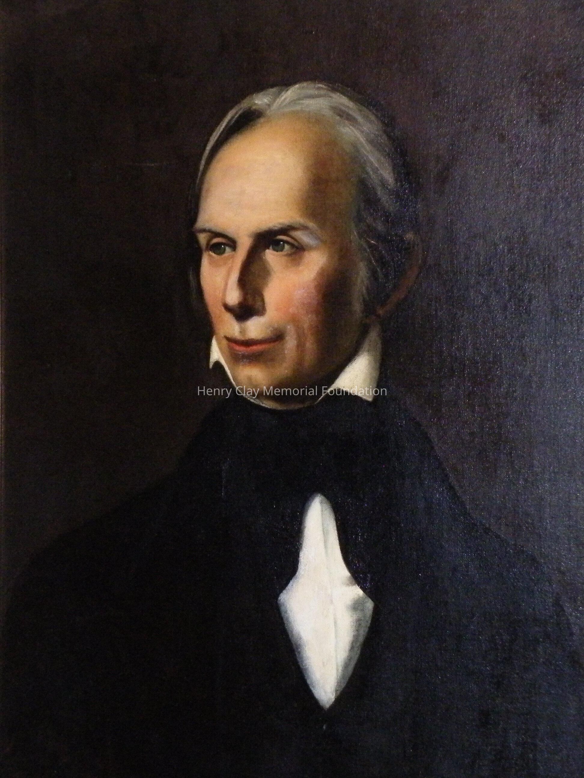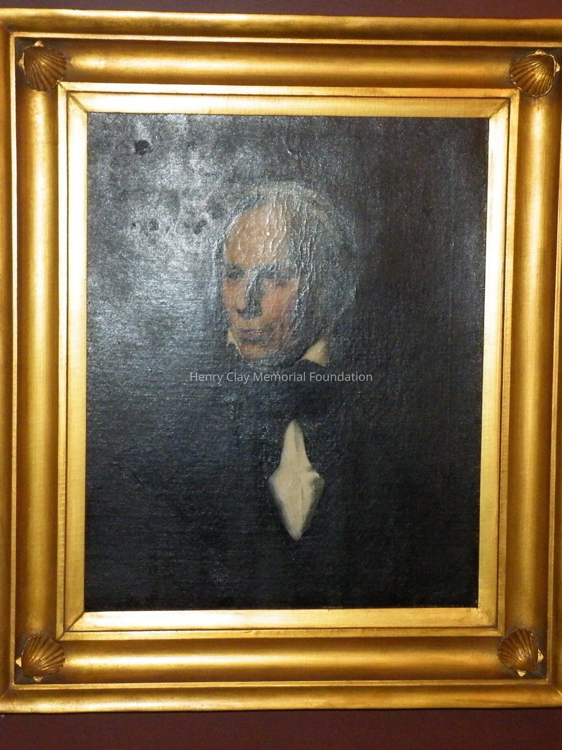 A portrait of Henry Clay in a gilt frame. The portrait is oil on canvas. The frame is fairly plain with shell ornaments at the corners. Henry Clay is in a black coat, white shirt, and black cravat.Dimensions